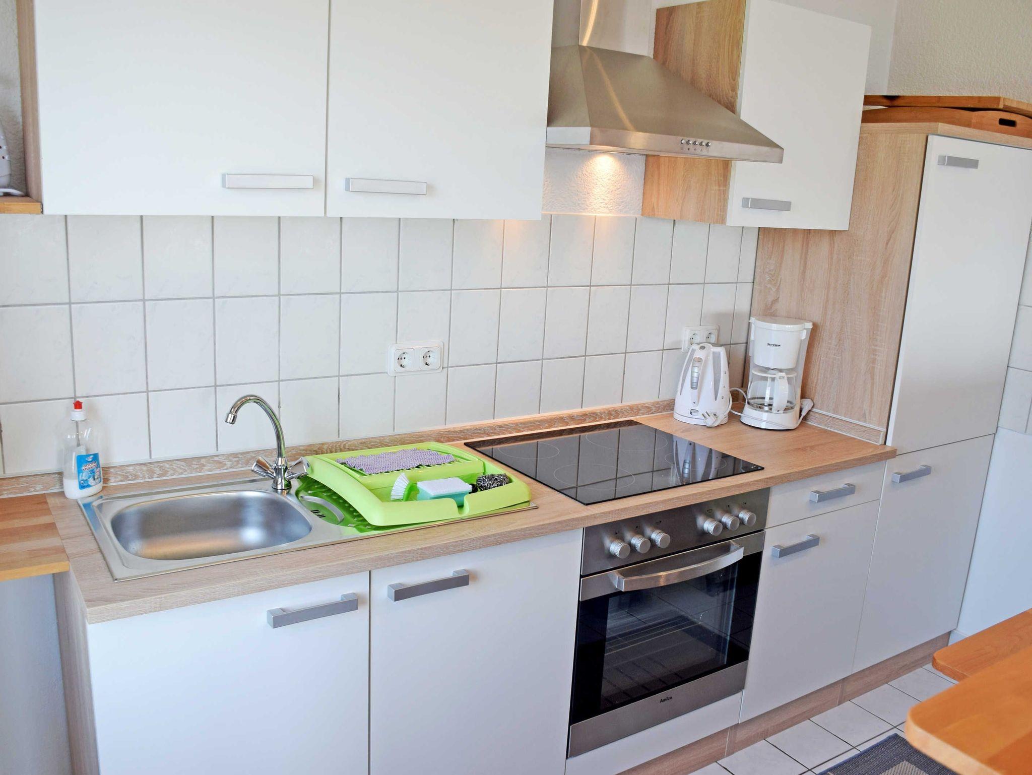 Im Wohnzimmer stehen eine Schalfcauch, Sessel und Tisch sowie und ein modernes Flachbild-TV-Gerät. Hier steht auch ein Esstisch mit Stühlen. Aus dem Wohnzimmer heraus hat man einen schönen Ausblick über den Sund nach Stralsund. Die Küchenzeile ist mit einem Herd, Backofen, Abzugshaube, Wasserkocher, Kaffeemaschine, Toaster und Kühlschrank mit Gefrierfach komplett ausgestattet.