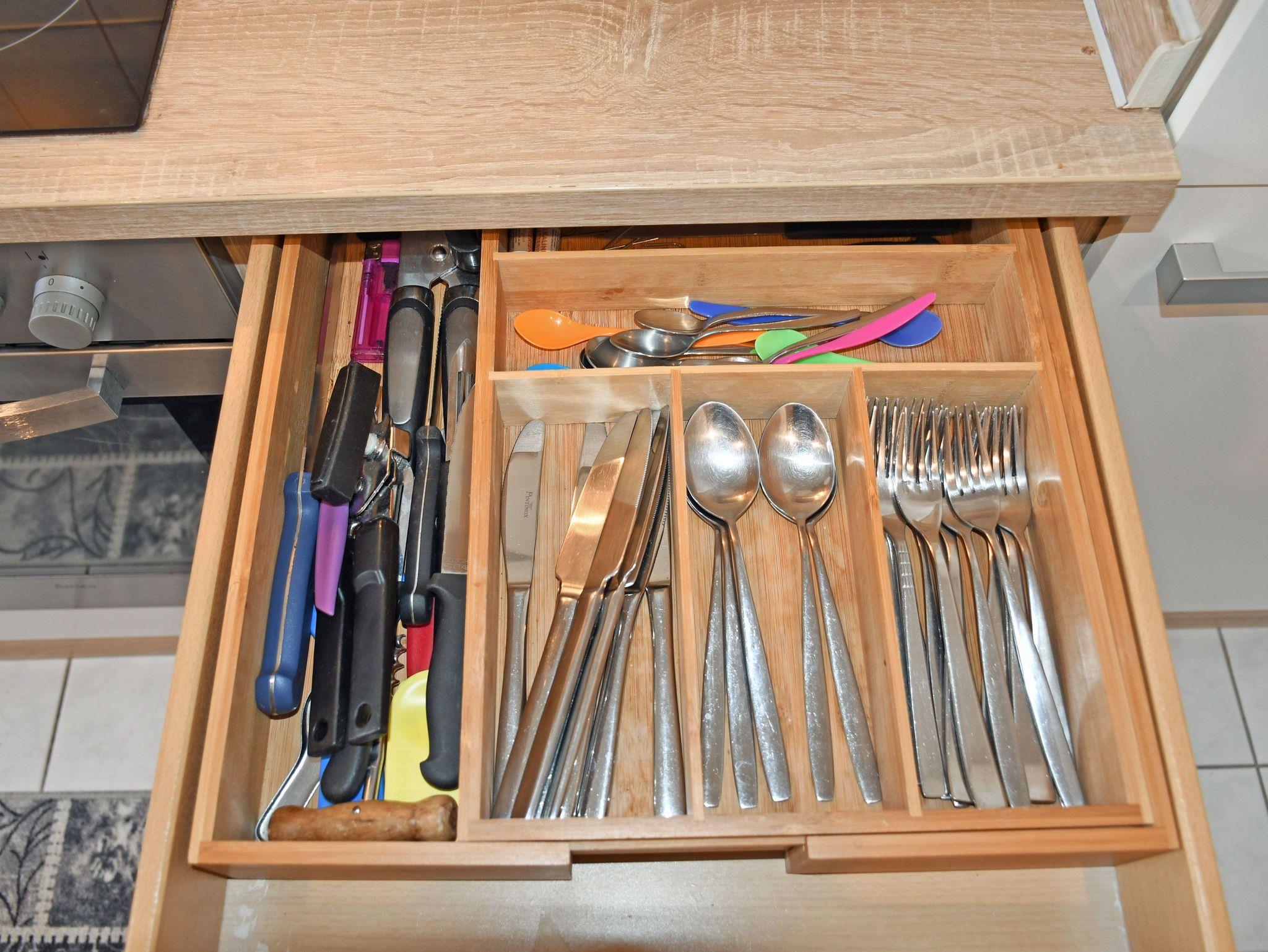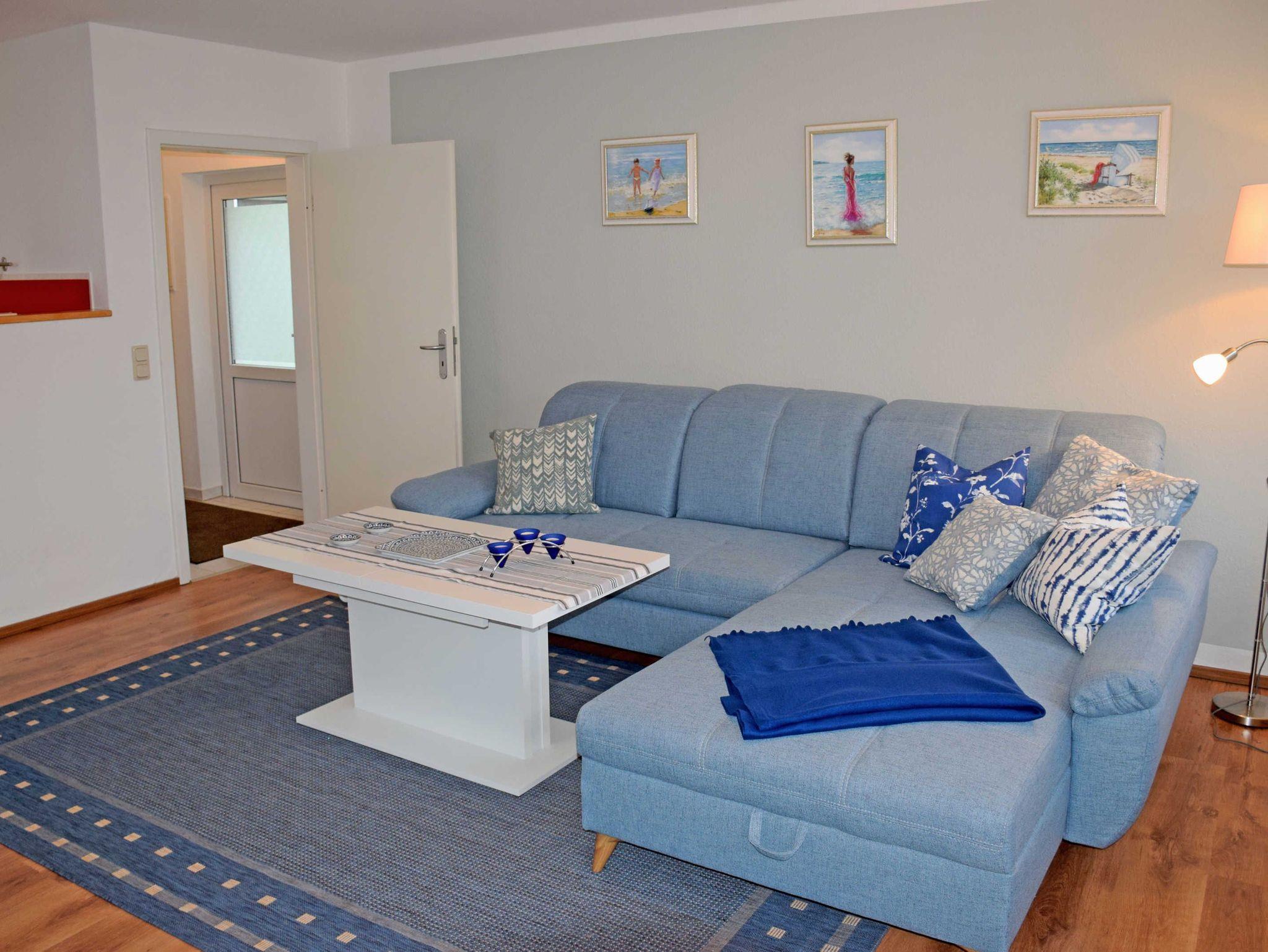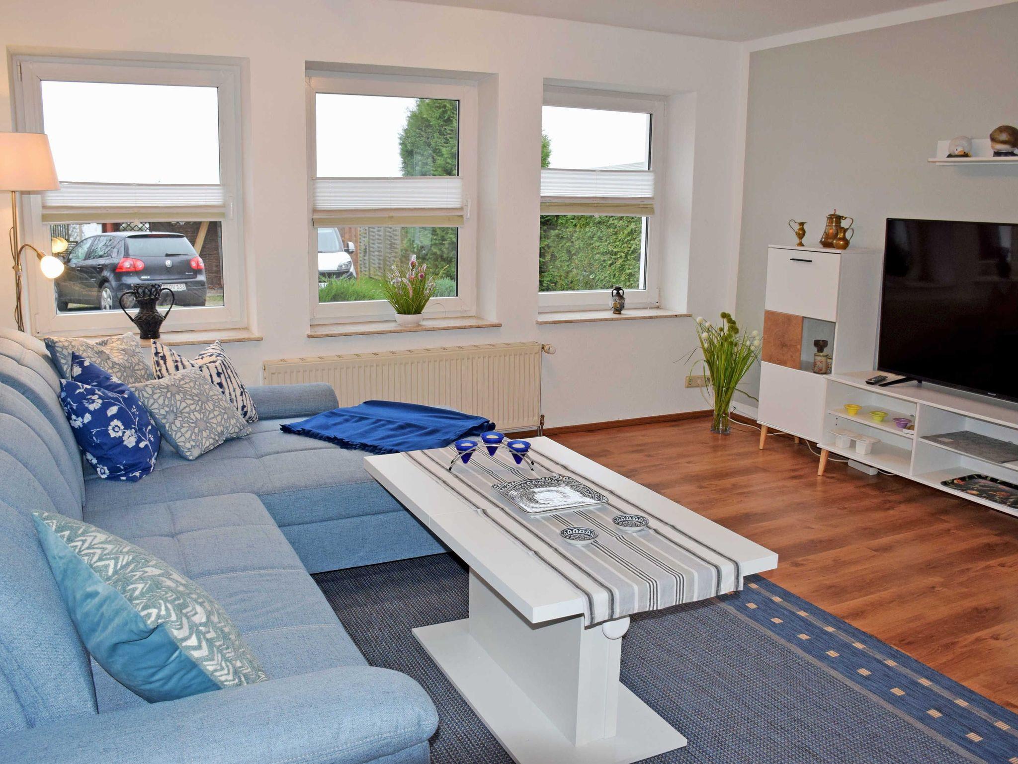 Im Wohnzimmer stehen eine Schalfcauch für die Aufbettung von zwei Gästen, Sessel und Tisch sowie und ein modernes Flachbild-TV-Gerät mit Netflix. Hier steht auch ein Esstisch mit Stühlen. Die Küchenzeile ist mit einem Herd, Backofen, Abzugshaube, Wasserkocher, Kaffeemaschine, Toaster und Kühlschrank mit Gefrierfach komplett ausgestattet.