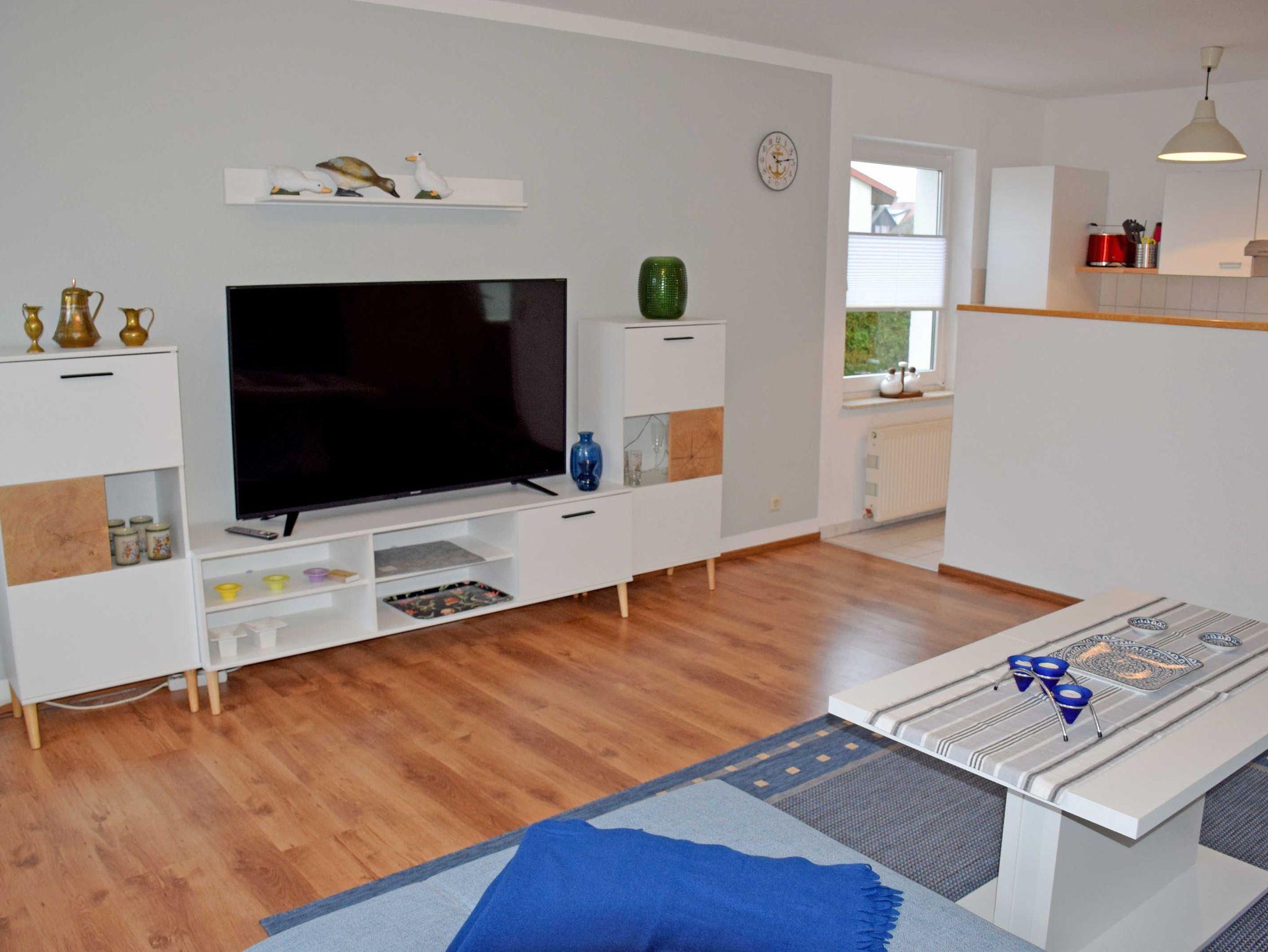 Im Wohnzimmer stehen eine Schlafcouch für die Aufbettung von zwei Gästen, Sessel und Tisch sowie ein modernes Flachbild-TV-Gerät. Hier steht auch ein Esstisch mit Stühlen. Die Küchenzeile ist mit einem Herd, Backofen, Abzugshaube, Wasserkocher, Kaffeemaschine, Toaster und Kühlschrank mit Gefrierfach komplett ausgestattet.