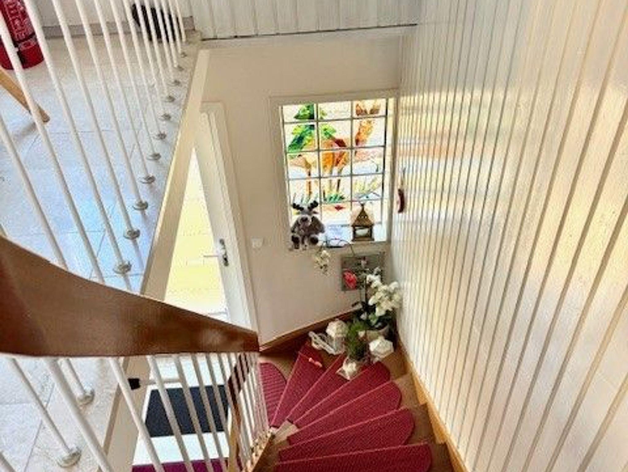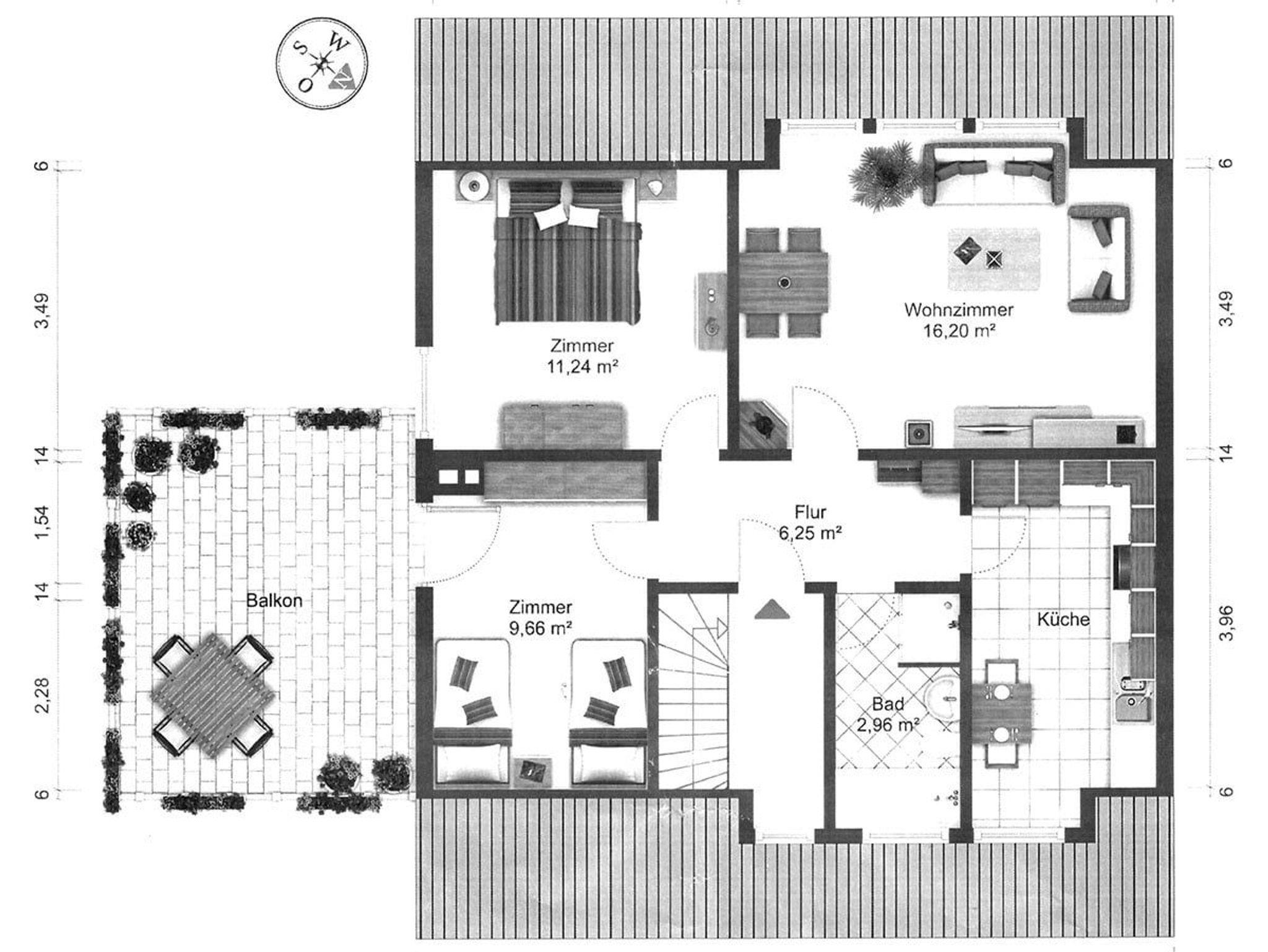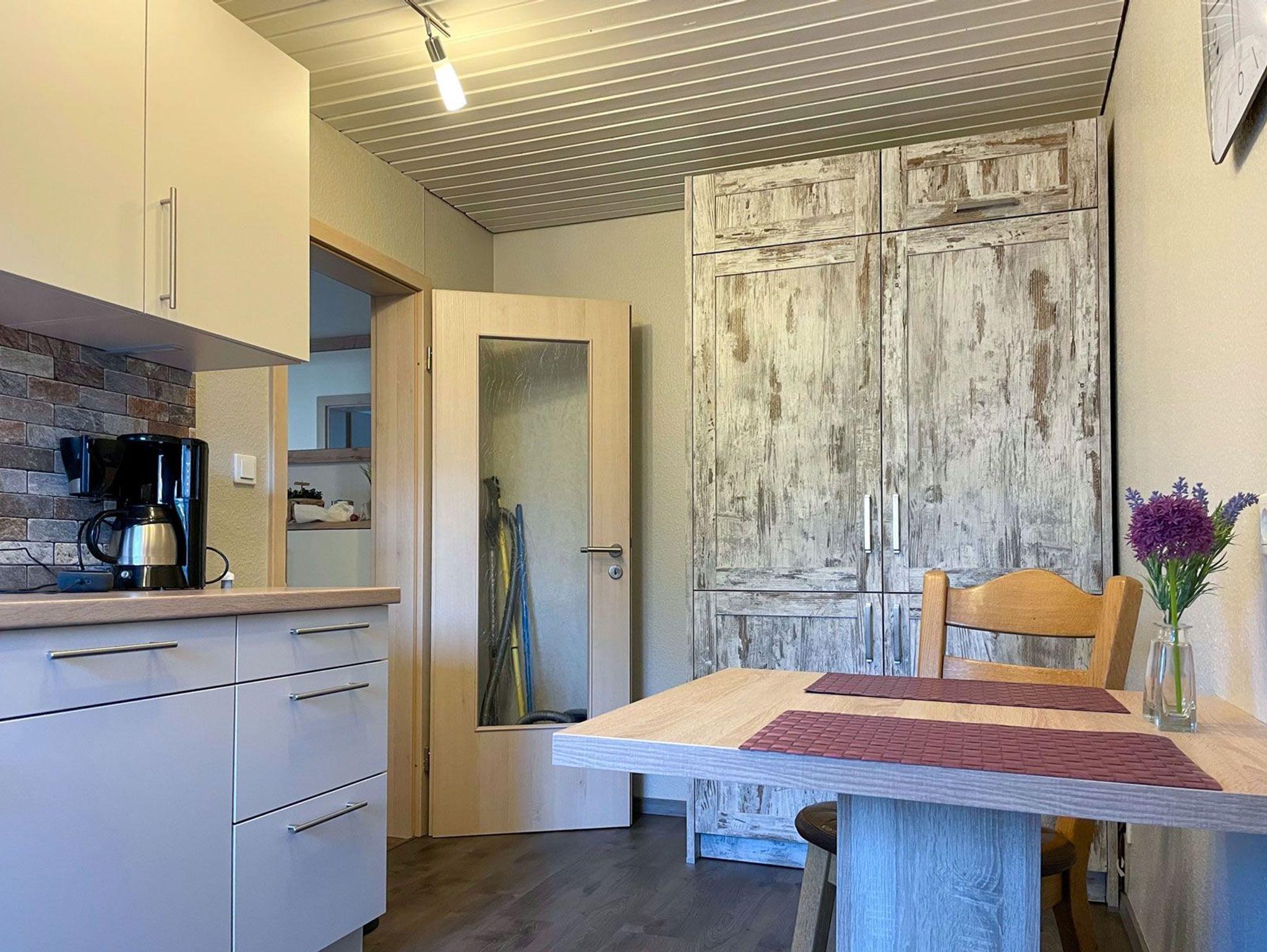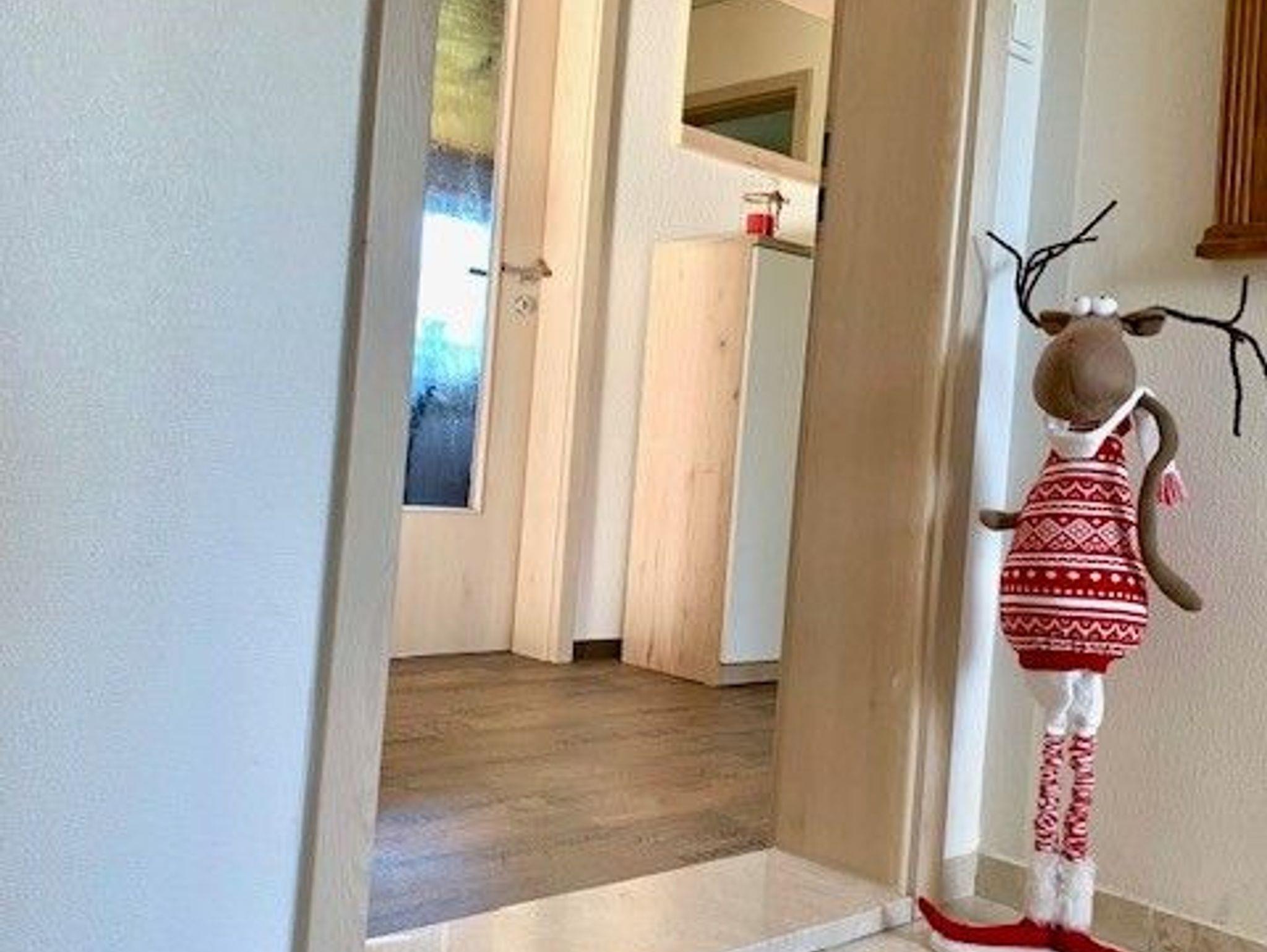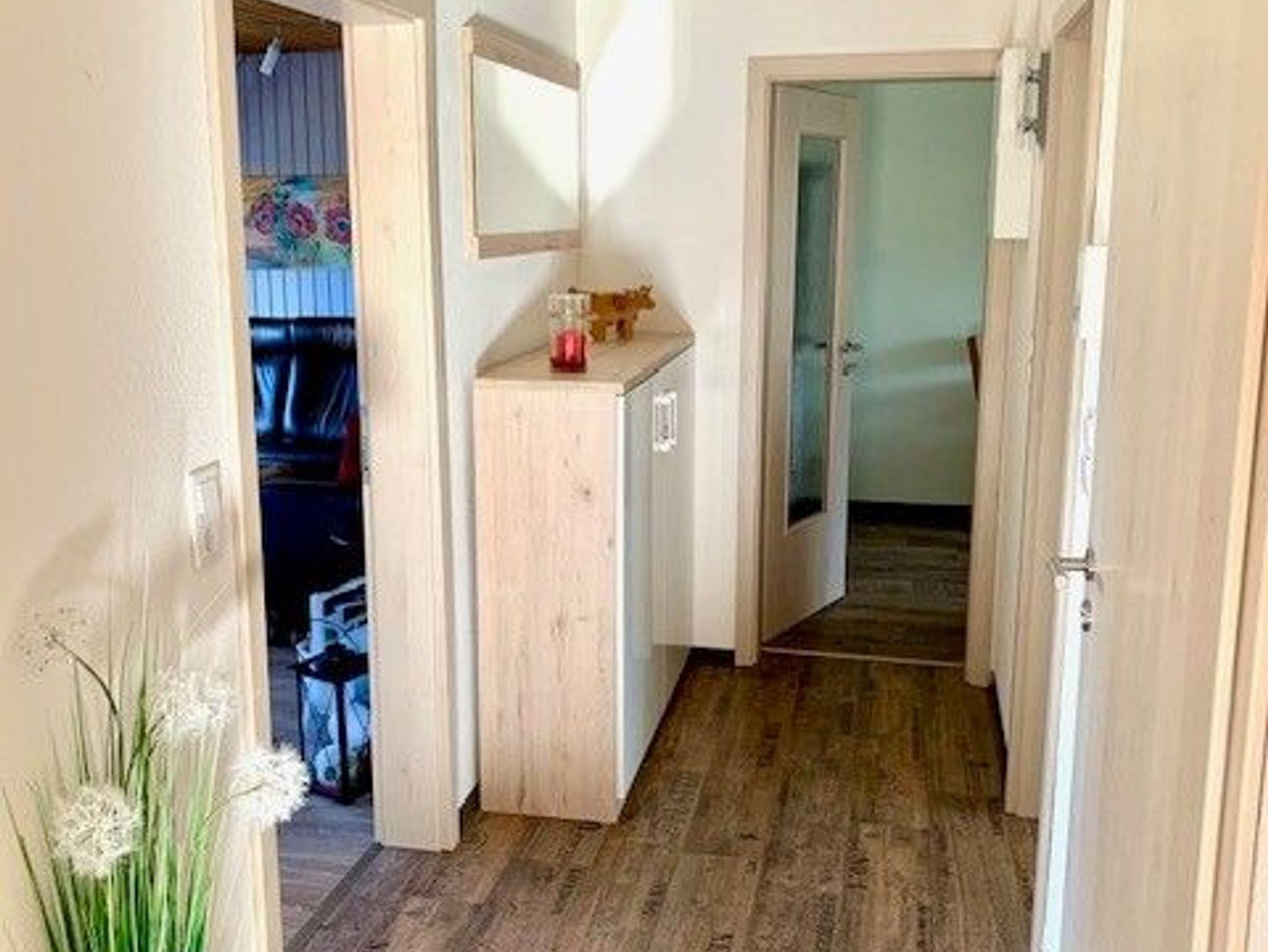 Nach dem Hauseingang, die Treppe hoch, ist der Eingang der Ferienwohnung. Die Wohnung ist ruhig gelegen, hat einen Balkon mit schönem Ausblick und ist ca. 60-70qm groß. In den Schlafzimmern befinden sich jeweils ein Doppelbett (2,00m x 1,80m) und zwei Einzelbetten (2,00mx0,90m). Die Küche ist gut ausgestattet und Im Wohnzimmer finden Sie ein Sofa, Smart-TV und eine Essecke.