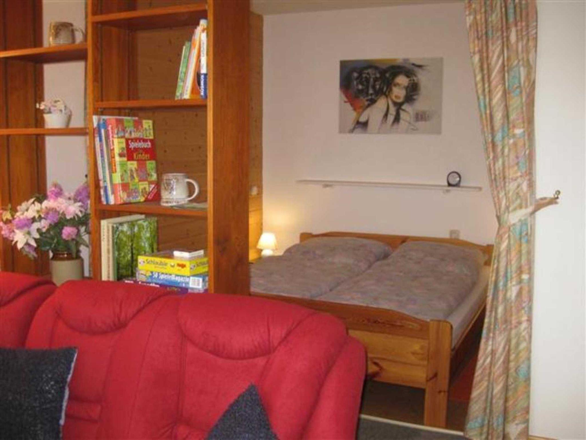Die Ferienwohnung liegt in der 2. Etage und ist über einen Aufzug zu erreichen.Die 45m² grosse Wohnung verfügt über ein Zimmer mit einem Schlaf-, Wohn-, Essbereich und einer Küchenzeile. Die Ausstattung der Küche beinhaltet unter anderem einen Herd, Kühlschrank, Wasserkocher, Toaster, Kaffeemaschine und ausreichend Geschirr. Im Wohnbereich befindet sich eine gemütliche Sitzecke mit Schlaffunktion, die für Aufbettung genutzt werden kann. Ein Radio, Farbfernseher, Wecker usw. sind ebenso vorhanden, wie verschiedene Spiele für jung und alt. Der Schlafbereich mit einem Doppelbett, wird durch einen Raumteiler und einen Vorhang vom Wohnbereich abgetrennt. Die Morgensonne lädt zum Frühstücken auf dem Balkon ein. Eine Abschließbare Ski-Box, und ein Schlitten sind im Keller vorhanden. Bettwäsche und Handtücher müssen mitgebracht werden, oder man kann diese mitbuchen.