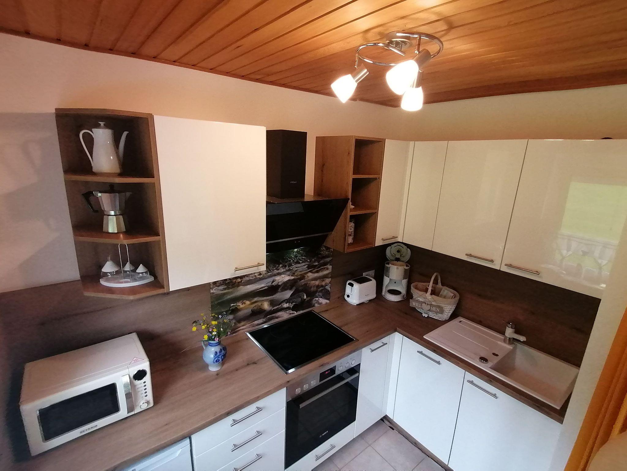 Die Ausstattung der Ferienwohnung Kleine Hexe ist gemütlich und zweckmäßig. Die Küche verfügt über einen Backofen, Herdplatten, eine Kaffeemaschine, einen Wasserkocher, eine Spüle, einen Toaster sowie auch eine Dolce Gusto Kaffemaschine. Das Bad ist mit WC, Dusche und Waschbecken ausgestattet außerdem ist ein Haarfön und ein Spiegelschrank vorhanden. Im Wohnbereich befindet sich ein Flachbildfernseher mit SAT-TV, eine gemütliche Essecke sowie auch ein Radio und eine gemütliche Sitzecke mit einem Schlafsofa. Vom Wohnbereich kommt man auf die nach Süden ausgerichtete Terasse. Das Schlafzimmer mit Doppelbett und großem Spiegelschrank ist durch einen Vorhang vom Wohnbereich getrennt. Das Kinderzimmer bzw. Zweibettzimmer ist mit einer Tür vom Wohnbereich getrennt. Weiterhin beinhaltet die Ferienwohnung einen Hochstuhl und ein Babyreisebett für die kleinen Gäste.