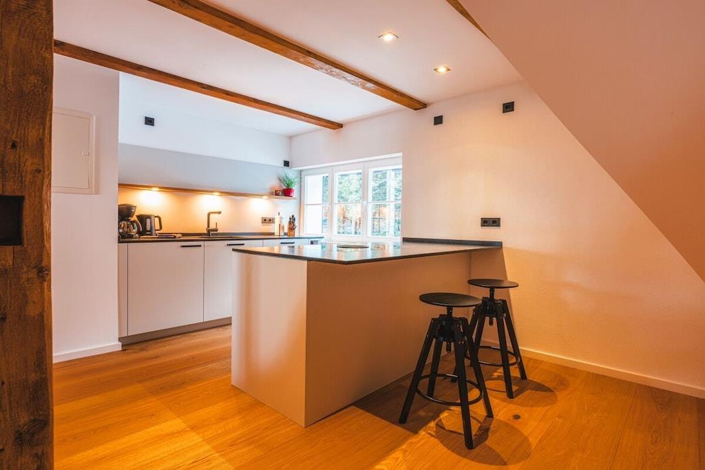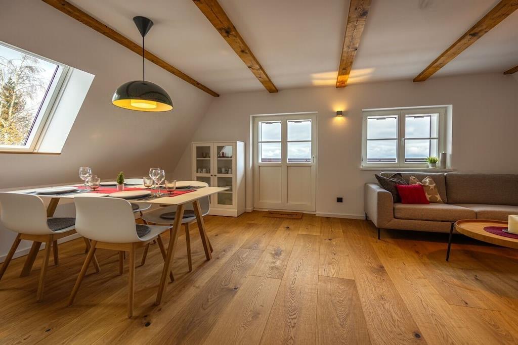 In unserem Maissonetteappartement kannst du auf 85m² mit bis zu 4 Personen durchatmen und einfach sein. Von zwei Balkonen genießt du den Weitblick bis ins Elbsandsteingebirge. Starte deinen Tag mit einer Tasse Kaffee auf dem Balkon und genieße den Sonnenaufgang über dem Erzgebirgskamm. In der großzügigen Küche findest du alles für gemeinsame Kochabende um danach vorm knisternden Kaminfeuer zu entspannen. Mach es Dir in der Loungeecke gemütlich und genieße den Ausblick auf einen klaren Sternenhimmel. Die beiden Schlafzimmer im Dachspitz sind nicht nur romantisch sondern bieten dir auch einen traumhaften Ausblick in den Wald oder die Ferne.