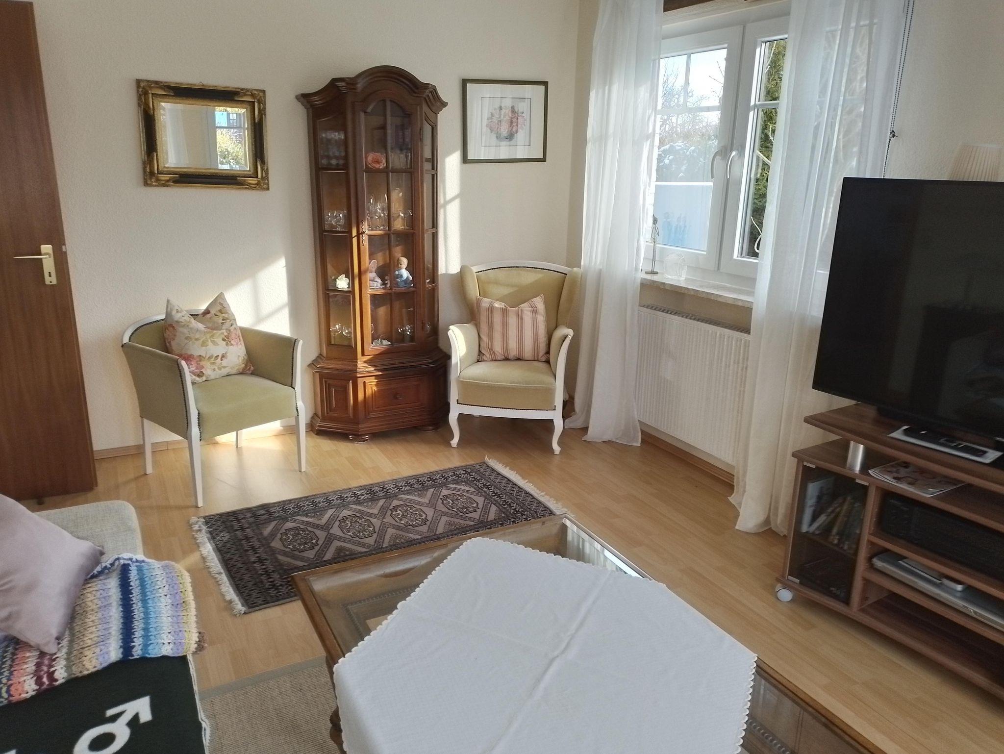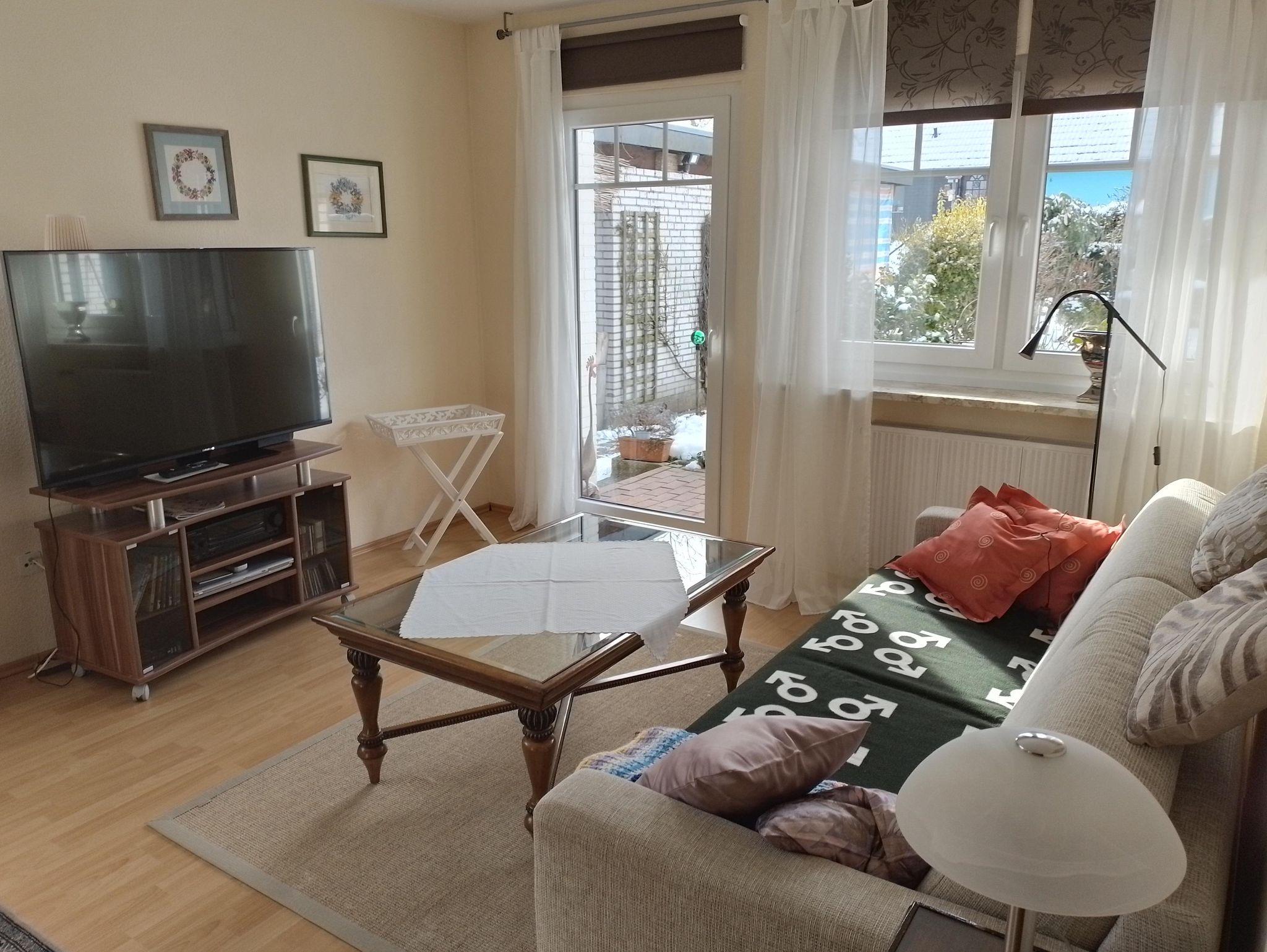 Das Wohnzimmer ist folgendermaßen ausgestattet: CO²-und Rauchmelder, Terrassentür auf ebener Erde, eine Couch, die zur Schlafcouch (2x2 m) umgerüstet werden kann , Sat-TV Flachbildschirm mit Netflix-Programm, 110 cm, Kennwood Stereo-Receiver, DVD/ CD-Player, diverse Spielfilme und Musik-CD's, Brett und Kartenspiele, Leselektüre und Fachliteratur über Schleswig-Holstein u.v.m. Auf der Doppelbettcouch haben 2 Personen ausreichend Platz.