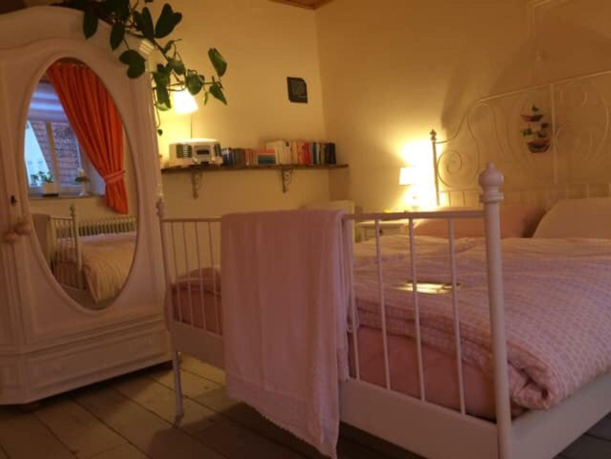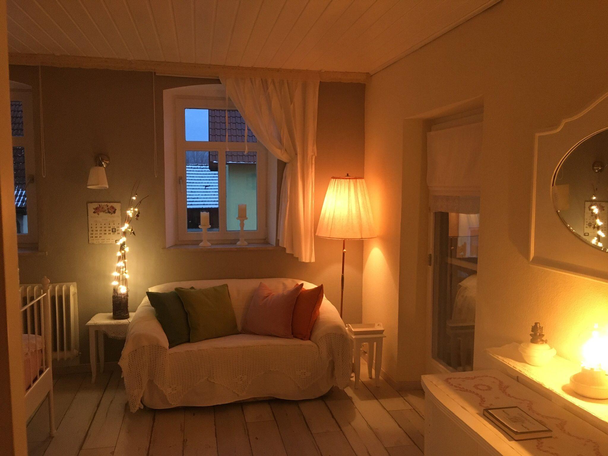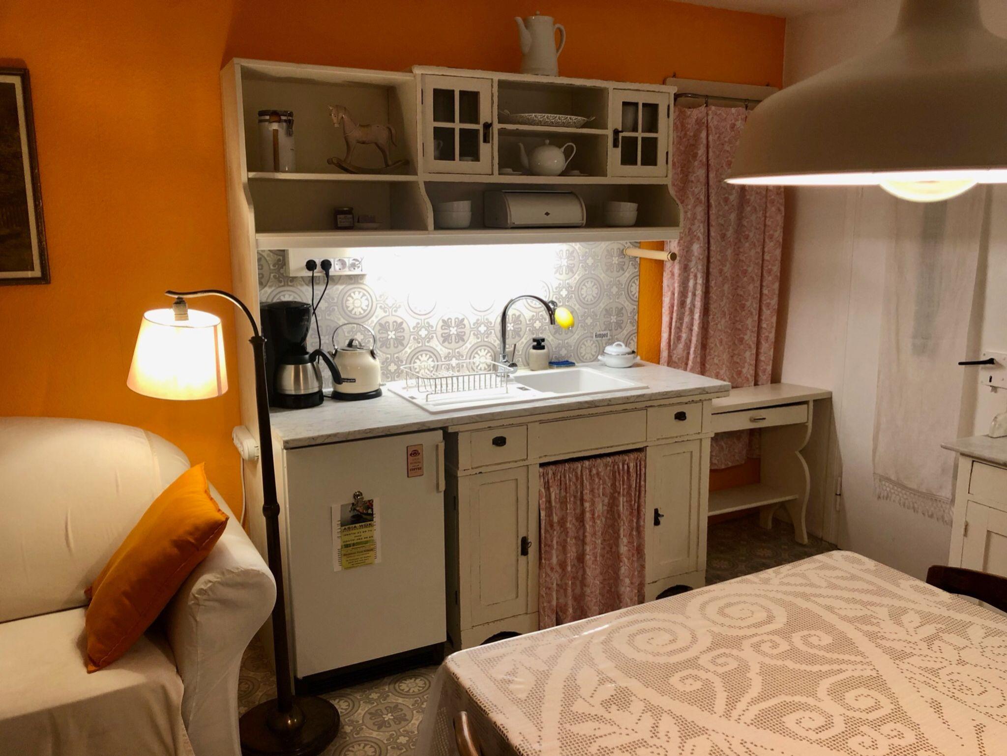 Ferienwohnung No 1 – Ideal für Paare, aber auch für eine besondere Zeit Alleine. Die kleine Wohnung wurde sorgsam und auch mit Orignalen der Gründerzeit eingerichtet. Hier ist Zeit zu Verweilen oder auch ein Ort, an den man gerne zurückkommen kann nach einem ereignisreichen Tag. Im Schlaf-Wohnbereich erwartet Sie ein komfortables Queensizebett mit Traumheldmatratzen, außerdem eine Leseecke und ein Sofa, alles mit romantischen Lichtquellen. In der Wohnküche wurde die Küchenzeile stilgerecht selbst angefertigt und bietet alles für die Selbstverpflegung. Am großzügigen antiken Tisch und auch einem zweiten Sofa lässt es sich wunderbar lesen, spielen, Filme ansehen ... auf einer Bank aus Samt die Füße hochlegen nach einem schönen Ausflug oder einer Wanderung ... eine Küche zum Kochen, Träumen und Leben mit Blick in den Garten des Hauses. Das Bad mit Dusche und WC ist einen Schritt über den Flur erreichbar und steht ausschließlich Ihnen zur Verfügung. Es wurde im März 2025 erneut renoviert und verwöhnt nun in den Farben Weiß mit Schmelz und Rosa mit Marshmellow. Die No 1 ist perfekt für einen erholsamen Aufenthalt in besonderer und behaglicher Atmosphäre!