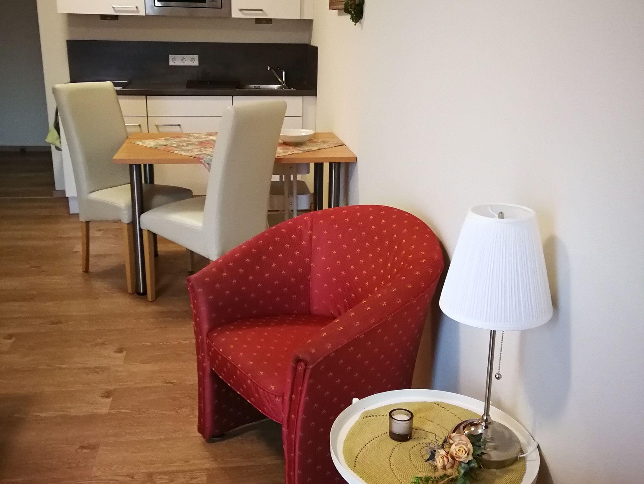 Es steht Ihnen eine gut ausgestattete Küchenzeile mit 2er Ceranfeld, Spüle, Mikrowelle, Kaffemaschine,Wasserkocher, und Kühlschrank zur Verfügung. Ein Esstisch,zwei Stühle und eine Leseecke sind vorhanden. Das Doppelbett ist als Einzelbetten nutzbar. Bitte bei Buchung angeben wie sie es wünschen. Das Badezimmer ist mit Dusche und WC eingerichtet.