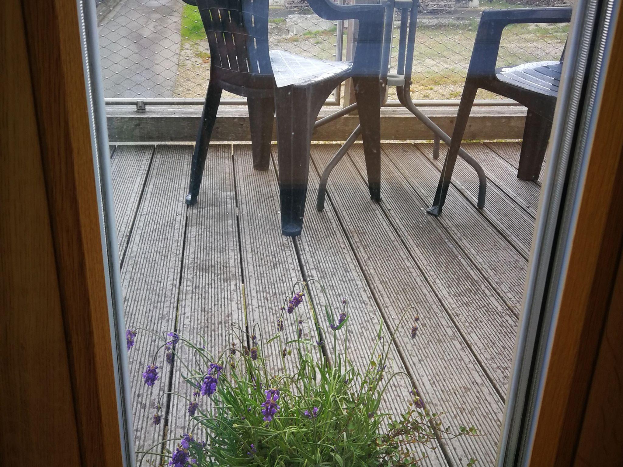 Der Balkon ist durch die große Glastür erreichbar, gartenseitig mit Morgensonne und Sitzgelegenheit.