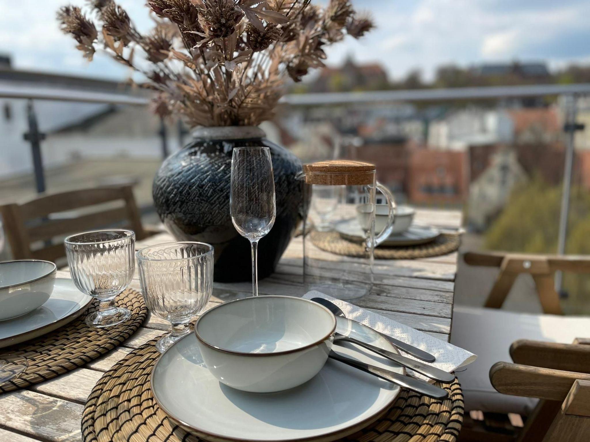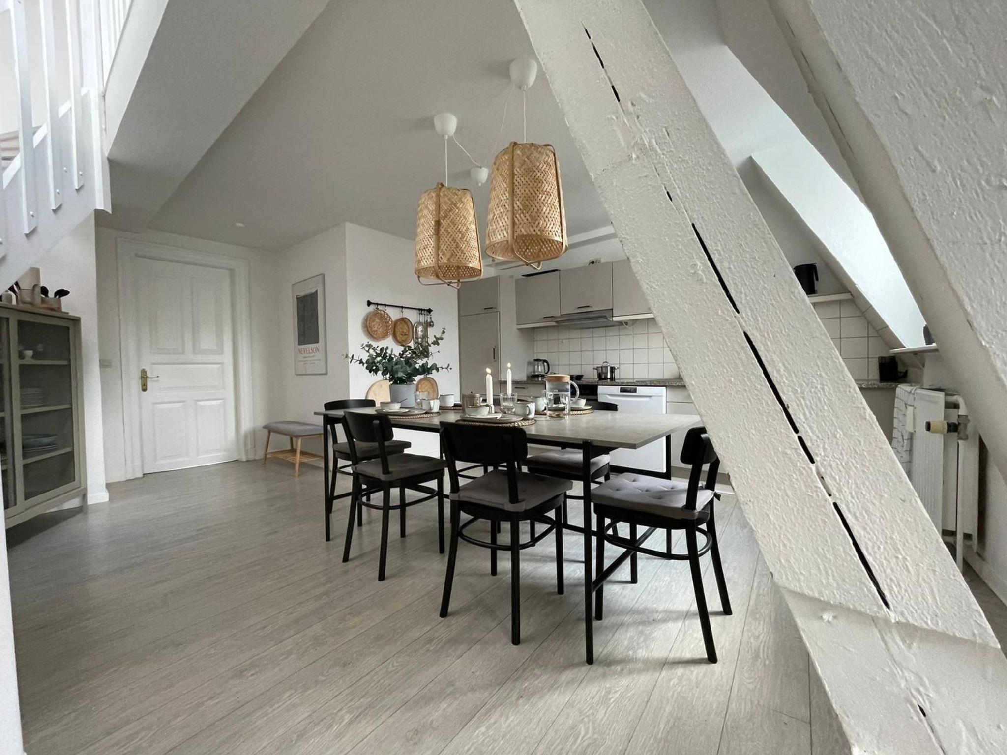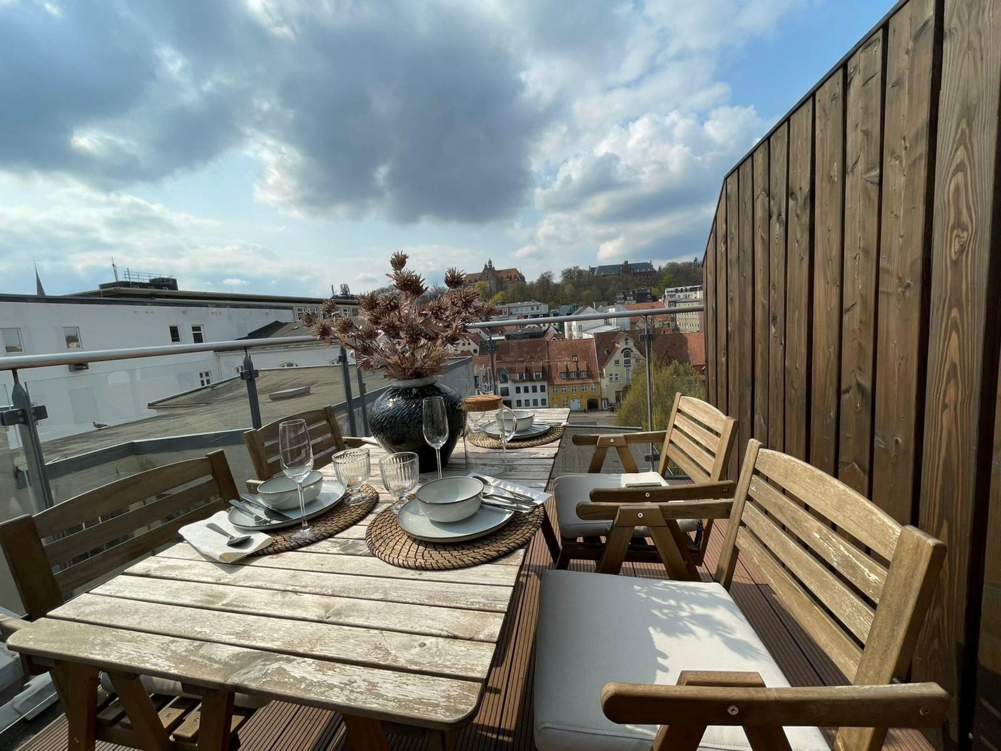 Beautifully located directly at the harbour tip, this old building flat furnished in a maritime style over 2 floors offers an unforgettable view over the old town, up to the Museumsberg and the sails of the harbour. On the lower level, the flat offers a living room, bathroom with marble fittings and a fully equipped open-plan kitchen. On the second floor, there are two separate bedrooms that can accommodate 4 people and a roof terrace with a beautiful view over the rooftops of the old town of Flensburg.
