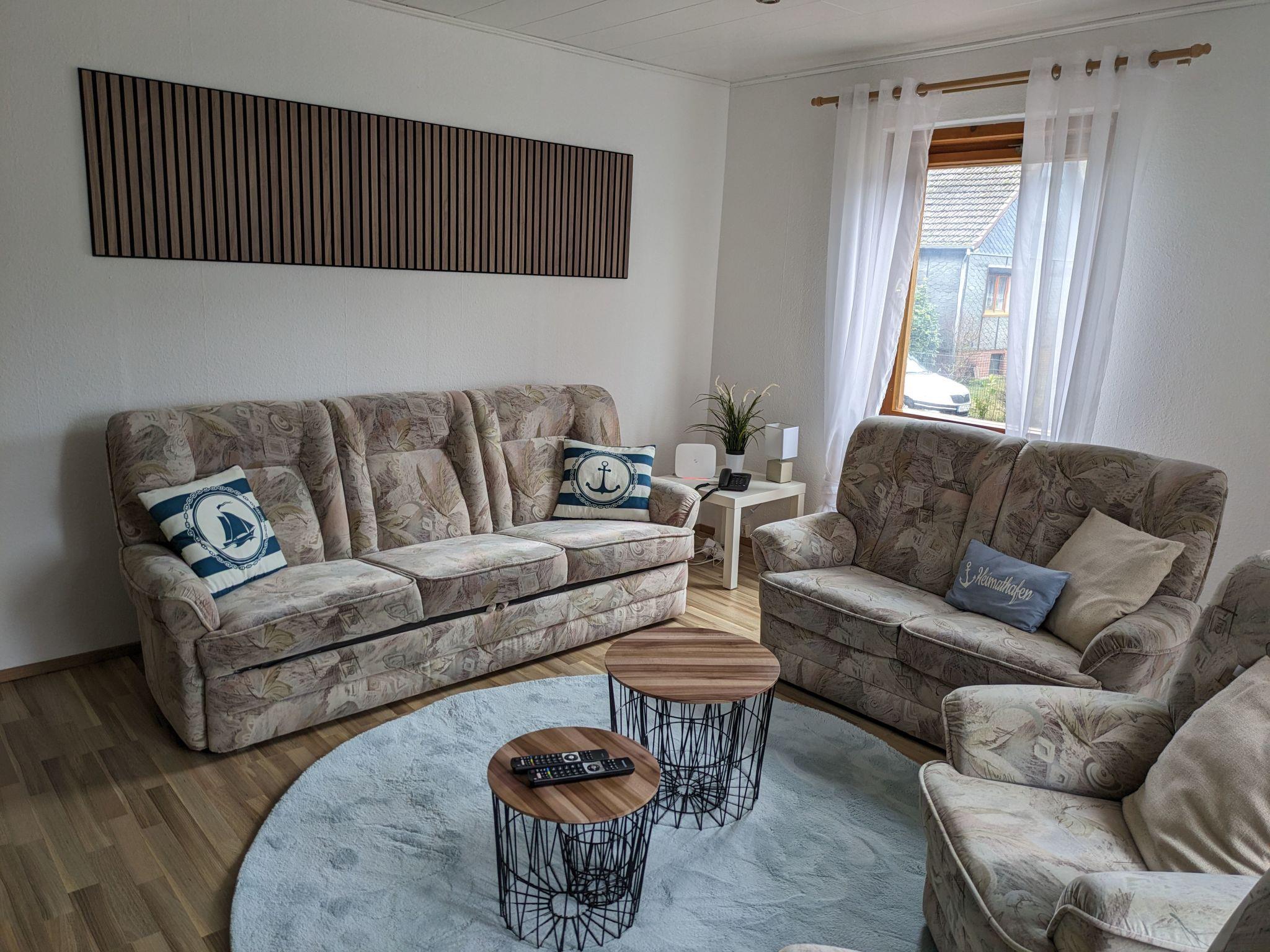 Inside this non-smoking house, cosy and well-equipped rooms await you. A complete interior with three bedrooms, each with a large wardrobe, offers enough privacy and comfort for the whole family. The living room invites you to linger with a 3-seater sofa, two 2-seater sofas, two armchairs and a TV. The kitchen is ideally equipped for self-catering and an additional small bathroom, including washing machine, is conveniently located in the converted basement area, to which a small staircase (room-saving staircase) leads down.