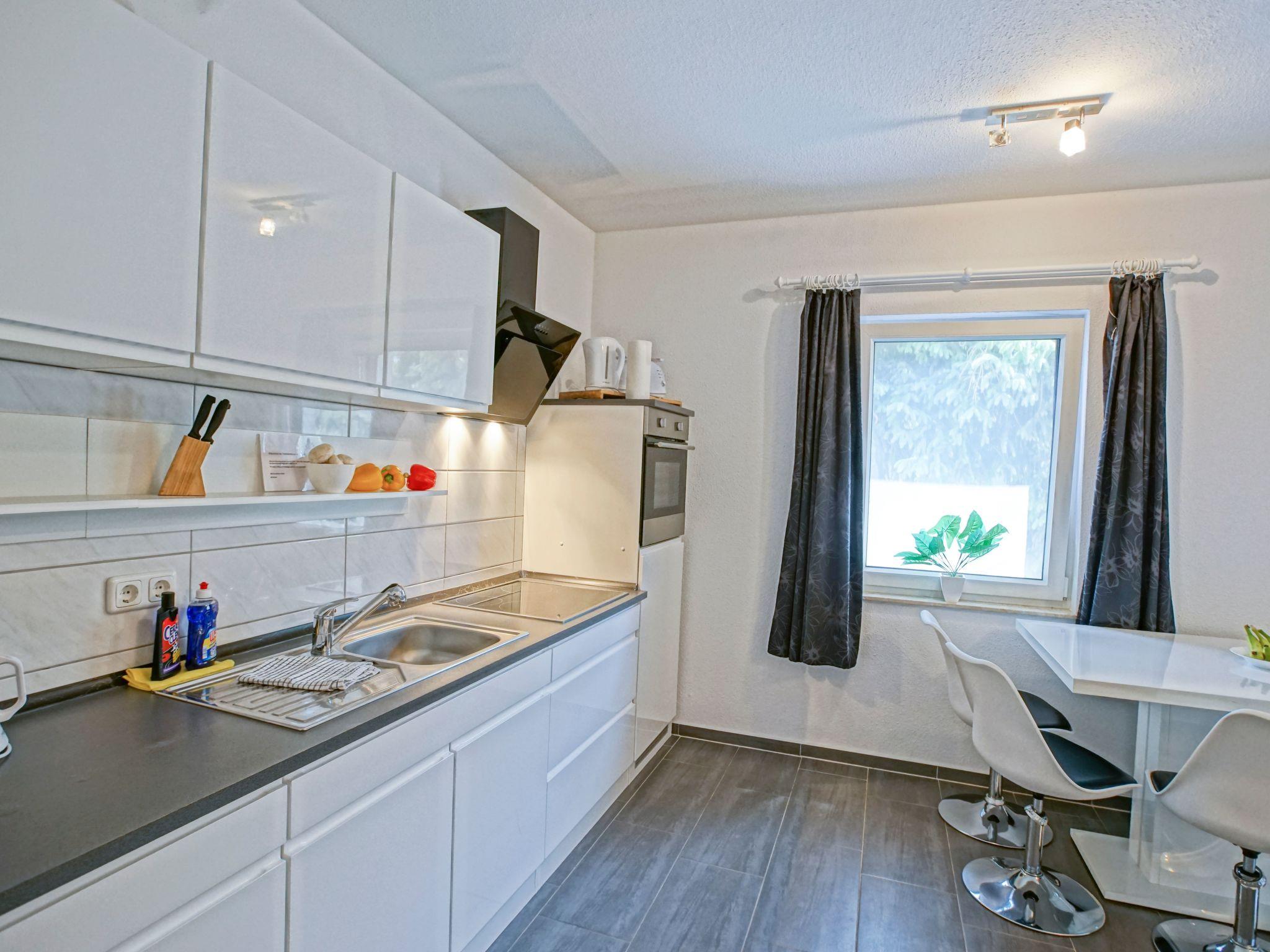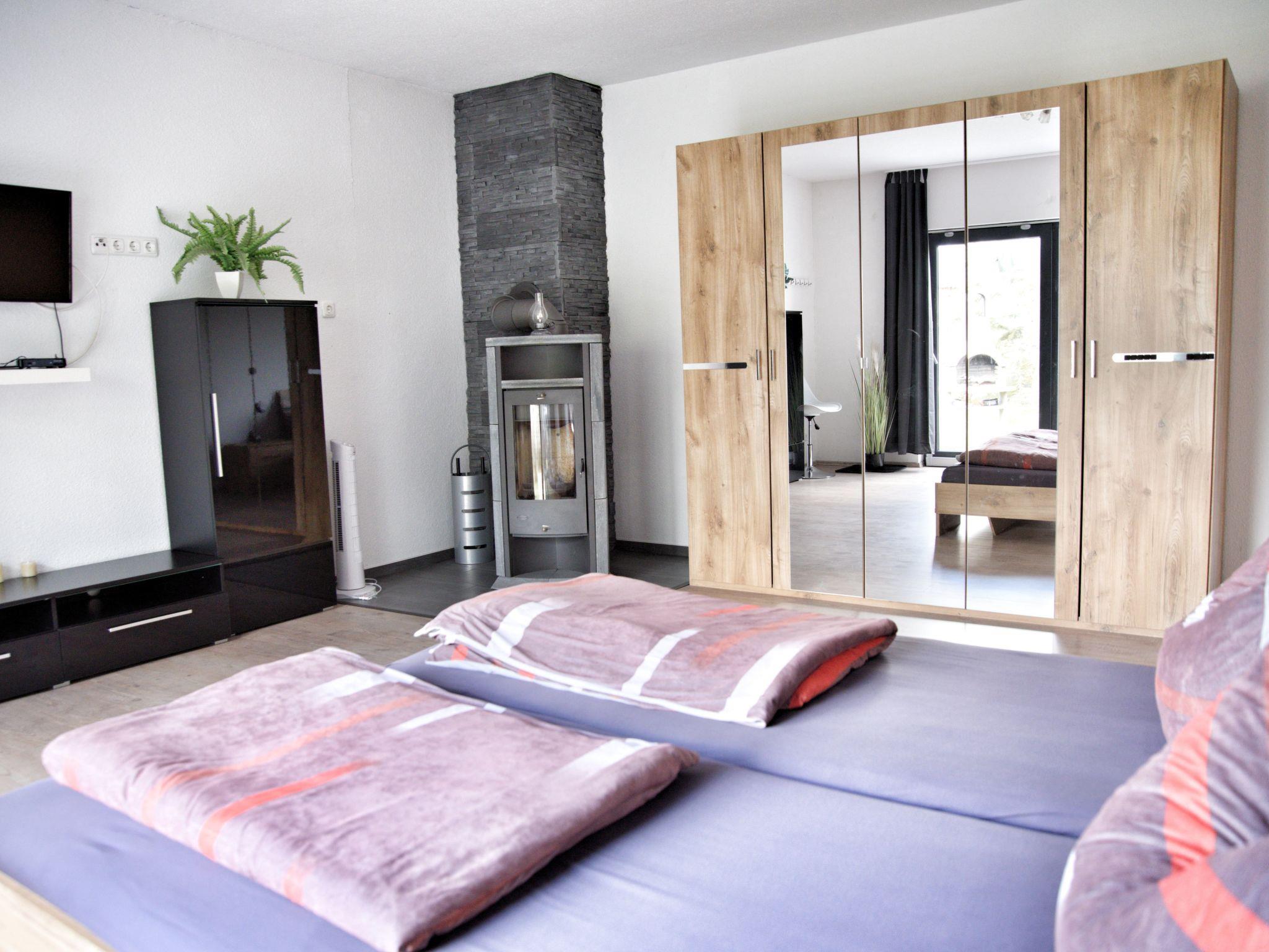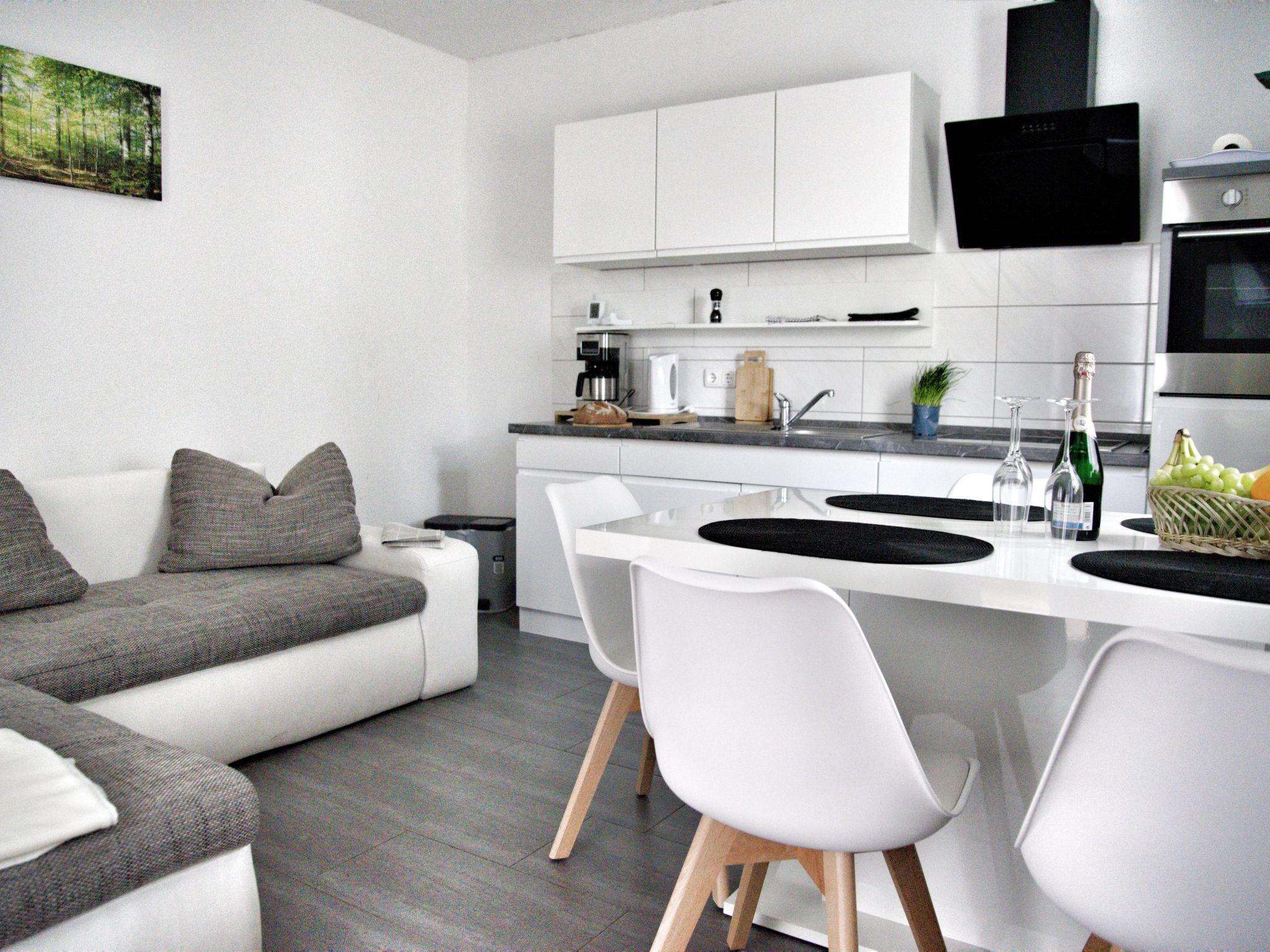 Enjoy a relaxing holiday in a modern furnished flat on approx. 82 m², which meets high demands for a comfortable holiday. The living area is divided into a hallway, two bedrooms with a double bed (180 cm x 200 cm), which is surrounded by two bedside tables with reading lamps on both sides. There is always a spacious wardrobe with mirrored doors in front of the double bed, which offers plenty of storage space for your luggage. The centrepiece of the flat is the 23 m² living room with sofa bed and a kitchenette with integrated dining area. Relax on the pull-out sofa bed after a day out, while the flat-screen TV with satellite TV and TV-USB connection provides entertainment. A crackling fire in the wood-burning stove provides cosy warmth and a particularly cosy ambience even in the cold season. When pulled out, the sofa provides a comfortable sleeping area for two people with a bed size of 194 cm x 235 cm. The open-plan kitchen allows you to prepare your own meals using a four-zone hob, an oven, a fridge with freezer compartment and numerous small electrical appliances, from a toaster and microwave to a coffee machine. You can dine together in the attractive dining area for up to 6 people. The bathroom has a shower cubicle, a wash hand basin with WC and towel dryer, as well as a bathroom window. The flat is heated very comfortably with underfloor heating (included in the price), it is also possible to heat with a fireplace (additional costs), as well as with electric heating (additional costs).