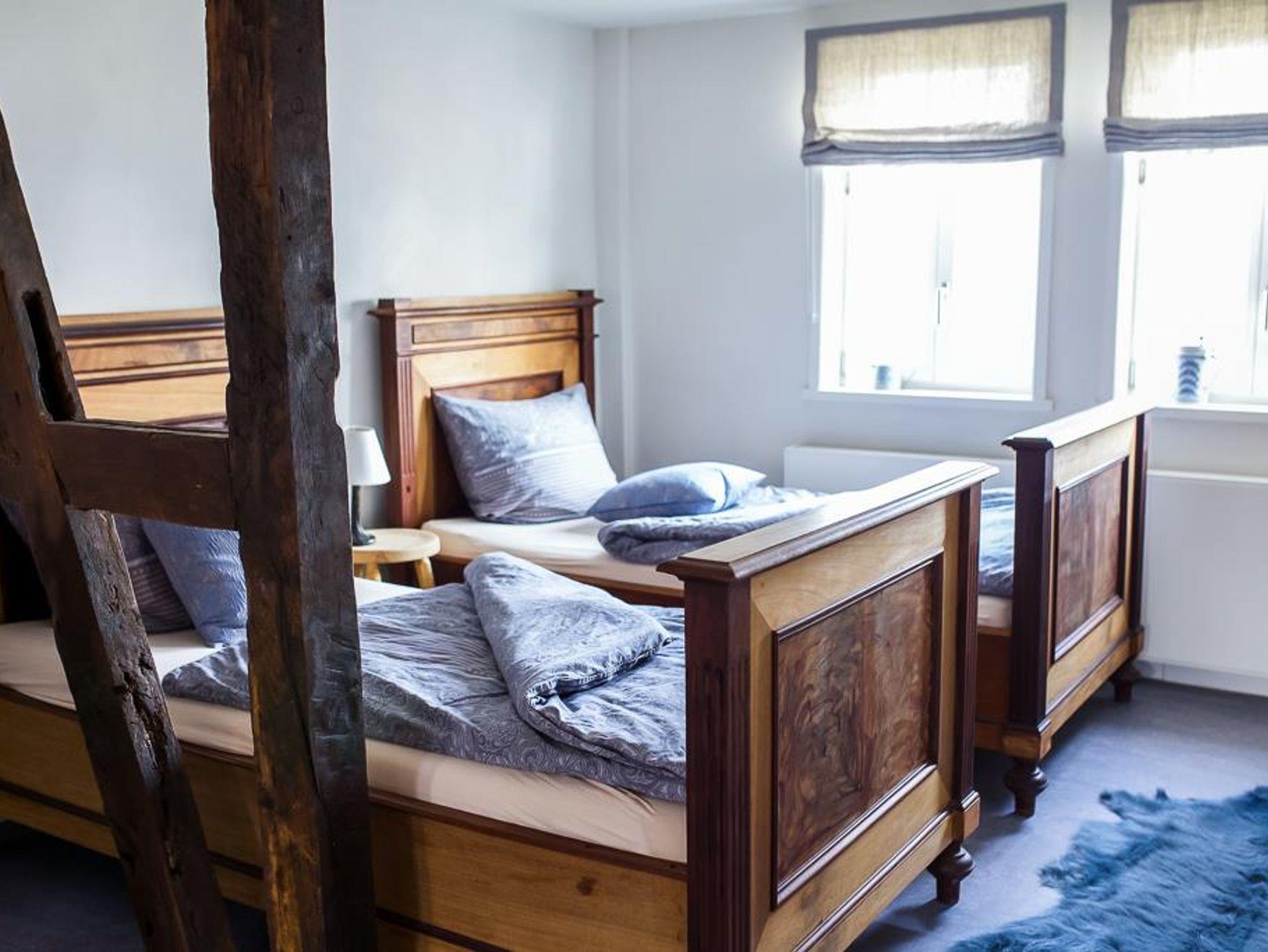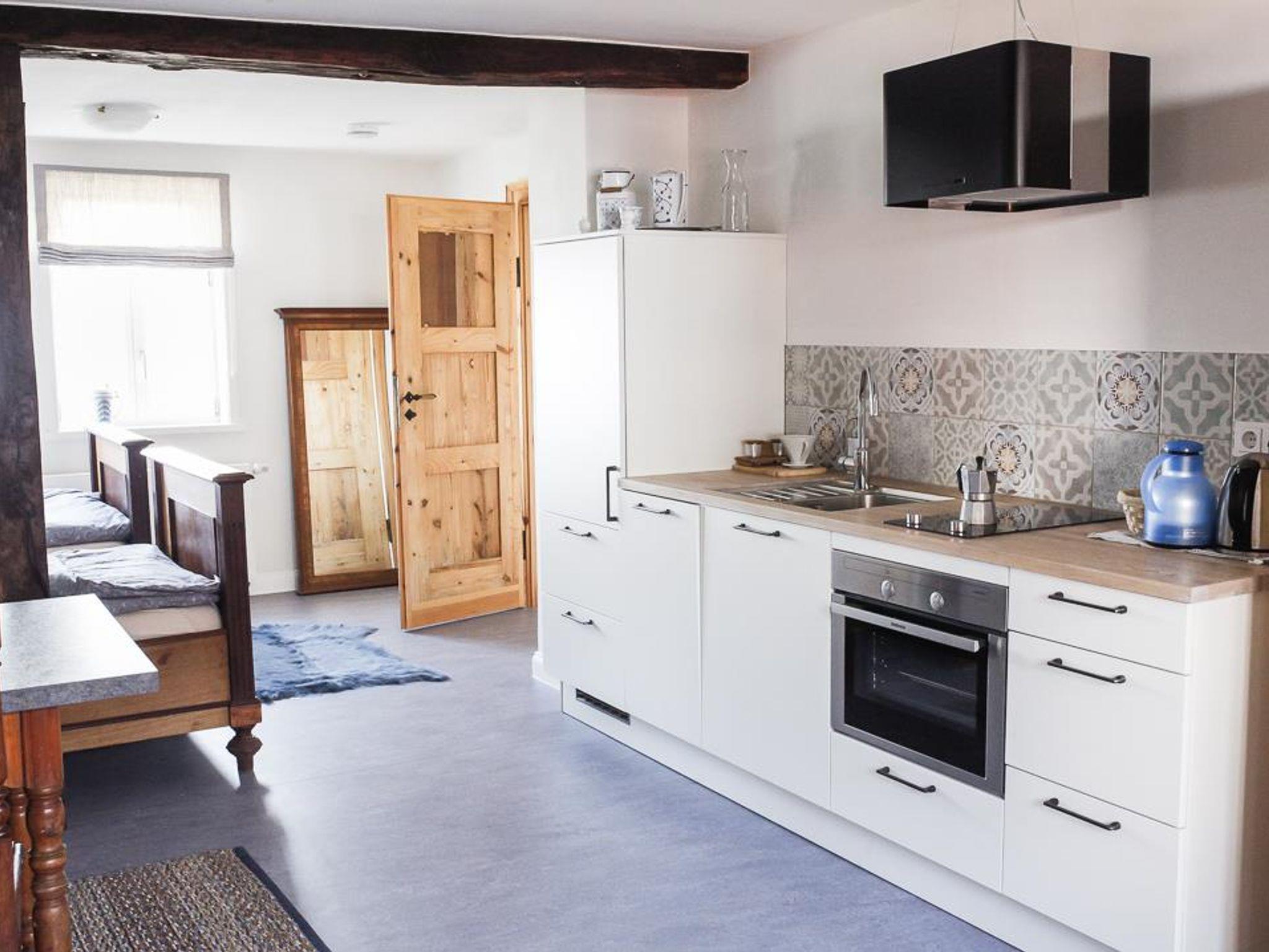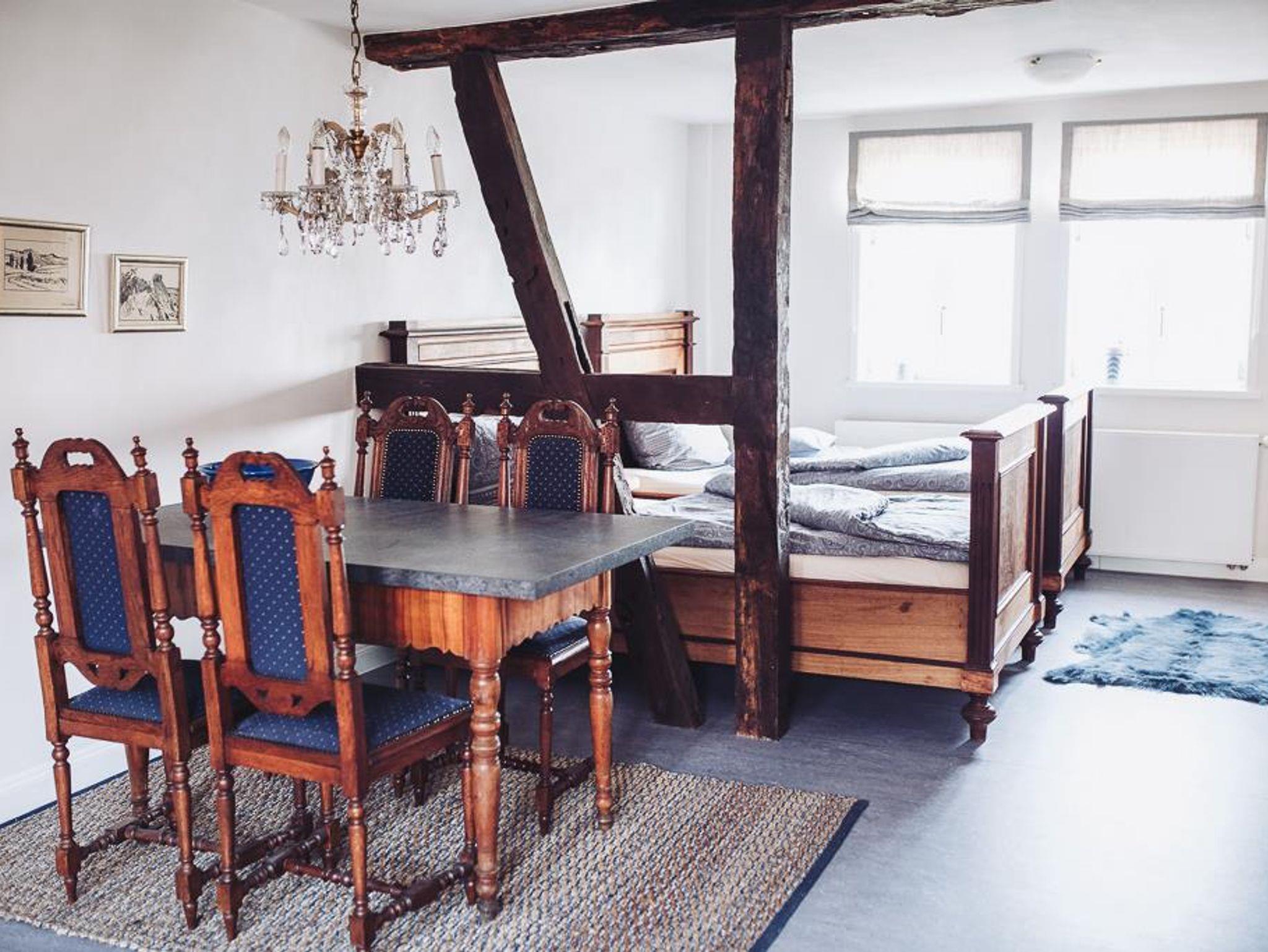 Das Wohnhaus wurde ca. 1775 errichtet, die benachbarte große Scheune mit beeindruckender Zimmermannskonstruktion 1886 beendet. Weitere Nebengebäude und Stallungen zeugen von der wechselvollen Geschichte des Hofes, der bis 2000 bewirtschaftet wurde. Die komplett sanierten und individuell mit einem hochwertigen Mix aus Alt und Neu ausgestatteten Wohnungen bieten bequeme Übernachtungsmöglichkeiten und Feriengenuss: komfortable Doppelbetten, eine großzügig ausgestattete Küchenzeile und ein modernes Bad/WC mit Dusche. Gemeinschaftsraum mit Waschmaschine und Trockner und ein abschließbarer Abstellraum stehen den Gästen zur Verfügung. Ein Wintergarten und die gesamte Hoffläche mit schattigen Plätzen laden zum Frühstück oder einem gemütlichen Sundowner ein.