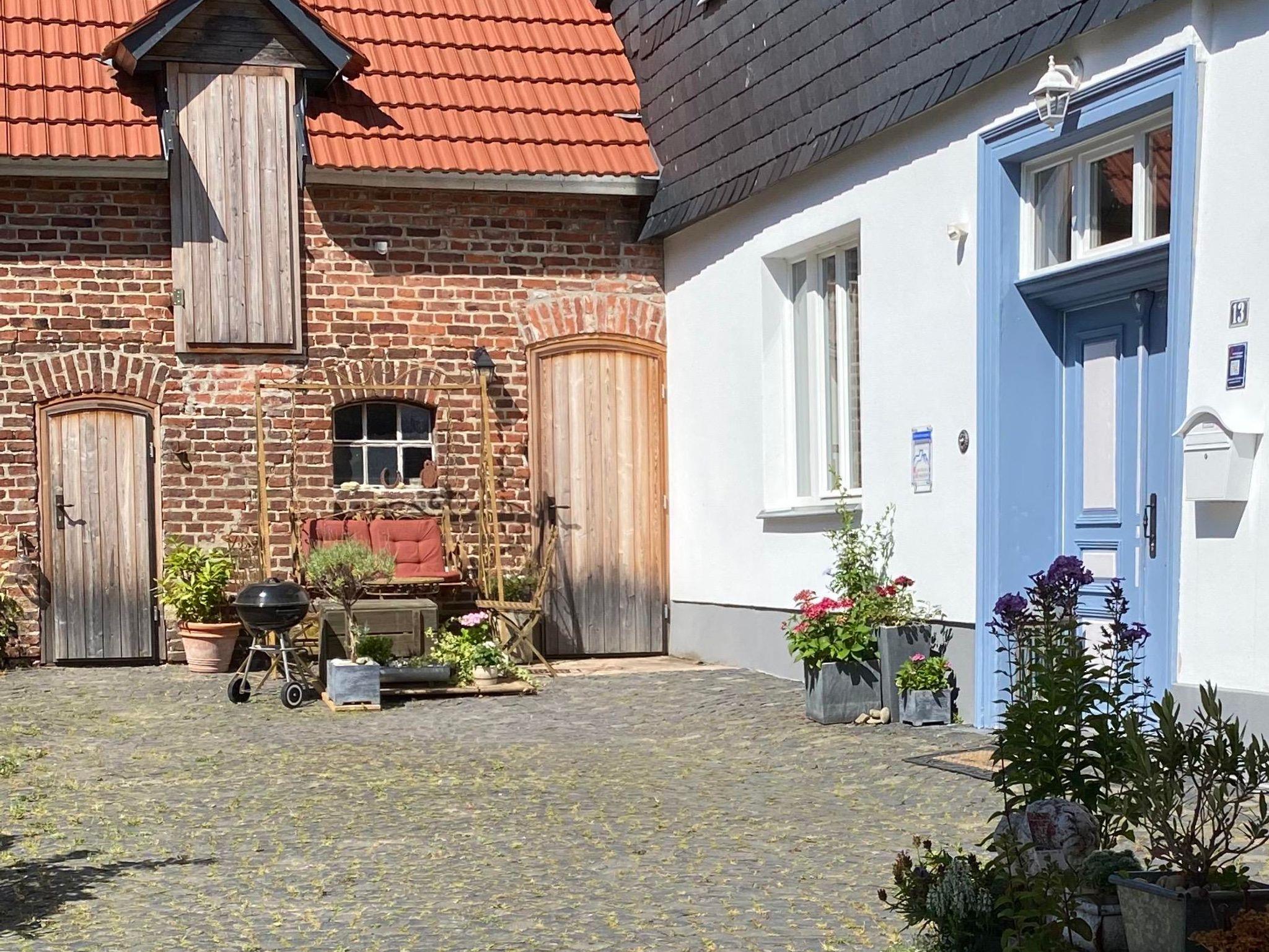 Das Wohnhaus wurde ca. 1775 errichtet, die benachbarte große Scheune mit beeindruckender Zimmermannskonstruktion 1886 beendet. Weitere Nebengebäude und Stallungen zeugen von der wechselvollen Geschichte des Hofes, der bis 2000 bewirtschaftet wurde. Die komplett sanierten und individuell mit einem hochwertigen Mix aus Alt und Neu ausgestatteten Wohnungen bieten bequeme Übernachtungsmöglichkeiten und Feriengenuss: komfortable Doppelbetten, eine großzügig ausgestattete Küchenzeile und ein modernes Bad/WC mit Dusche. Gemeinschaftsraum mit Waschmaschine und Trockner und ein abschließbarer Abstellraum stehen den Gästen zur Verfügung. Ein Wintergarten und die gesamte Hoffläche mit schattigen Plätzen laden zum Frühstück oder einem gemütlichen Sundowner ein.