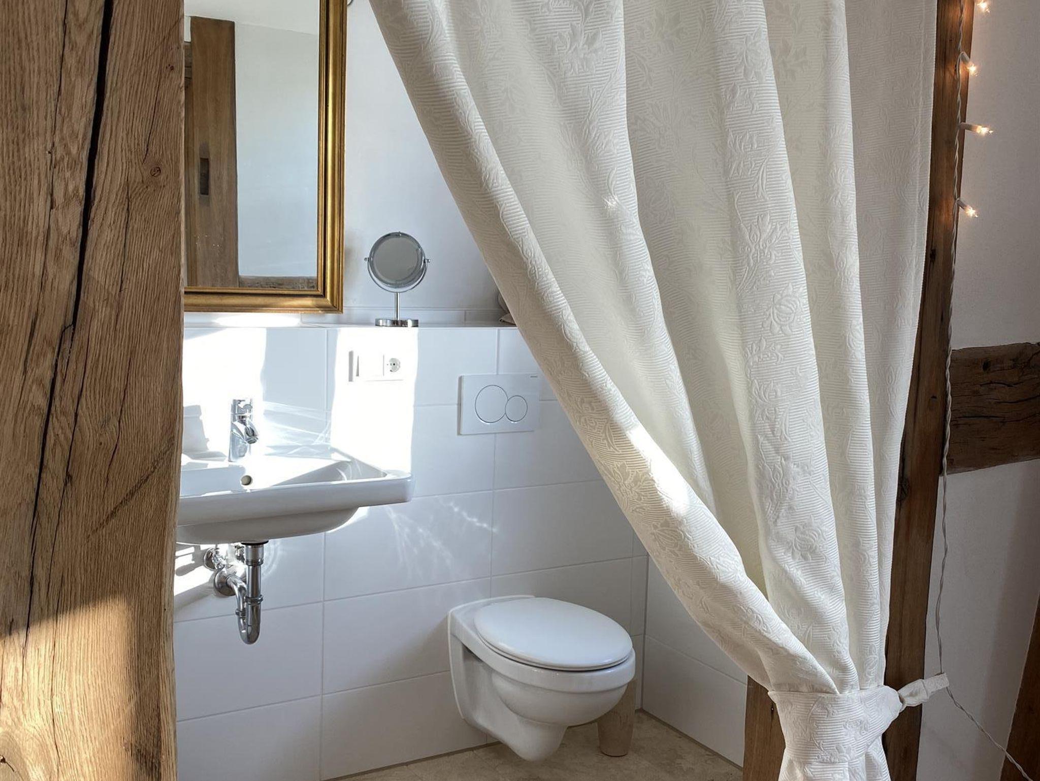 Turmfalke Altes und neues Fachwerk, der originale Dielenboden, ein romantisches Schwälmer Bett (Achtung: nur 1,95 m lang) antikes und modernes Mobiliar geschmackvoll kombiniert. Hier kannst Du träumen und Abstand vom Alltag gewinnen. Das Studio ensuite ist (nicht nur) besonders geeignet für eine romantische Auszeit. Das Studio Turmfalke verfügt über ein Bad ensuite. Keine Tür trübt das harmonisch eingefügte Fachwerk. Damit ist es zwar nicht vom Deutschen Tourismus Verband zertifizierbar, bietet aber ansonsten seinen Gästen einen drei-Sterne-vergleichbaren Komfort. Alte Tonfliesen vom ehemaligen Getreidespeicher finden neue Verwendung als Fliesenspiegel in der Küche. Ein schöner Kontrast zur modernen, hängenden Dunstabzugshaube und dem funktionalen Küchendesign. Alle Studios verfügen über Ausziehsofas, falls noch eine weitere Person mit übernachten möchte.