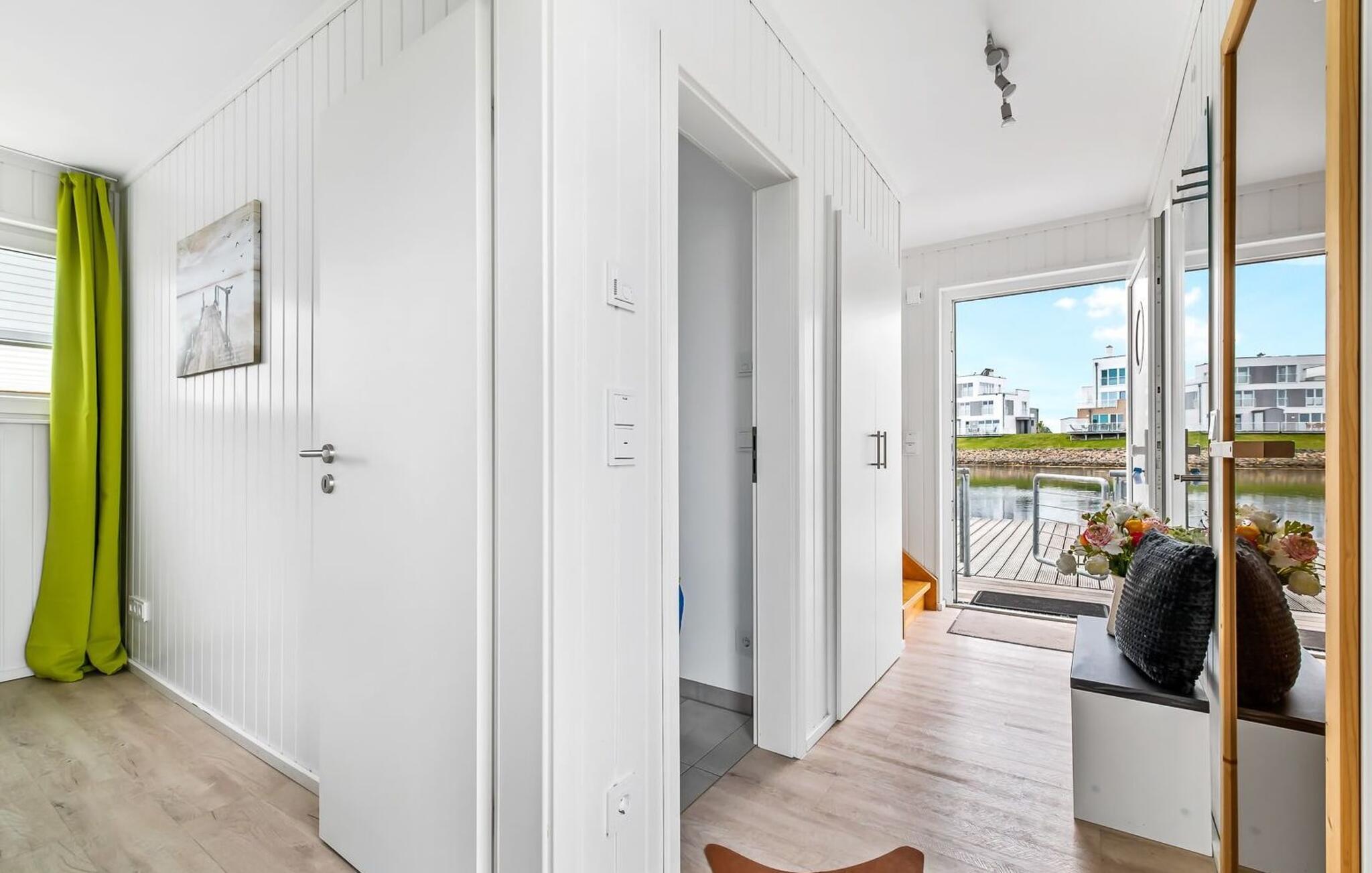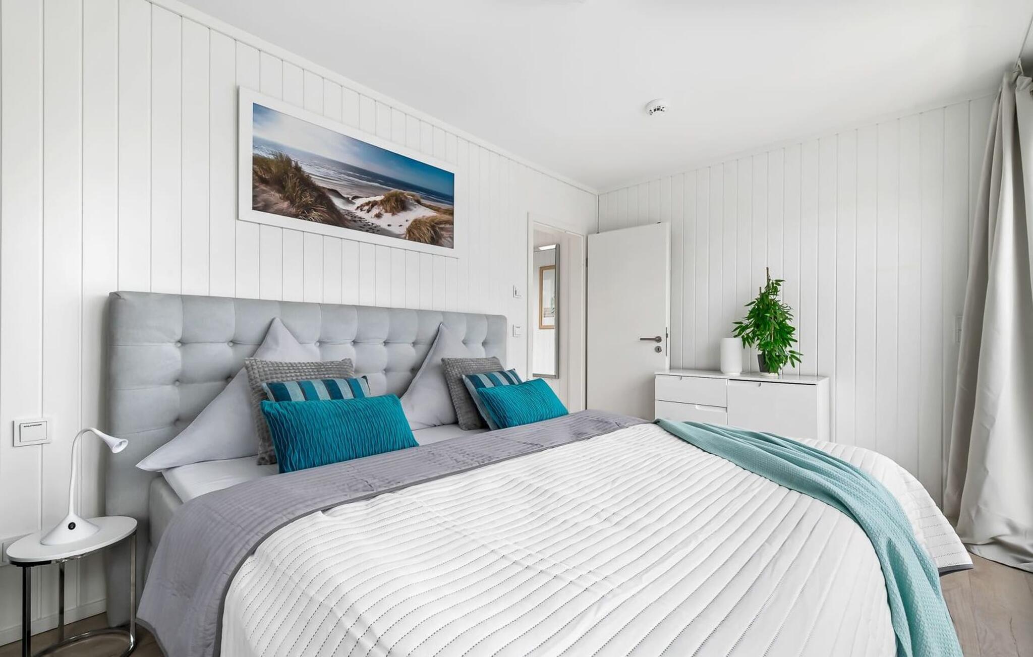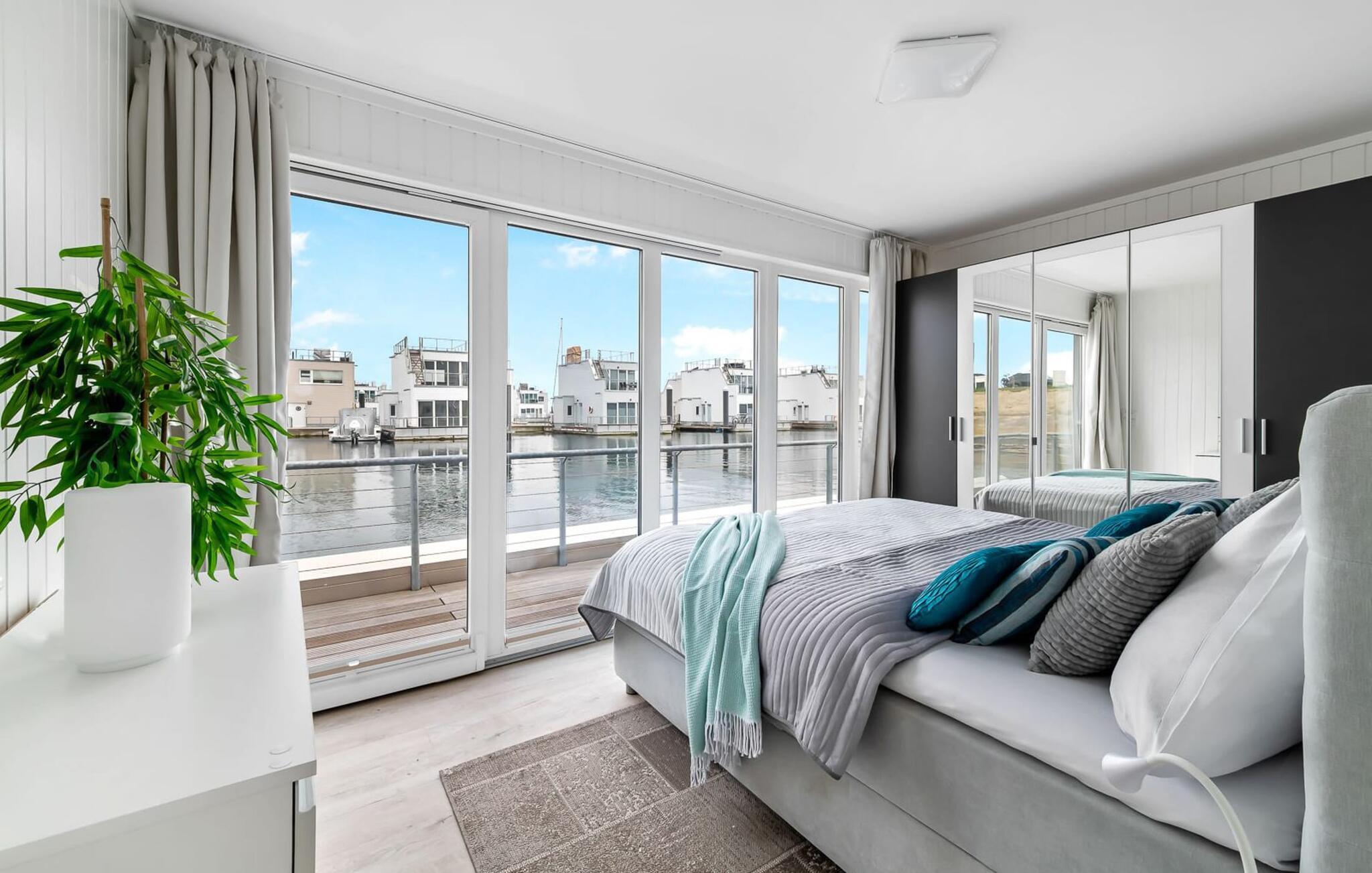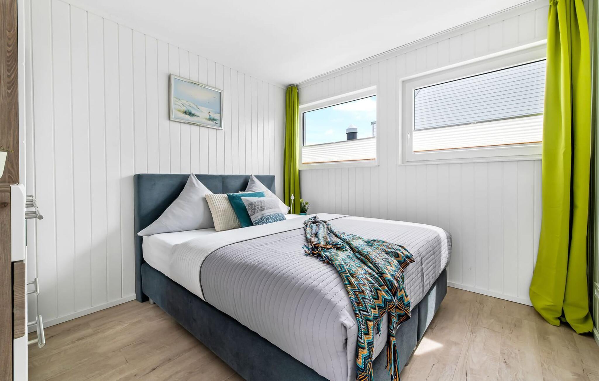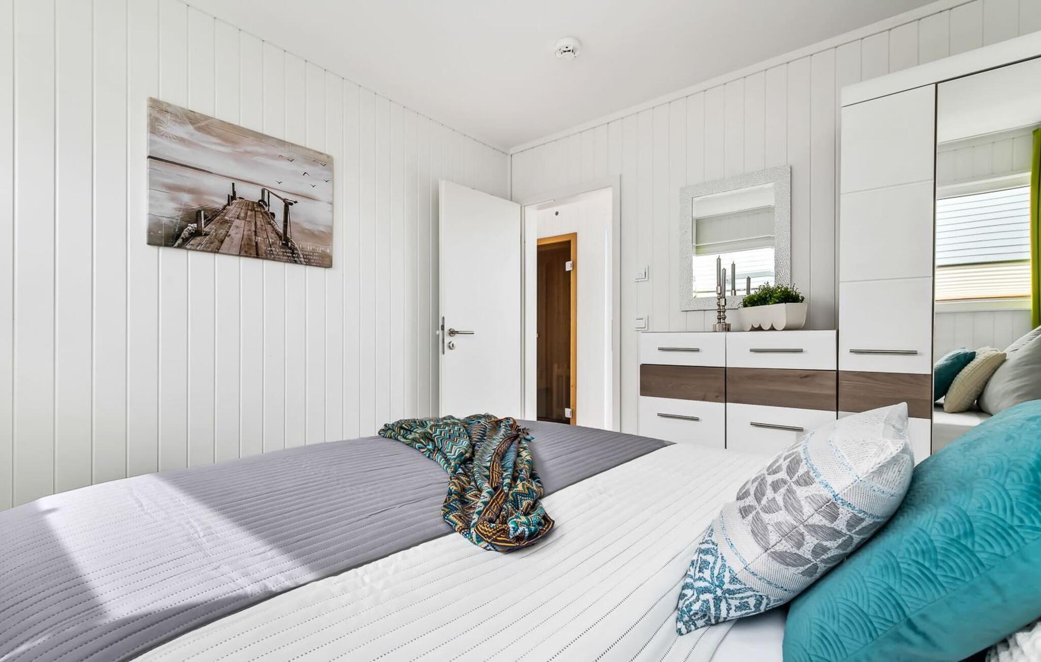 Det store soveværelse er udstyret med en komfortabel dobbeltseng med boxmadrasser, herfra har I adgang til den første omkringliggende terrasse. Takket være panoramavinduerne fra gulv til loft kan I se havnebiografen direkte fra sengen, selv i dårligt vejr, uden selv at skulle blive våd. Det andet soveværelse er også udstyret med en dobbeltseng og bevarer feriefølelsen med maritime billeder og dekorationer.