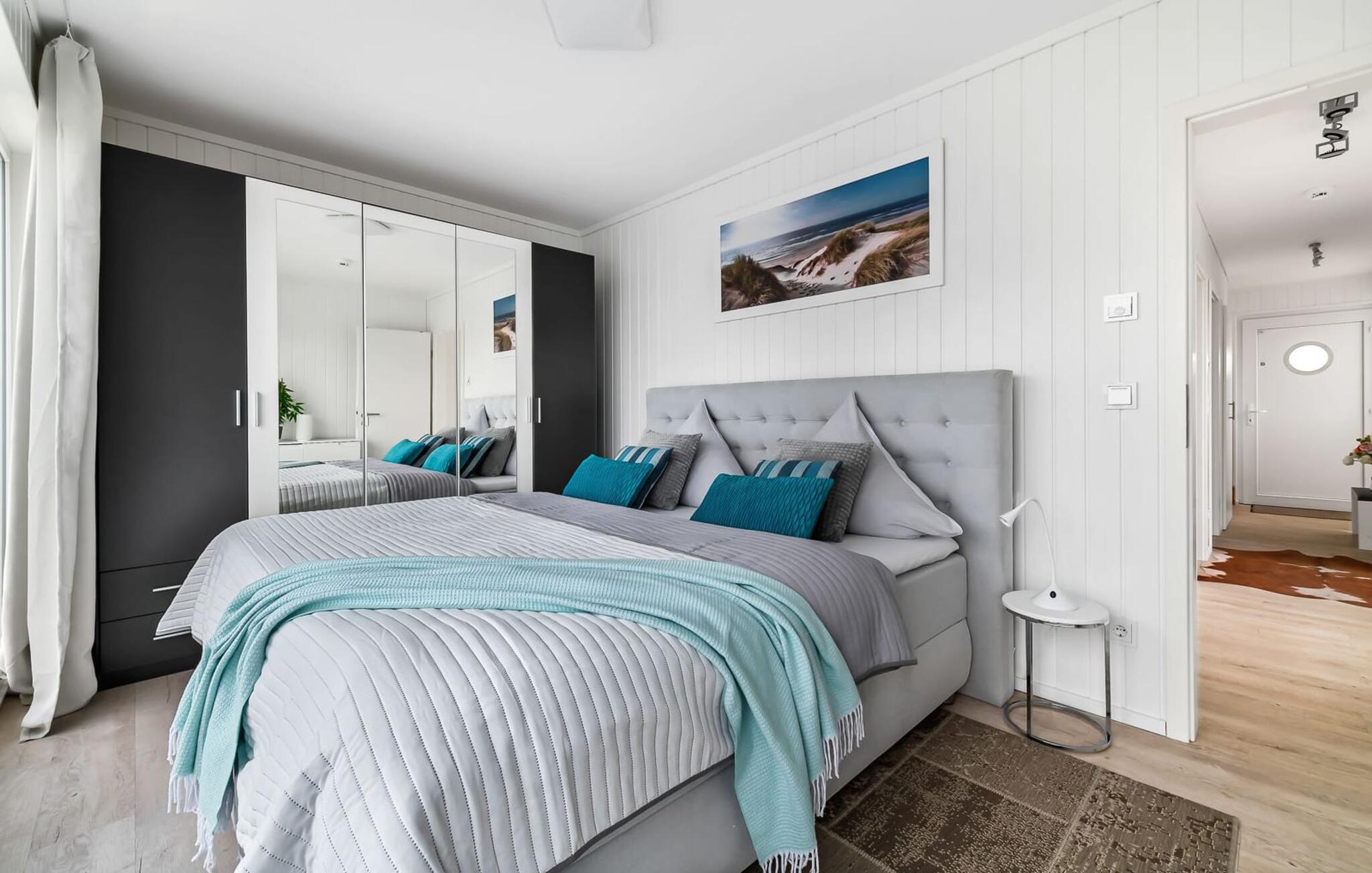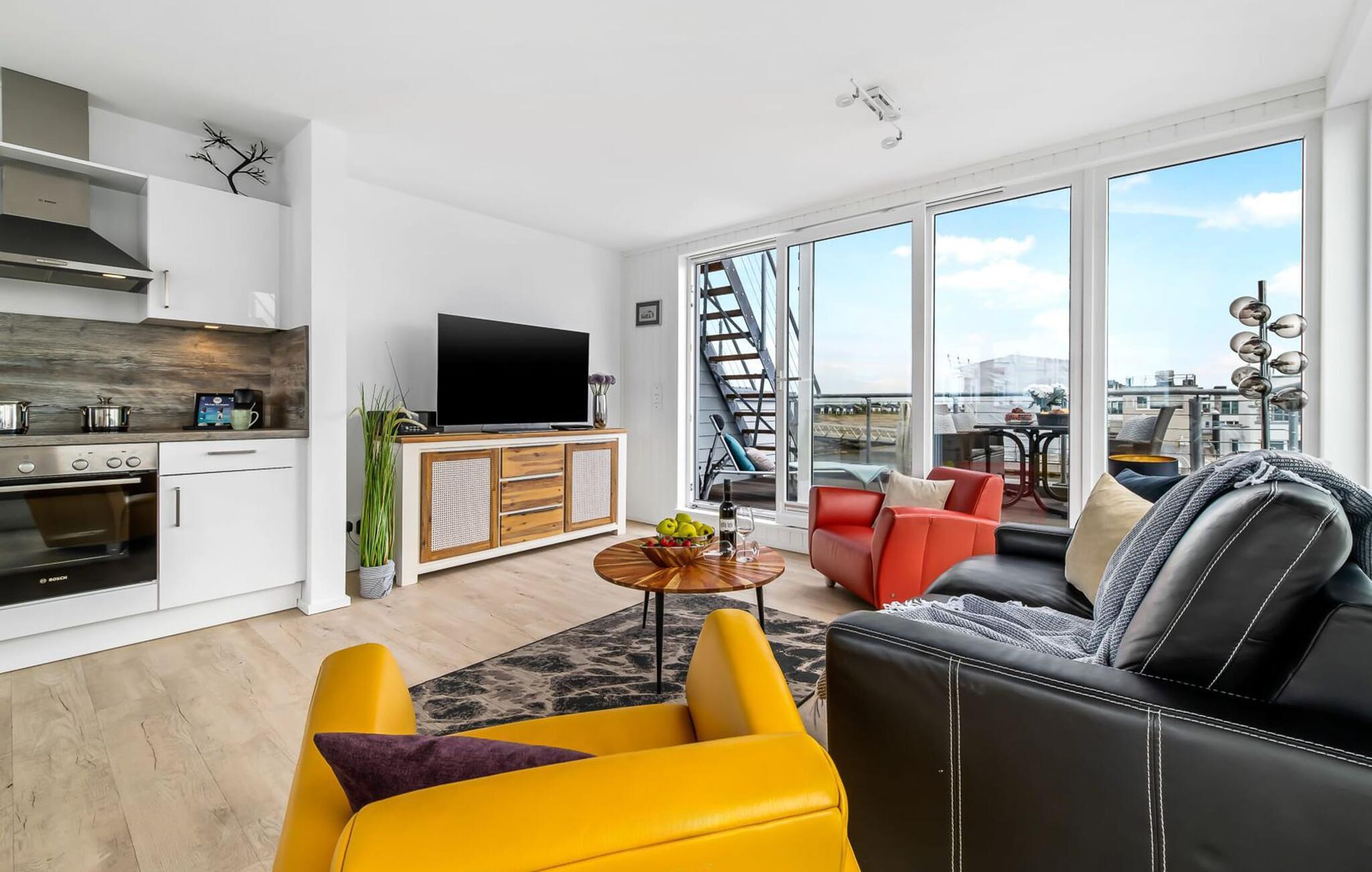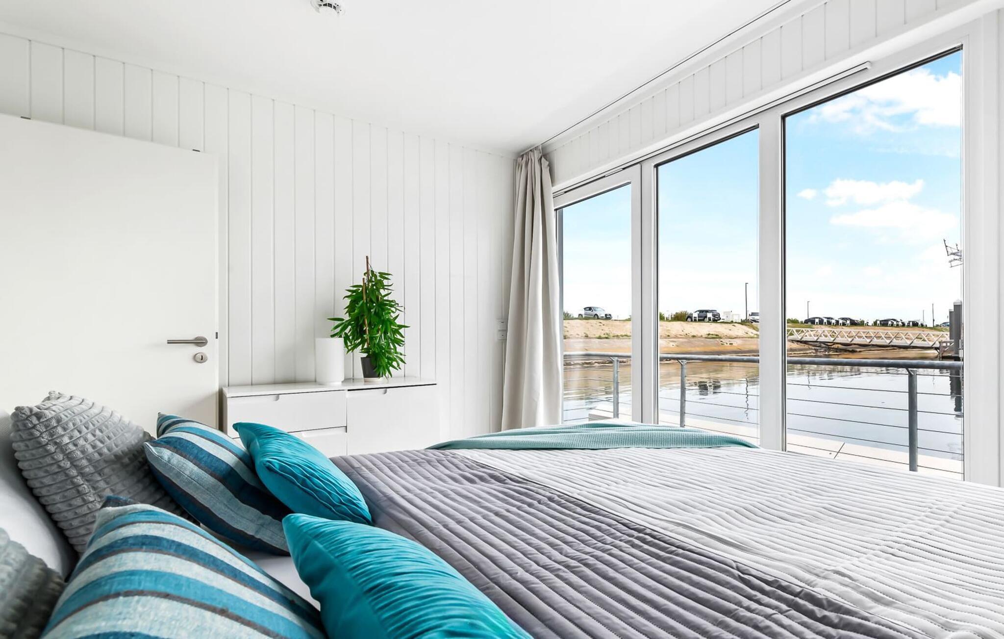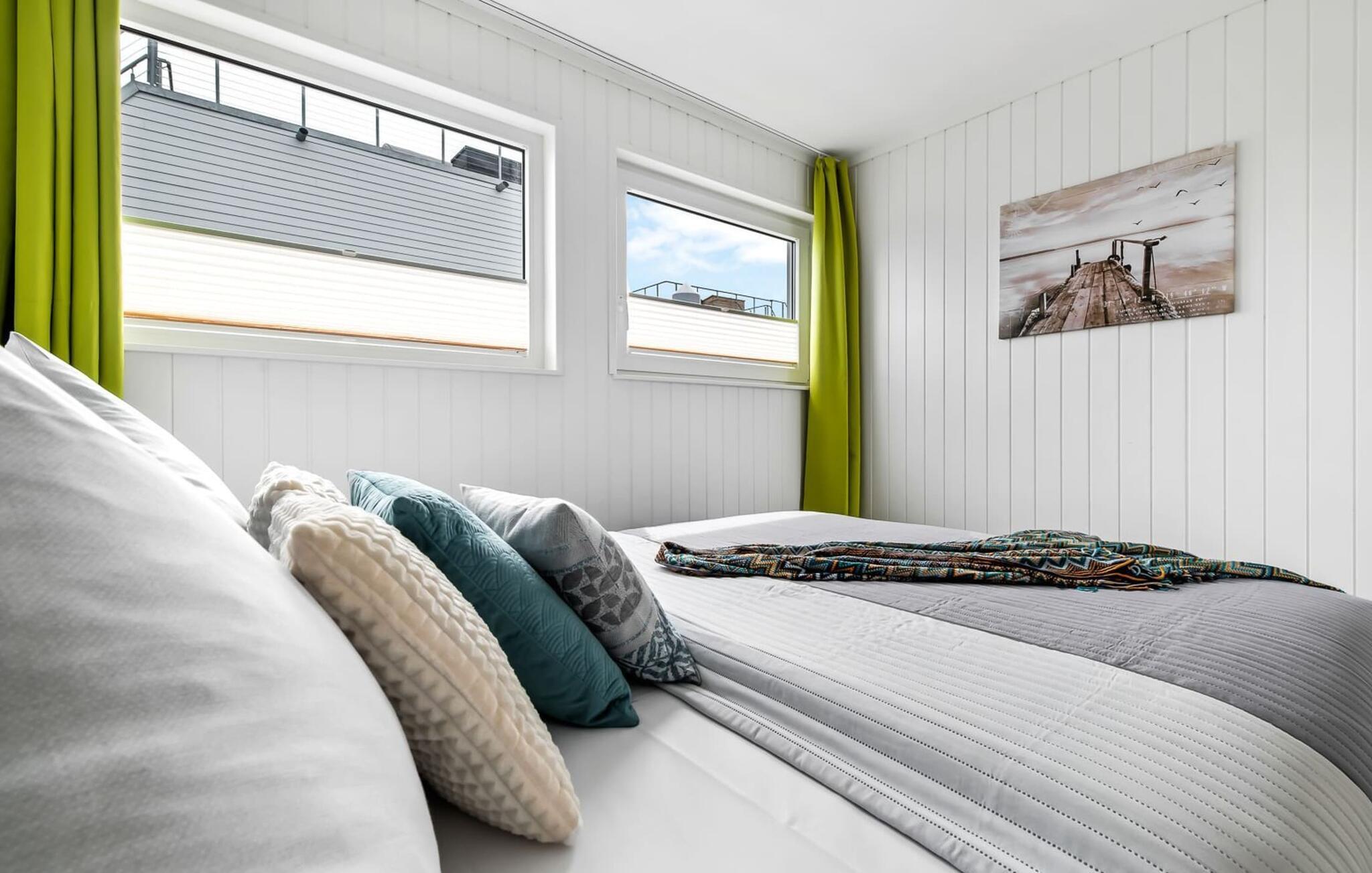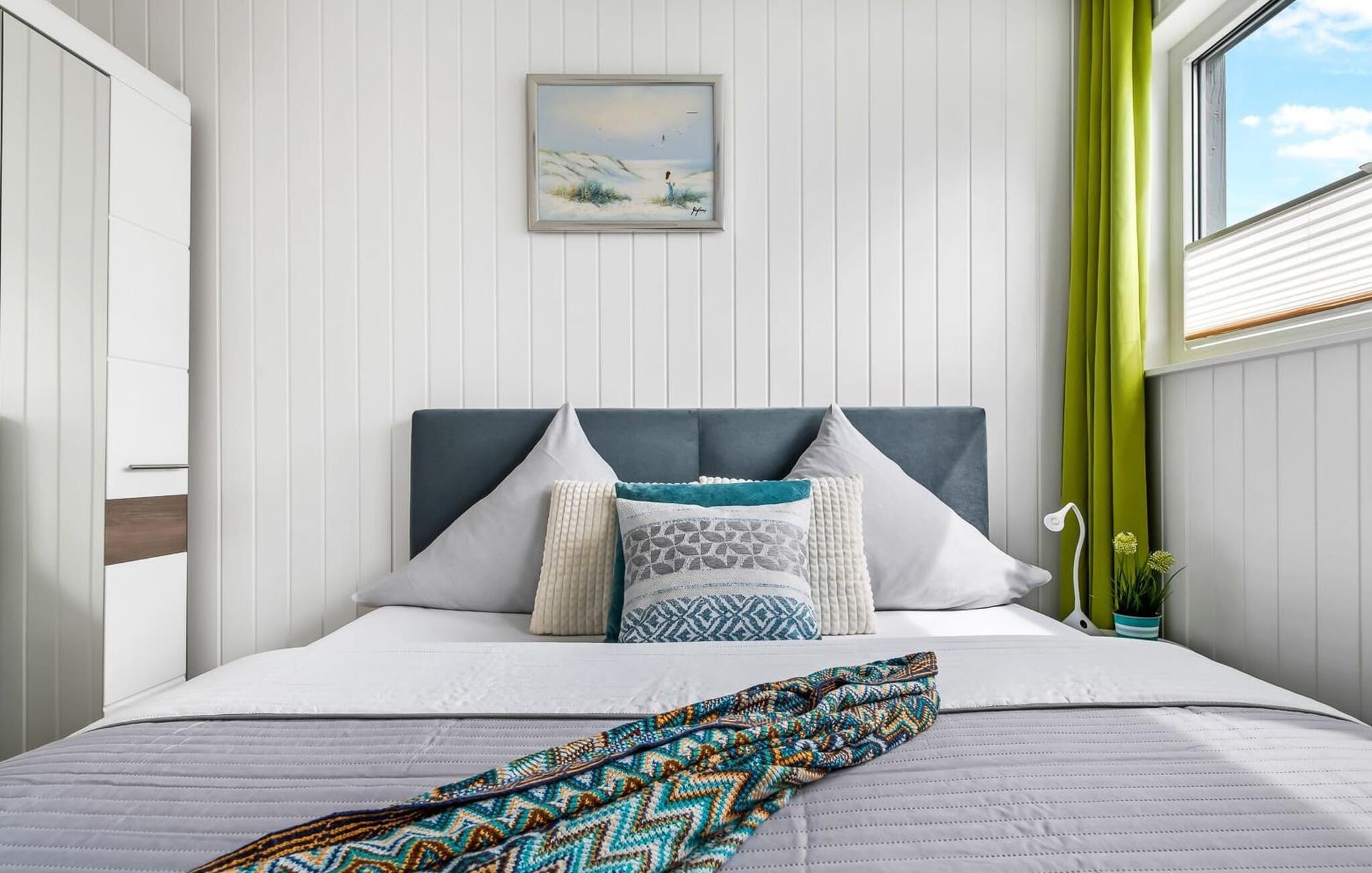 Det store soveværelse er udstyret med en komfortabel dobbeltseng med boxmadrasser, herfra har I adgang til den første omkringliggende terrasse. Takket være panoramavinduerne fra gulv til loft kan I se havnebiografen direkte fra sengen, selv i dårligt vejr, uden selv at skulle blive våd. Det andet soveværelse er også udstyret med en dobbeltseng og bevarer feriefølelsen med maritime billeder og dekorationer.