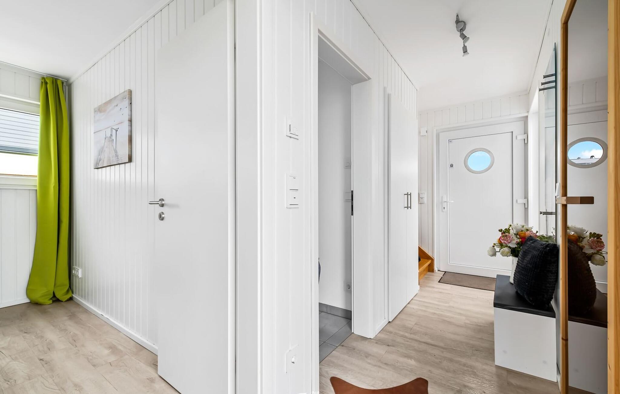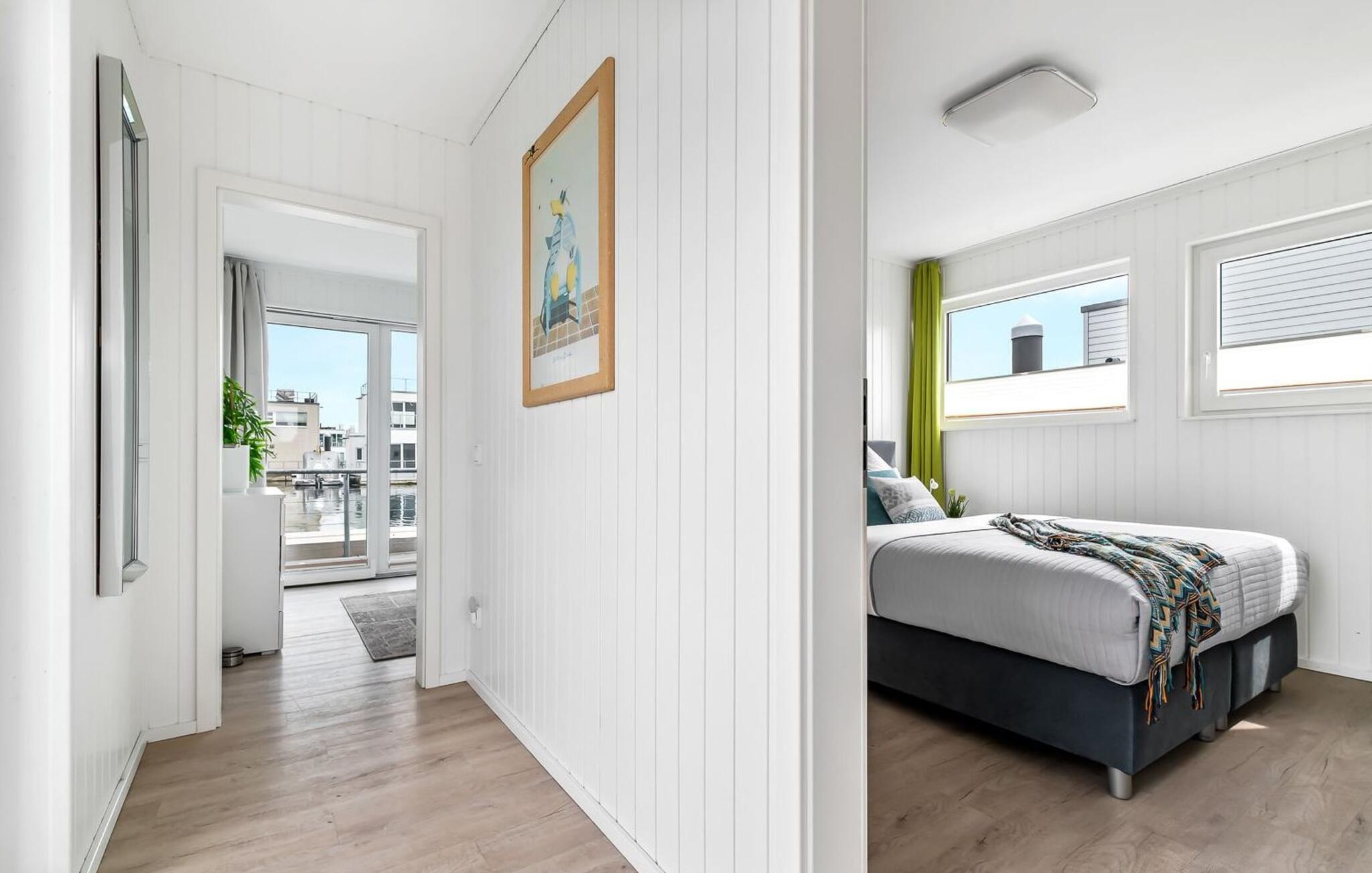 Vand så langt øjet rækker! I kan nå feriehuset via en gangbro, der stikker ud i havnebassinet. Det er her feriefølelsen begynder højt i nord. Når I ankommer til huset, befinder I jer straks i husets afslapningsområde. Her finder I de to soveværelser, badeværelset og den finske sauna med udsigt over havnen.