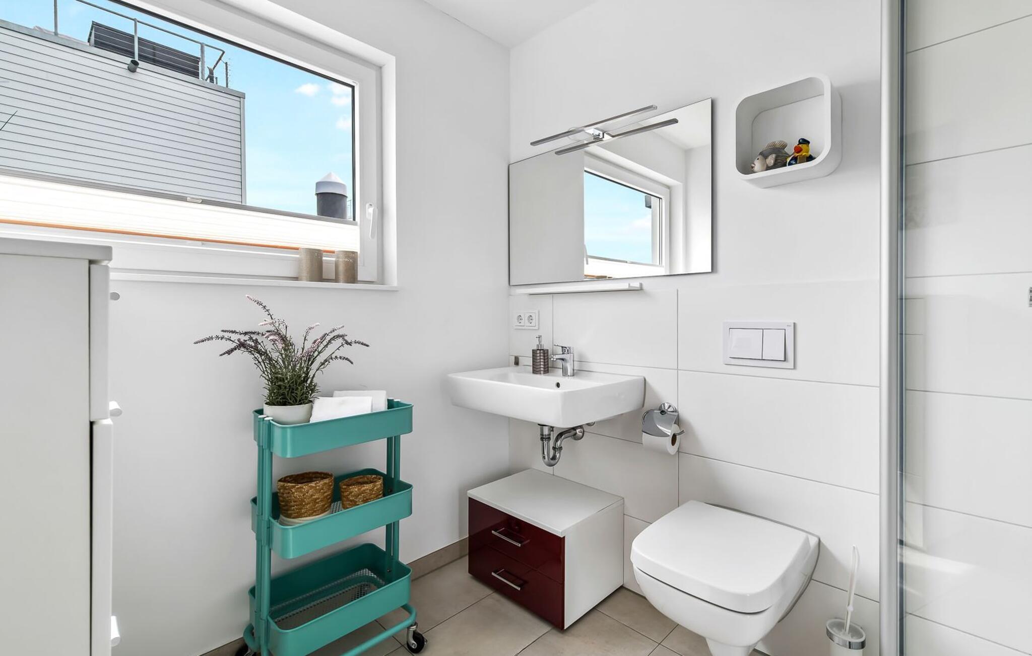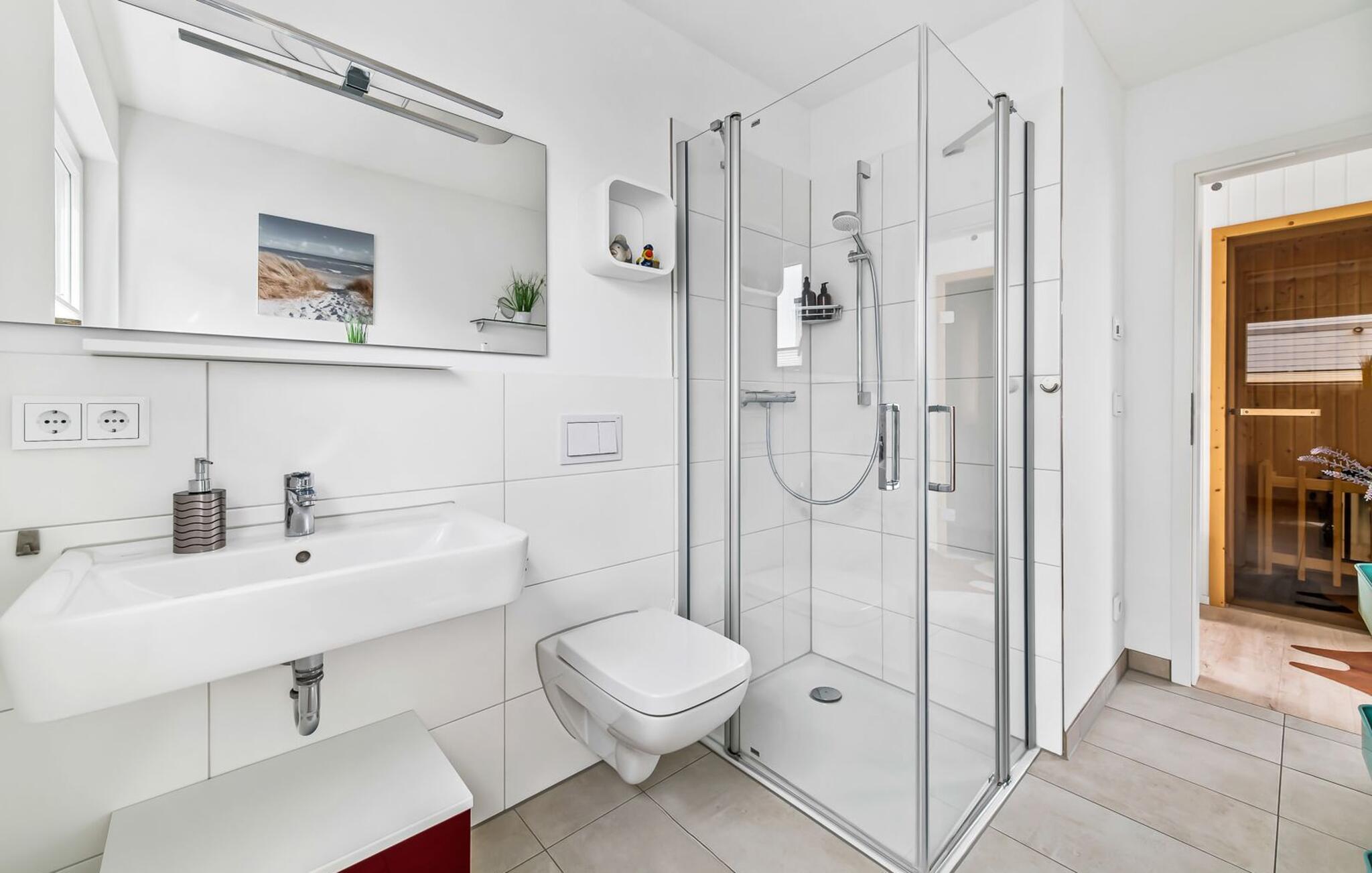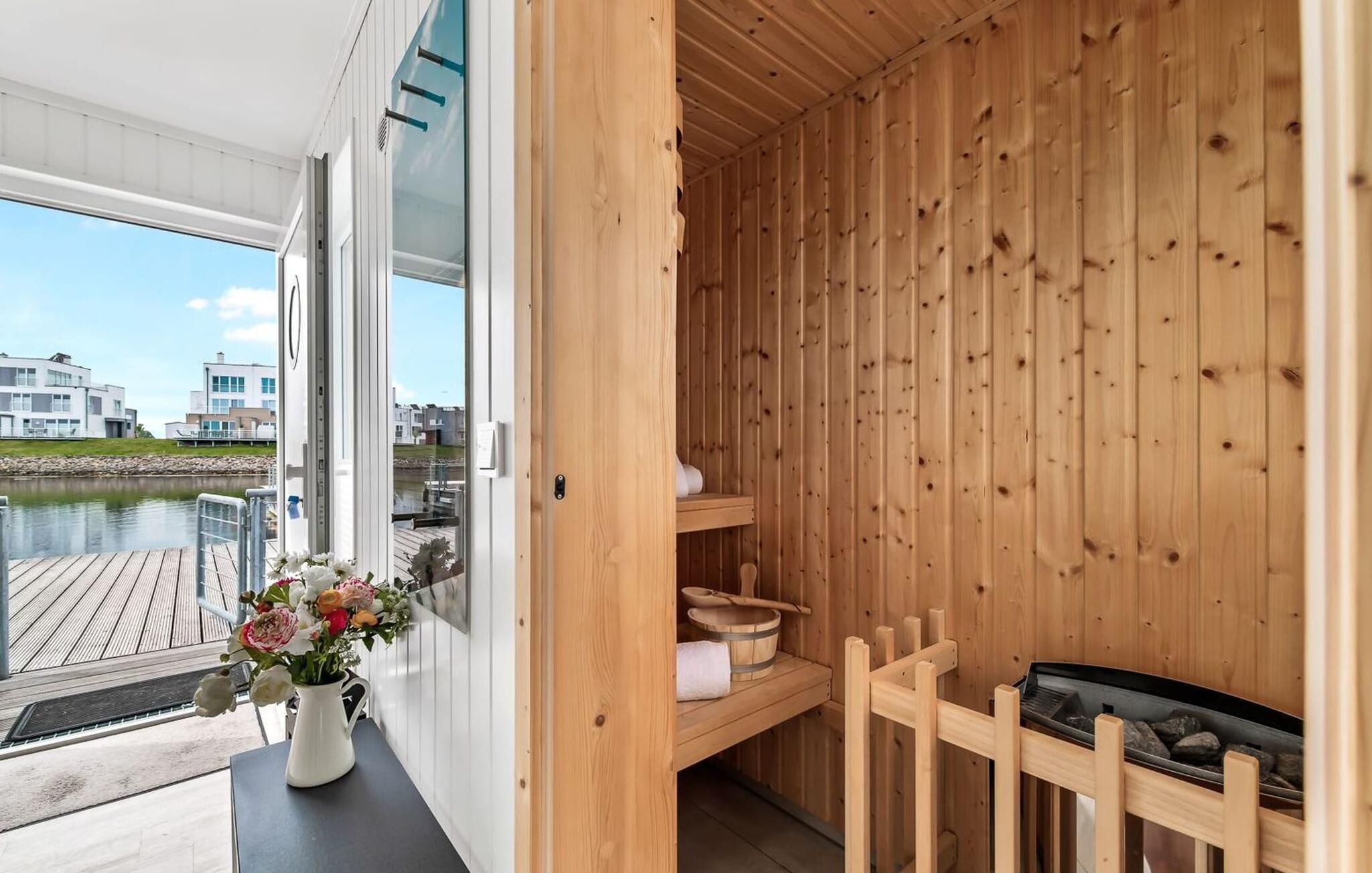 I tilknytning til soveværelserne er badeværelset med bruseniche i gulvniveau og finsk sauna. Herfra kan I også se havnens farverige jag og jag.