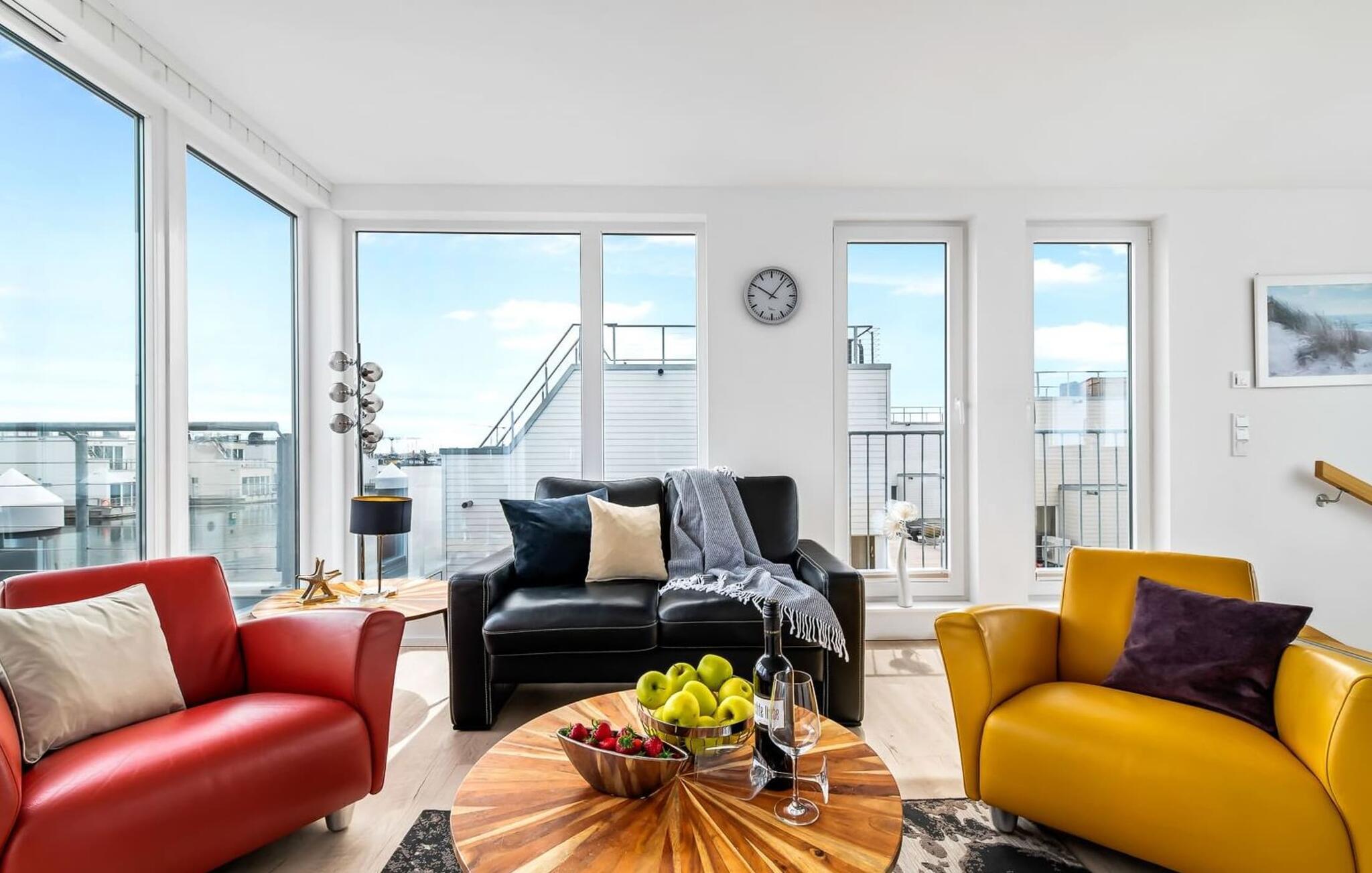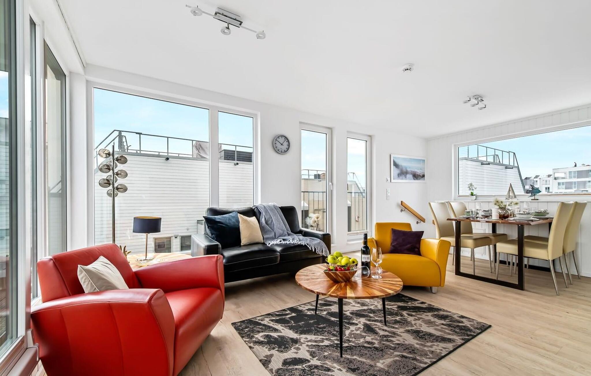 Opholdsstuen tiltrækker opmærksomhed med sine farverige læderlænestole og komfortable sofa, og I vil med det samme gøre jer godt tilpas foran Smart TV'et.