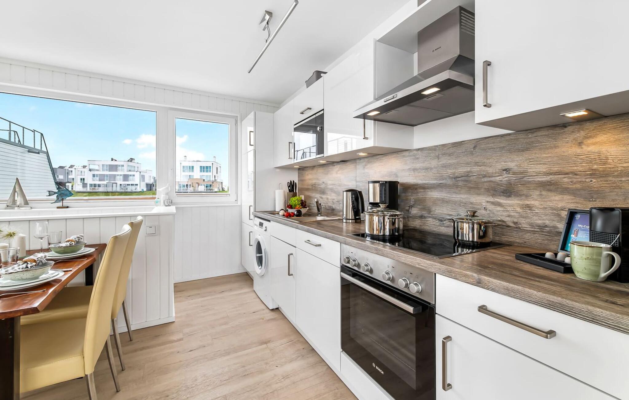 En trappe fører jer til øverste etage, lejlighedens hjerte. Et åbent opholds- og spiseområde med inkluderet køkken og spiseplads omgivet af gulv til loft-vinduer genopliver feriefølelsen. Det perfekt udstyrede køkken er rummeligt, oversvømmet med lys, har træelementer og er indrettet i varme farver og er en fornøjelse at lave mad i.