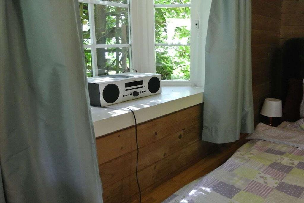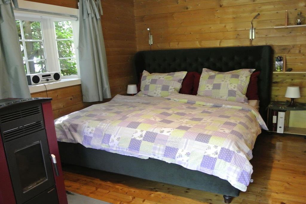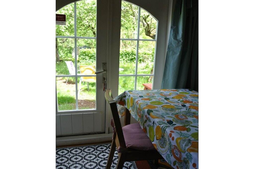 Unique red wooden house in the middle of a garden with flowers and trees, here you can look forward to spring. On the banks of the Moselle and close to the cycle path.