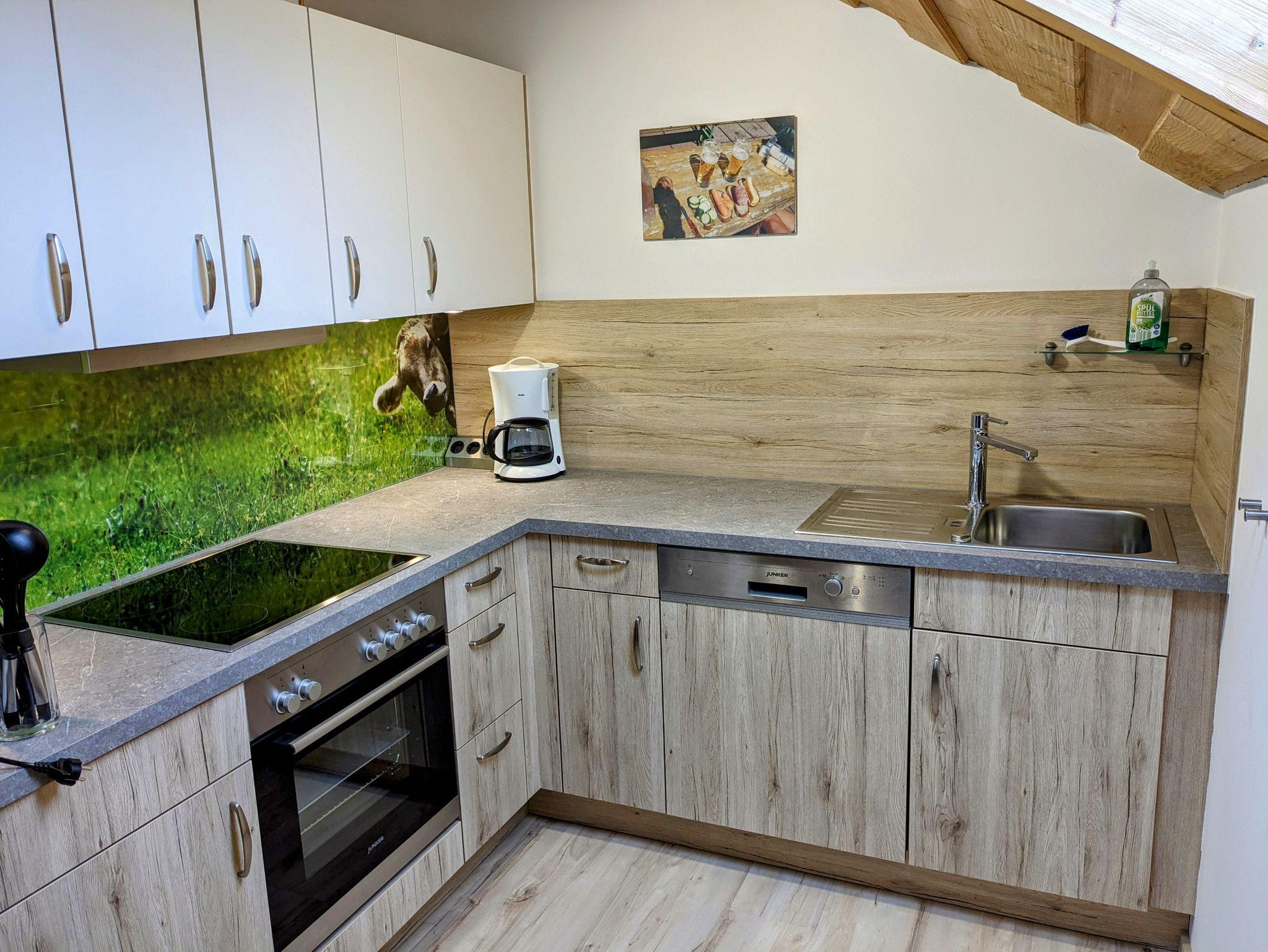 Unsere Dachgeschoß-Ferienwohnung misst 76m², verfügt über ein separates Schlafzimmer mit einem Doppelbett und einem abgeschlossenen Wohnzimmer mit Sat-TV. Die Wohnung hat ein Bad mit WC, einem kleinen Flur, eine voll ausgestattete Küche mit Essecke und einem Balkon mit herrlichen Berg- und Panoramablick. Sie eignet sich für maximal zwei Personen.