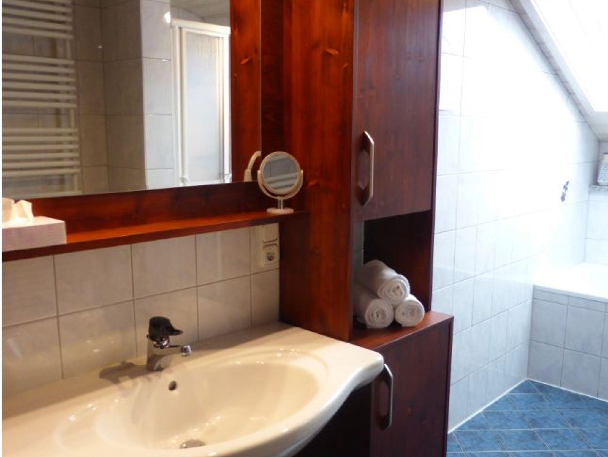 Das Bad mit Dusche und Badewanne ist räumlich vom WC getrennt. In einem der Schlafzimmer befindet sich ein zusätzliches Waschbecken.