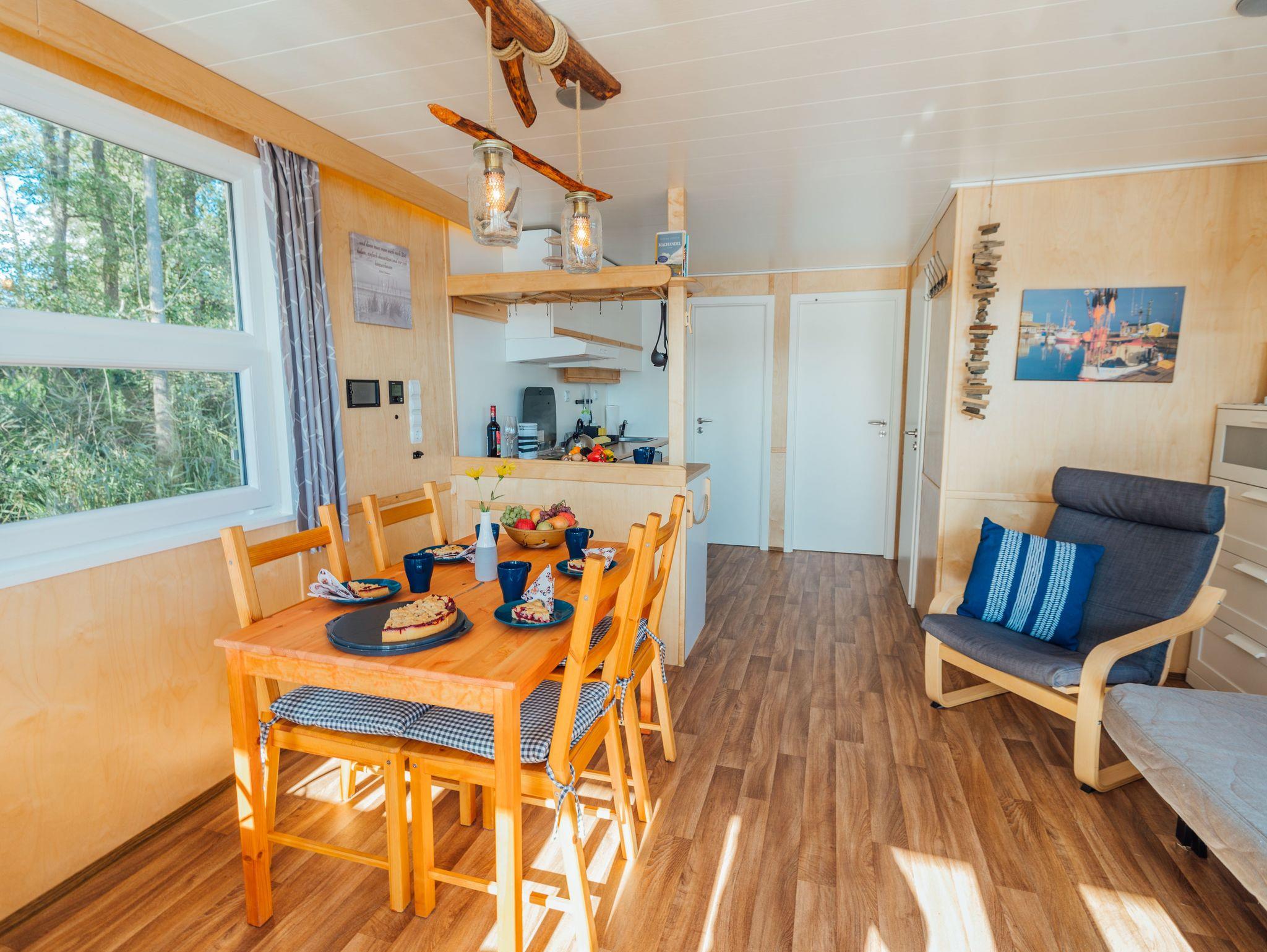 Im Innenraum des Wohn-/Essbereichs befindet sich ein Schlafsofa für 2 Personen, 1 Tisch mit 6 Stühlen sowie eine Küche mit Kühlschrank, Backofen, 2 Gasherdplatten und Wasserkessel. Geschirr und Besteck sind für 6 Personen vorhanden.