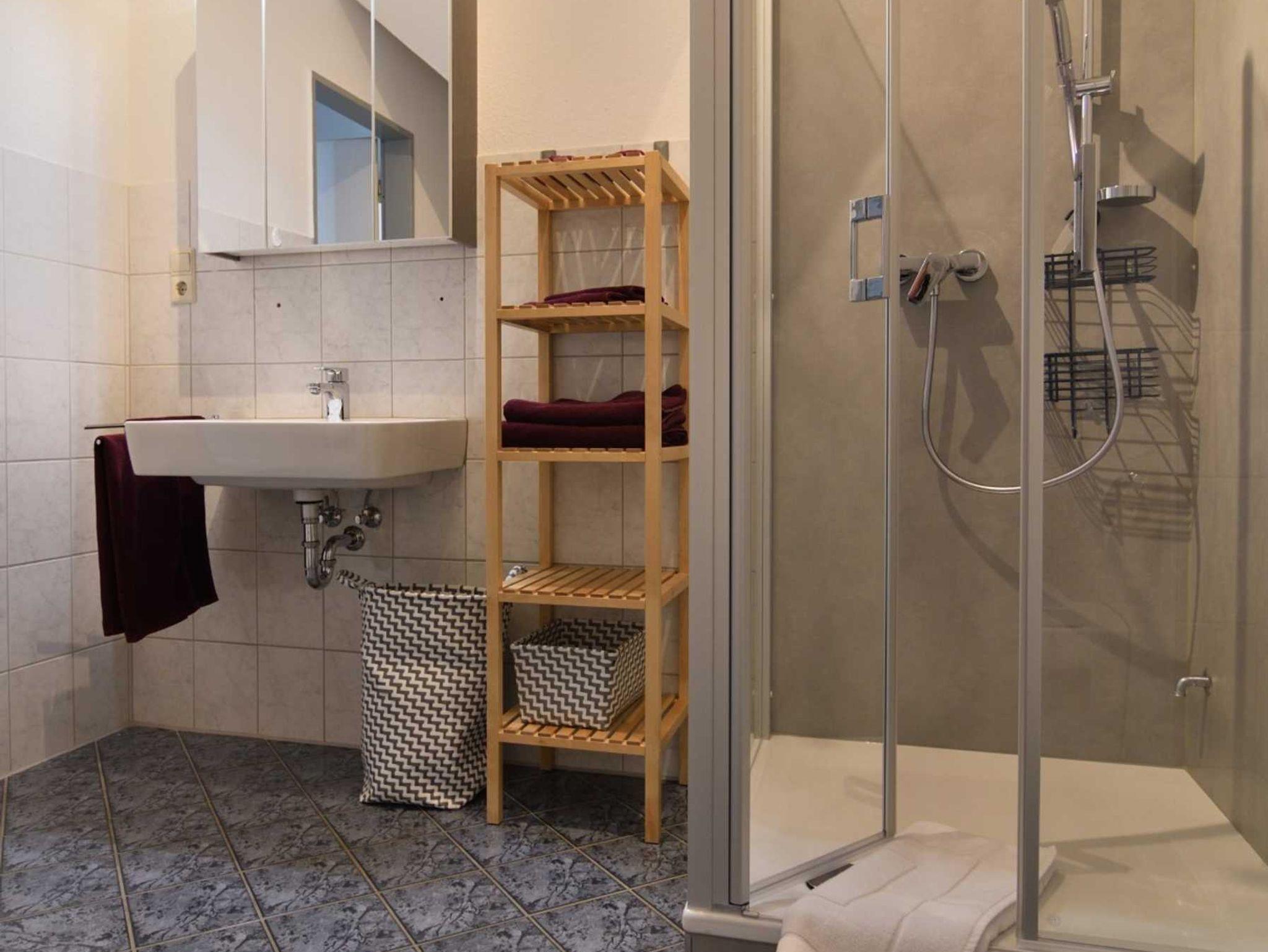 einem Doppelbett (180×200 cm) und einem Badezimmer mit Dusche.