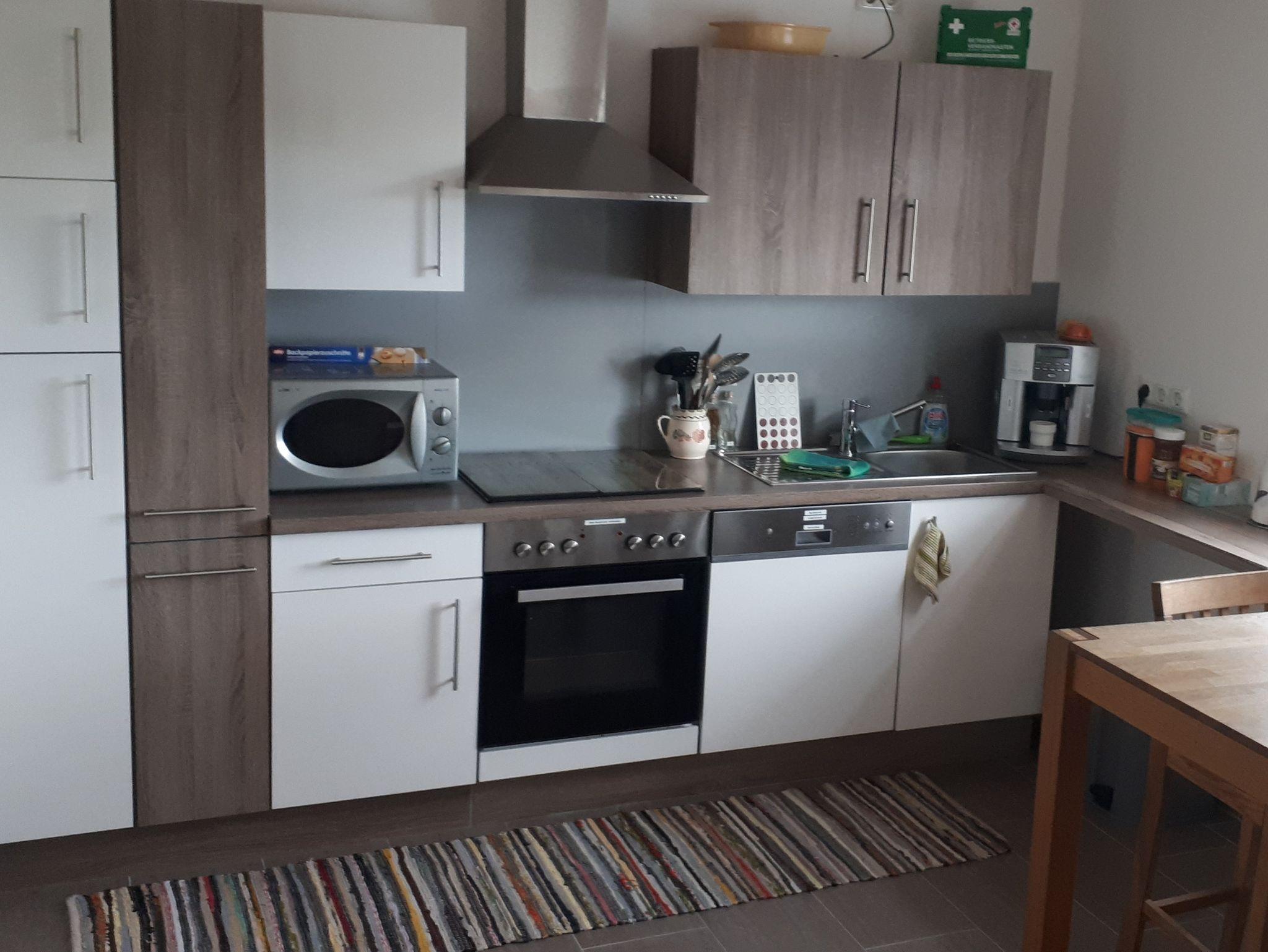 Die Gemeinschaftsküche ist mit einem Backofen, Herd, Kühlschrank mit Gefrierfach, Spülmaschine, Wasserkocher,