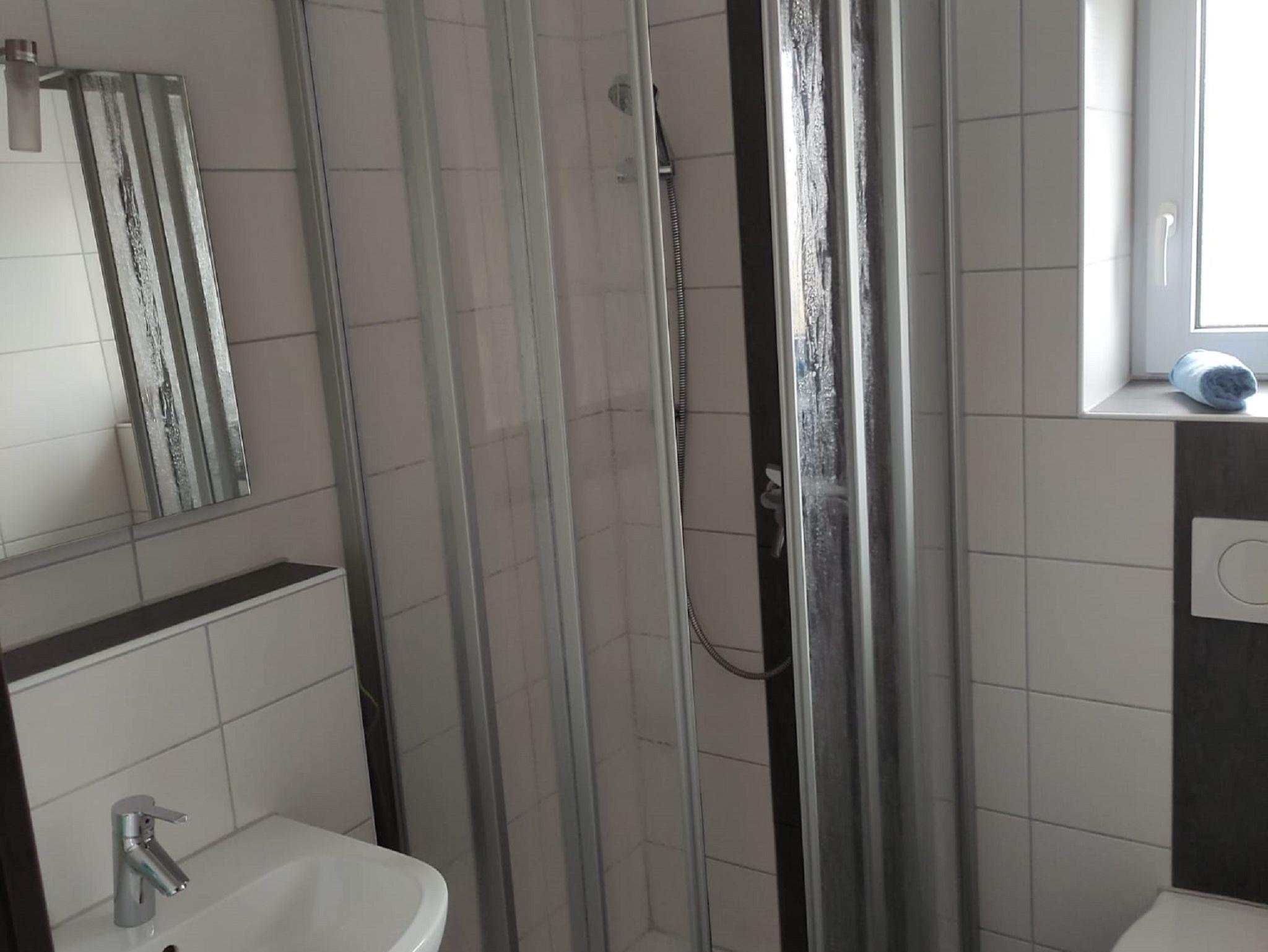 Es befindet sich eine Dusche/WC mit Fenster separat im Zimmer.