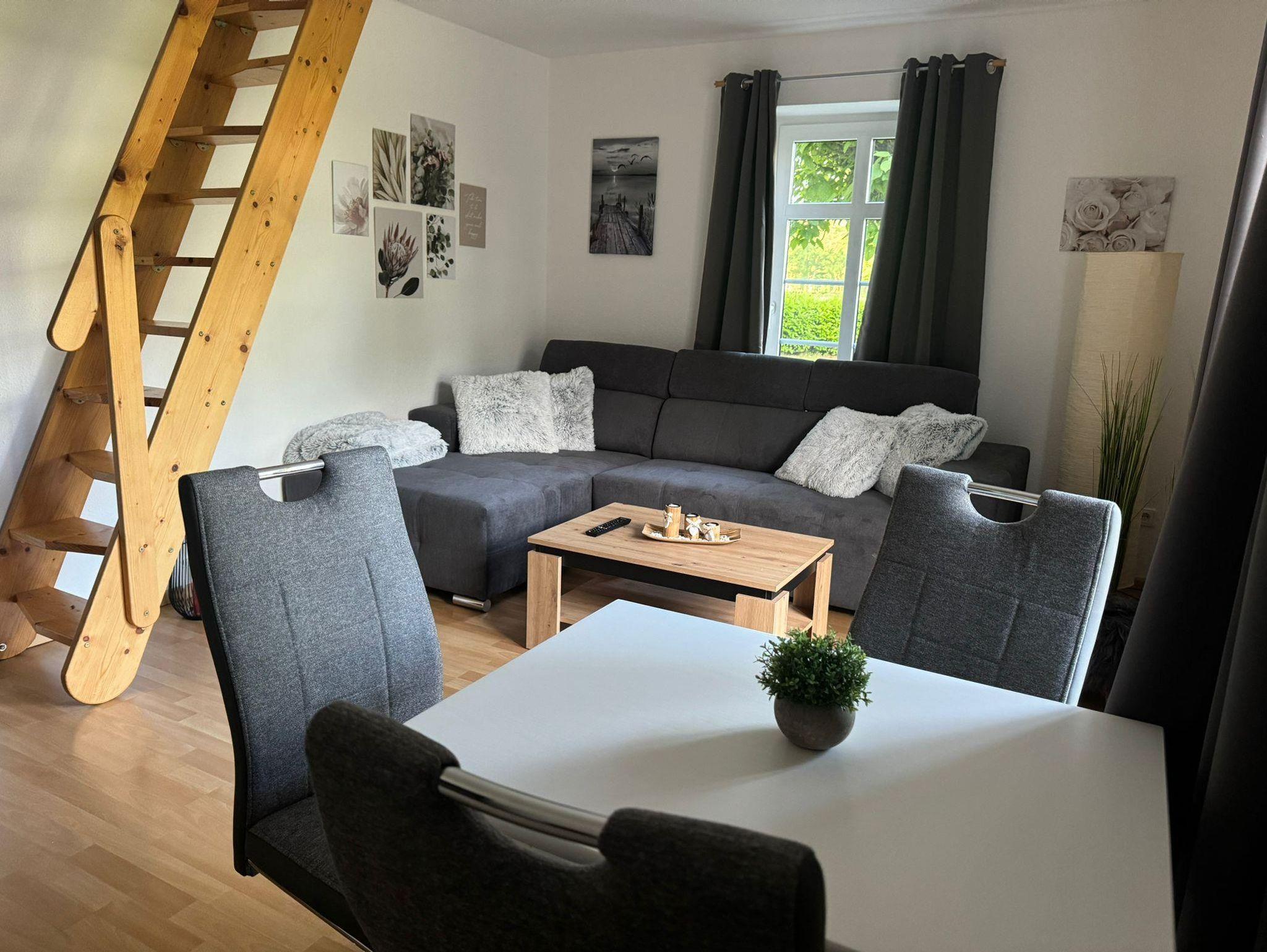 75 m² große Ferienwohung mit separatem Eingang. Im Erdgeschoss befindet sich ein gemütlicher Wohnbereich mit einer vollausgestatteten Küche mit Mikrowelle, Ess- und Wohnbereich mit SAT/TV. Badezimmer mit Dusche und WC, sowie 1 Schlafzimmer mit Doppelbett. Bitte beachten Sie, dass das zweite Schlafzimmer nur über eine schmale Raumspartreppe zu erreichen ist, dort befindet sich noch ein Einzelbett.