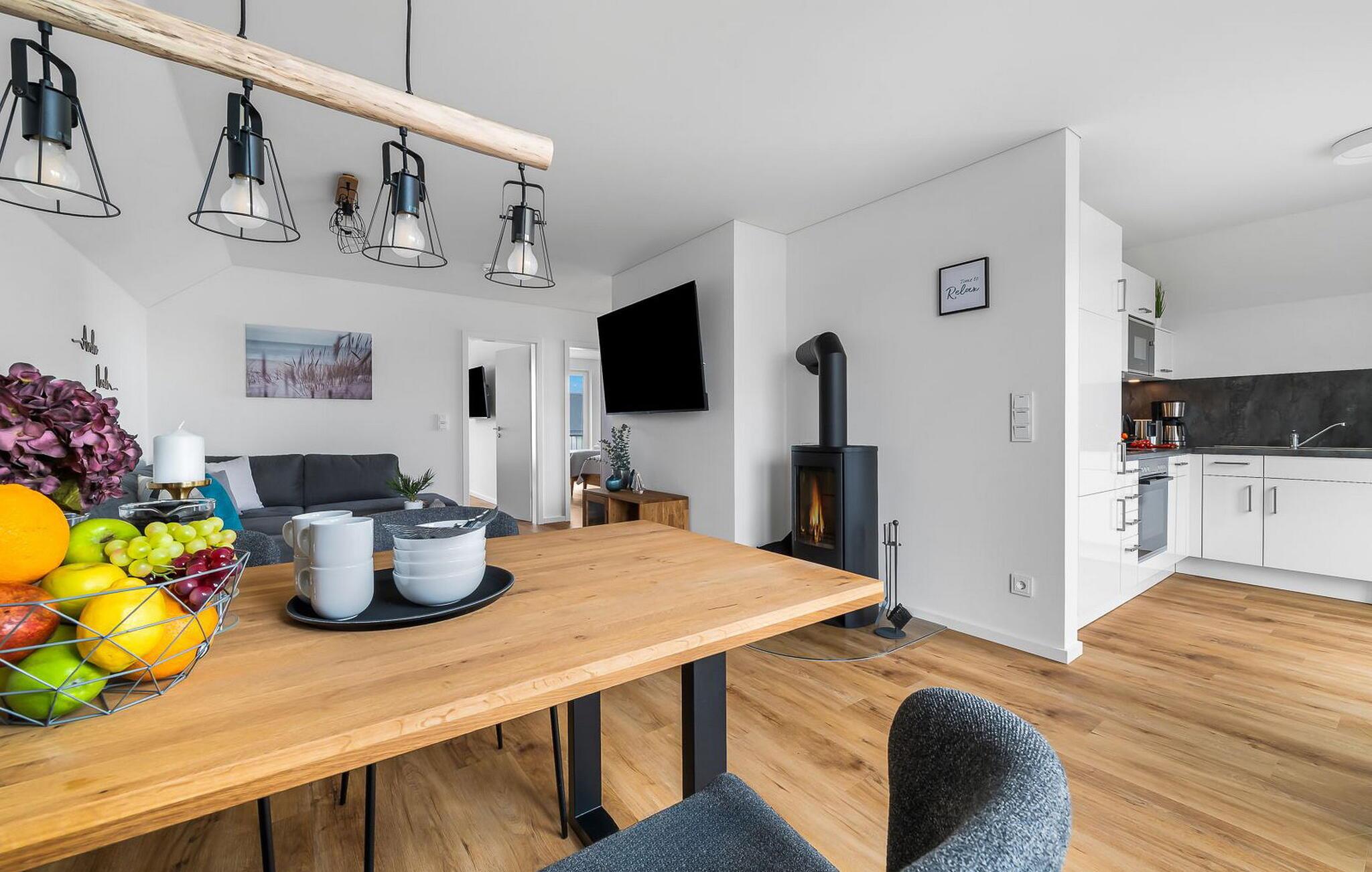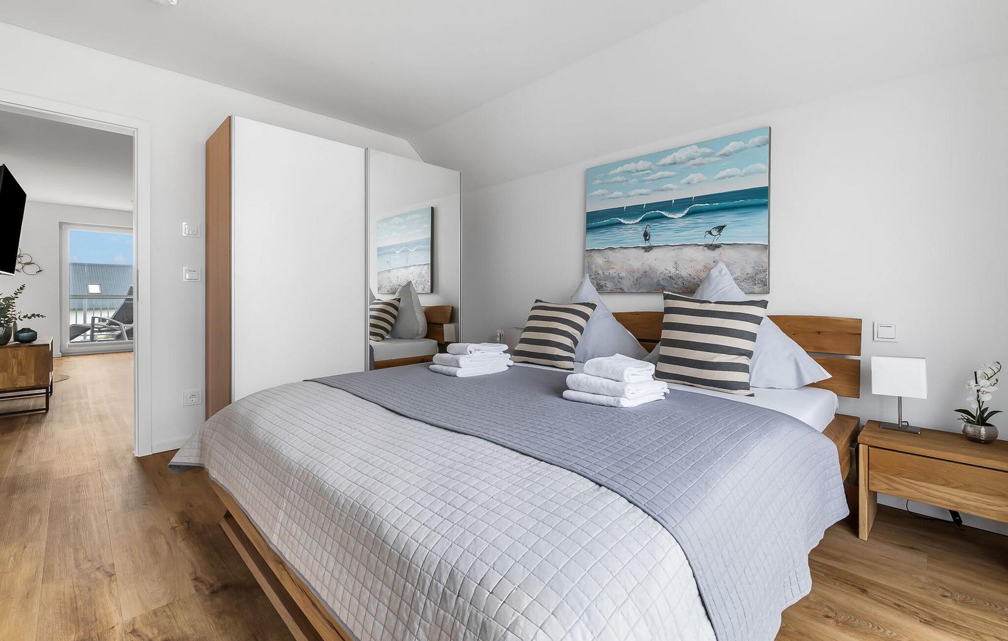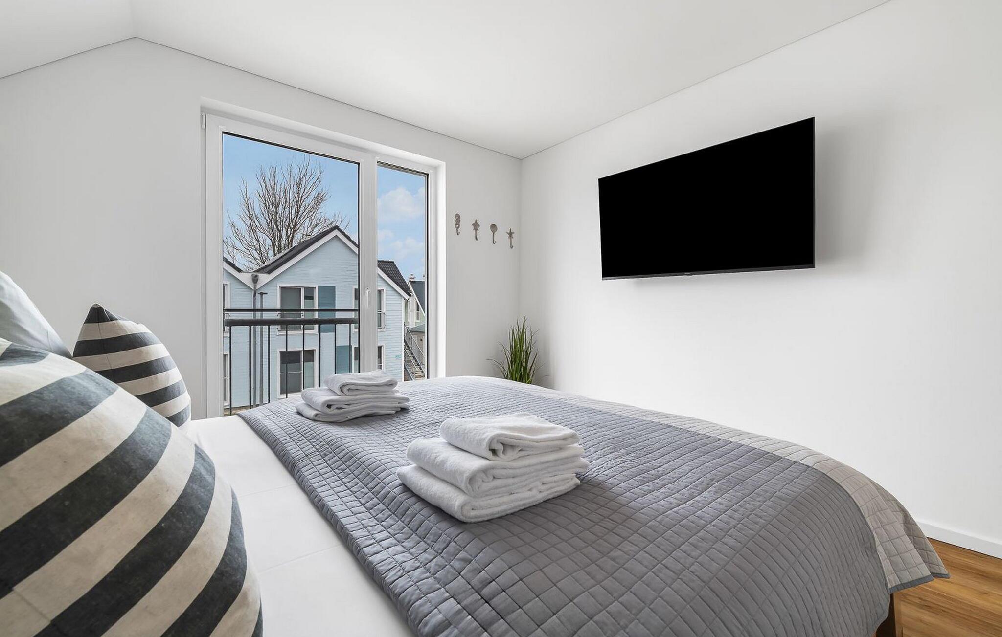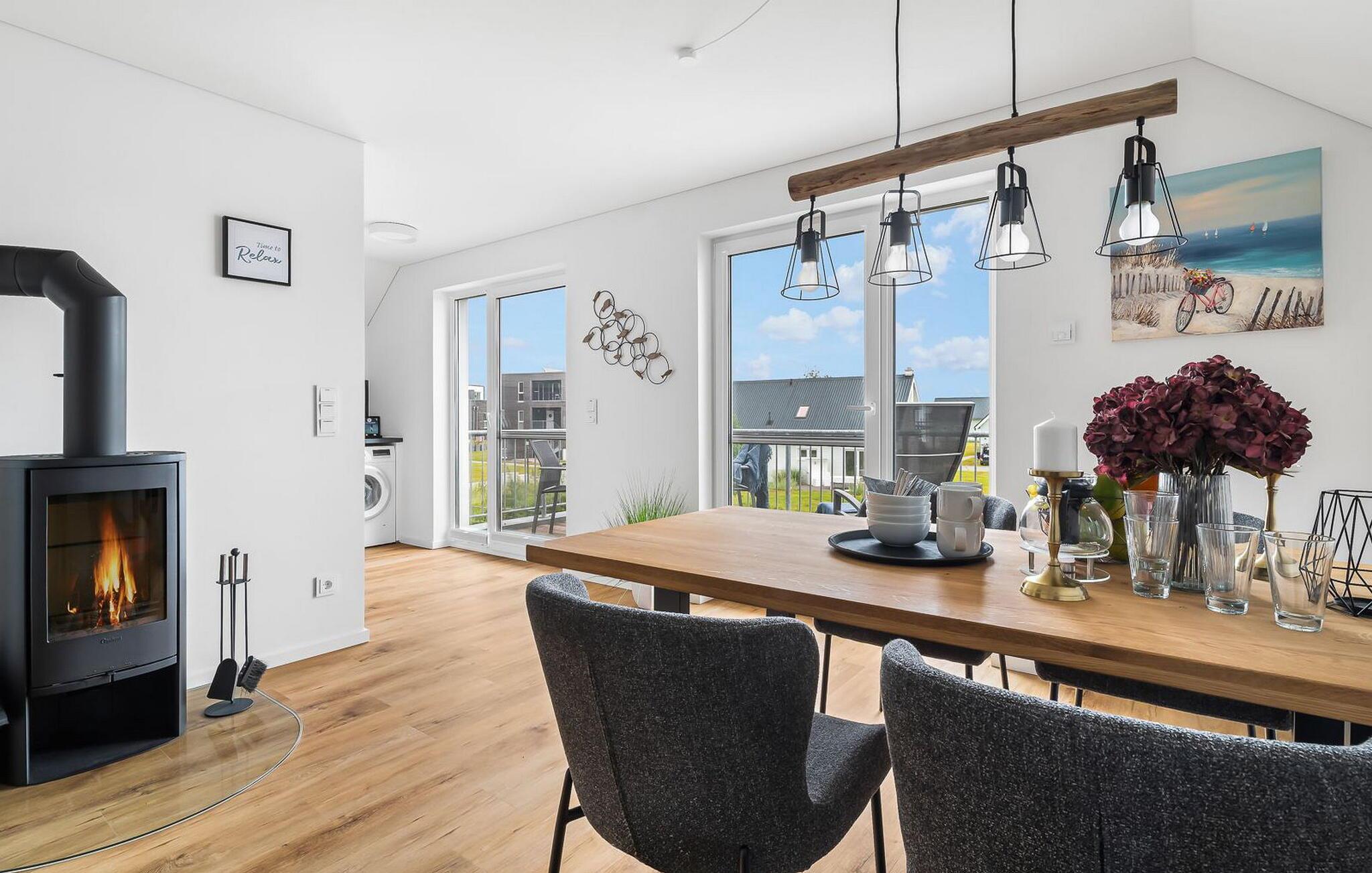 Denne ekstraordinære ferielejlighed på første sal imponerer med sin maritime æstetik og moderne interiør, kombineret med rustikt egetræ og antracitfarvede metalelementer. Billeder og puder i en beroligende benzintone sætter accenter og skaber en harmonisk atmosfære. Nyd den uforlignelige udsigt over havet fra begge rummelige terrasser og oplev en førsteklasses ferieoplevelse i gåafstand fra den livlige havnepromenade.