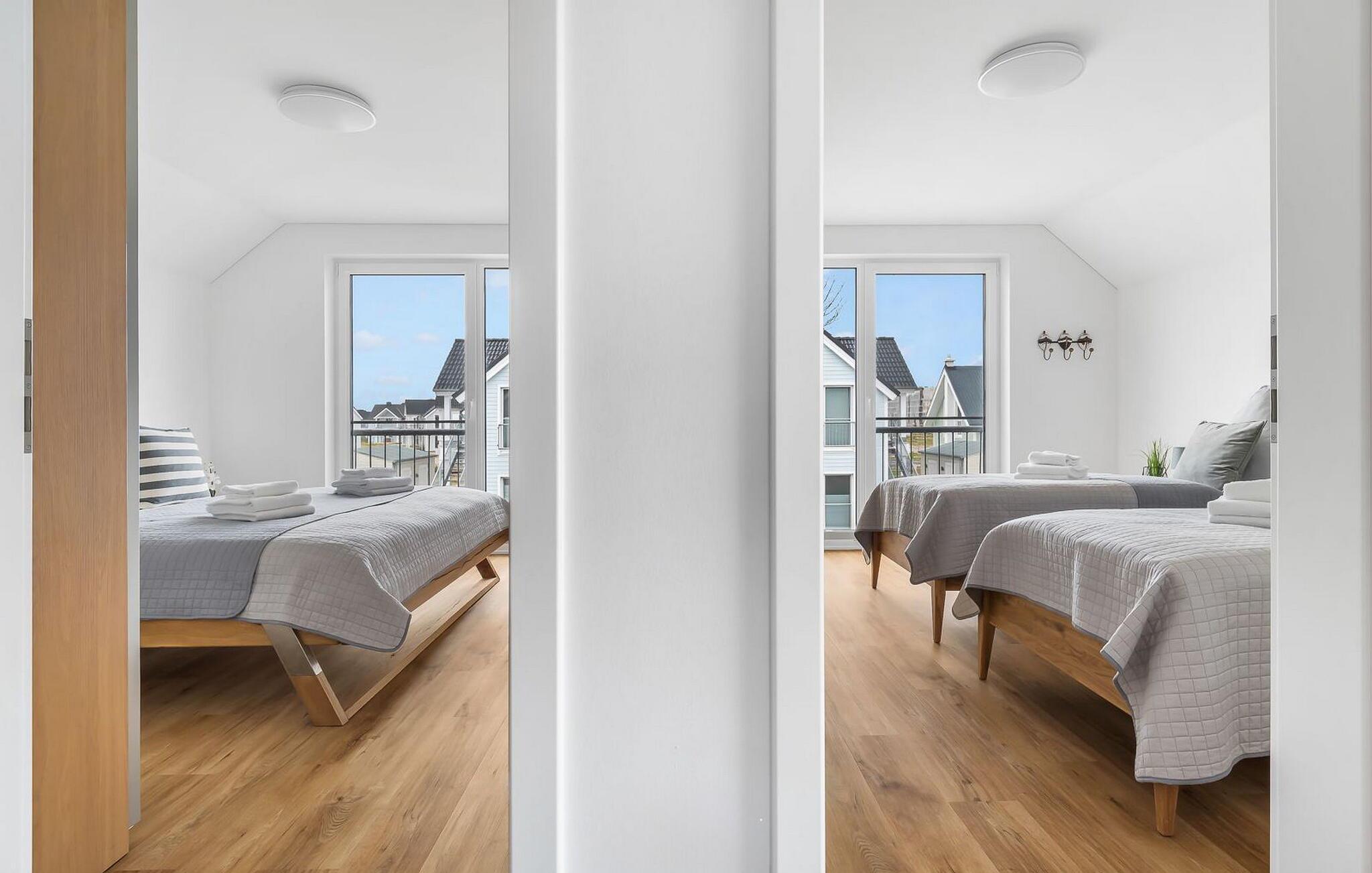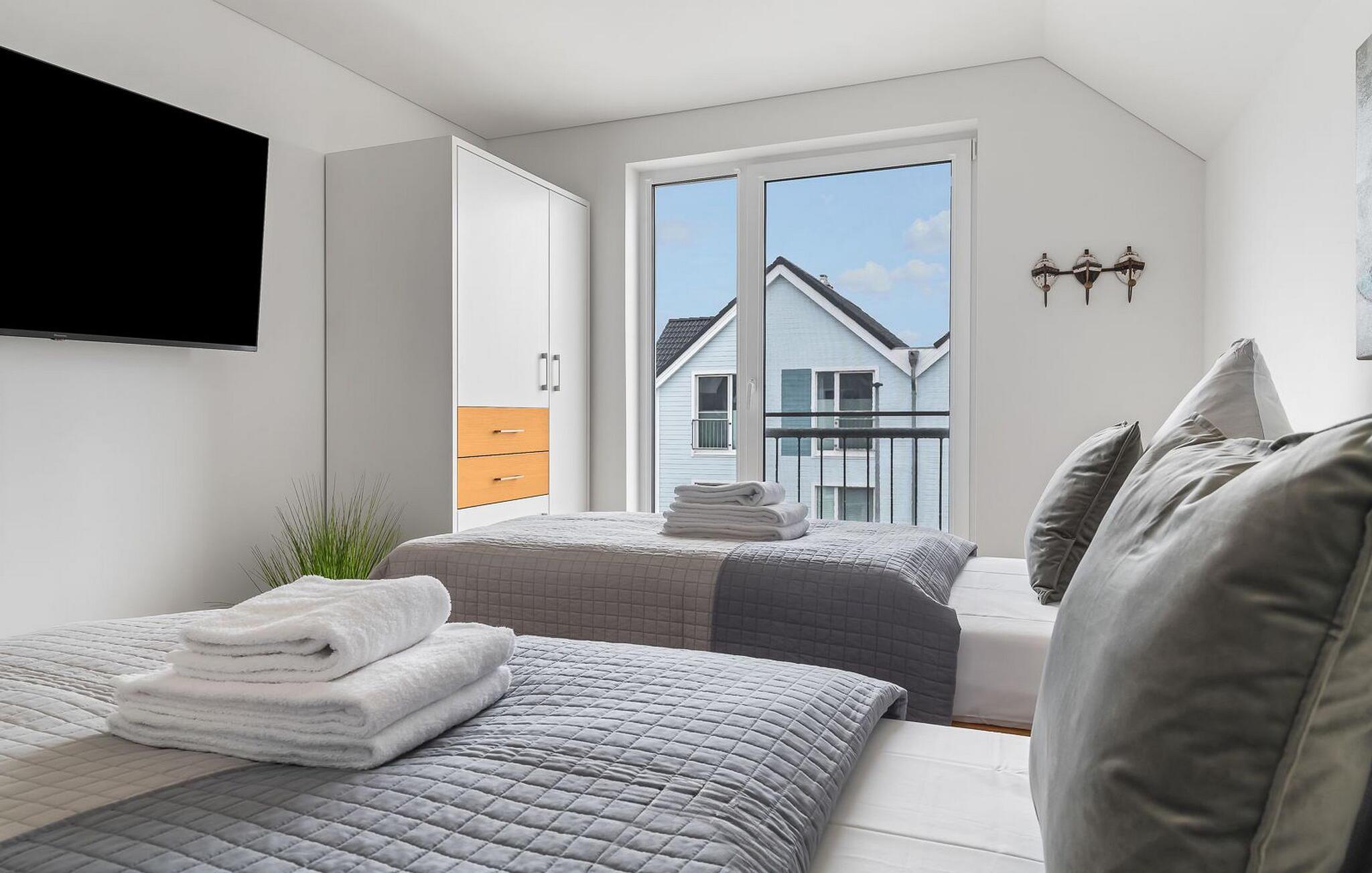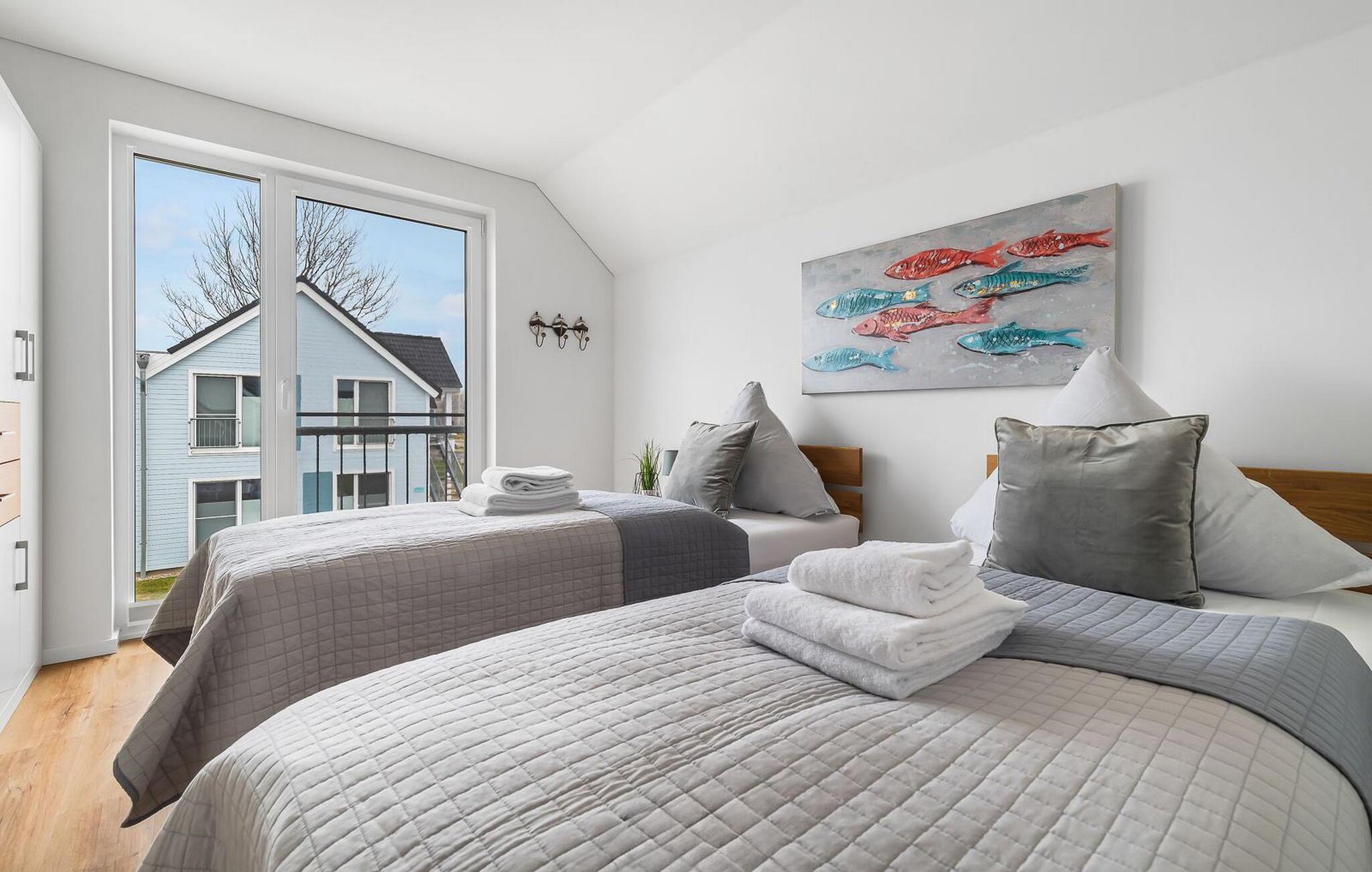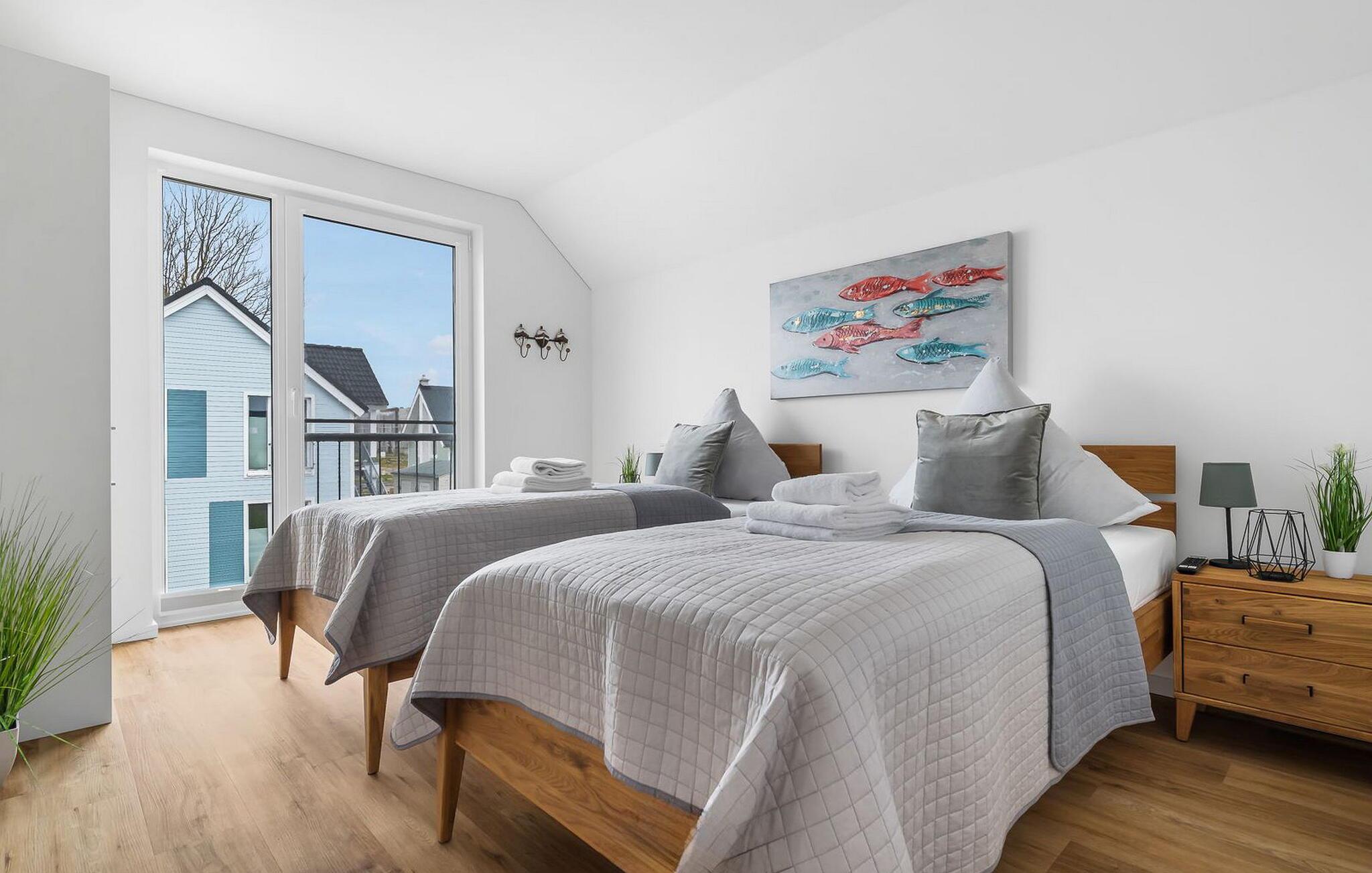 Denne ekstraordinære ferielejlighed på første sal imponerer med sin maritime æstetik og moderne interiør, kombineret med rustikt egetræ og antracitfarvede metalelementer. Billeder og puder i en beroligende benzintone sætter accenter og skaber en harmonisk atmosfære. Nyd den uforlignelige udsigt over havet fra begge rummelige terrasser og oplev en førsteklasses ferieoplevelse i gåafstand fra den livlige havnepromenade.
