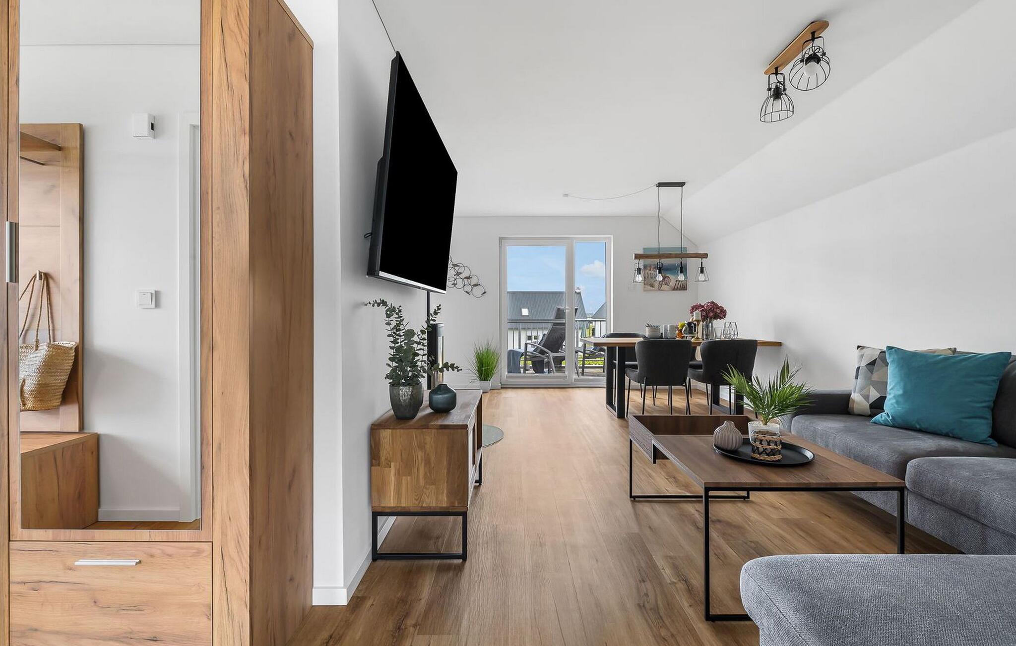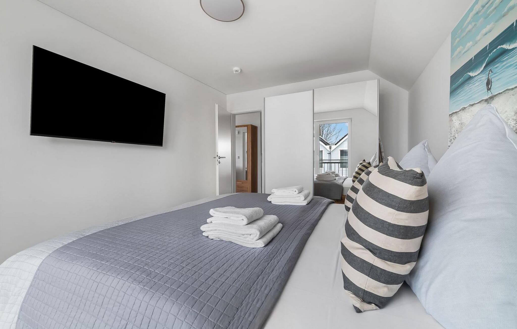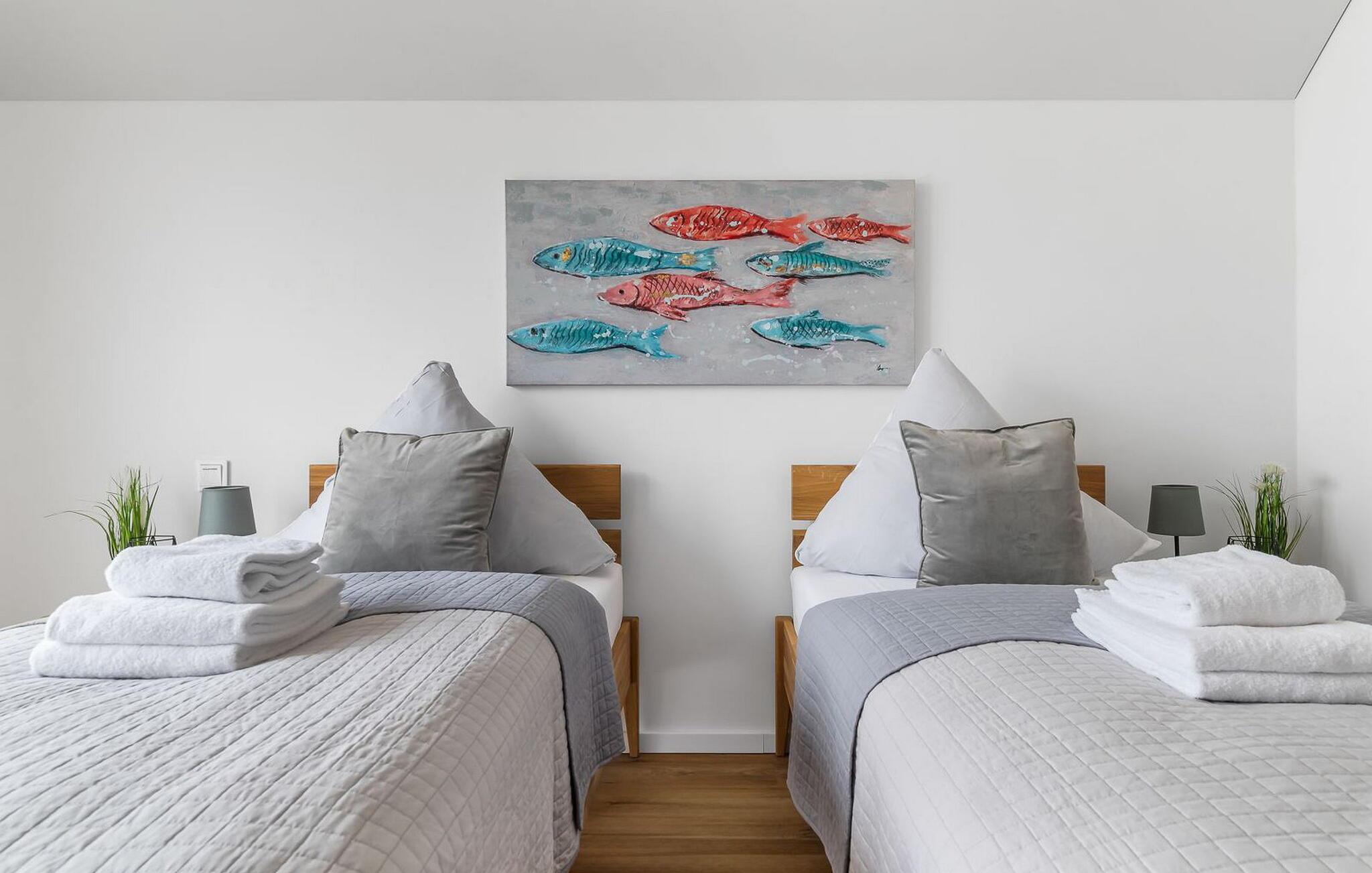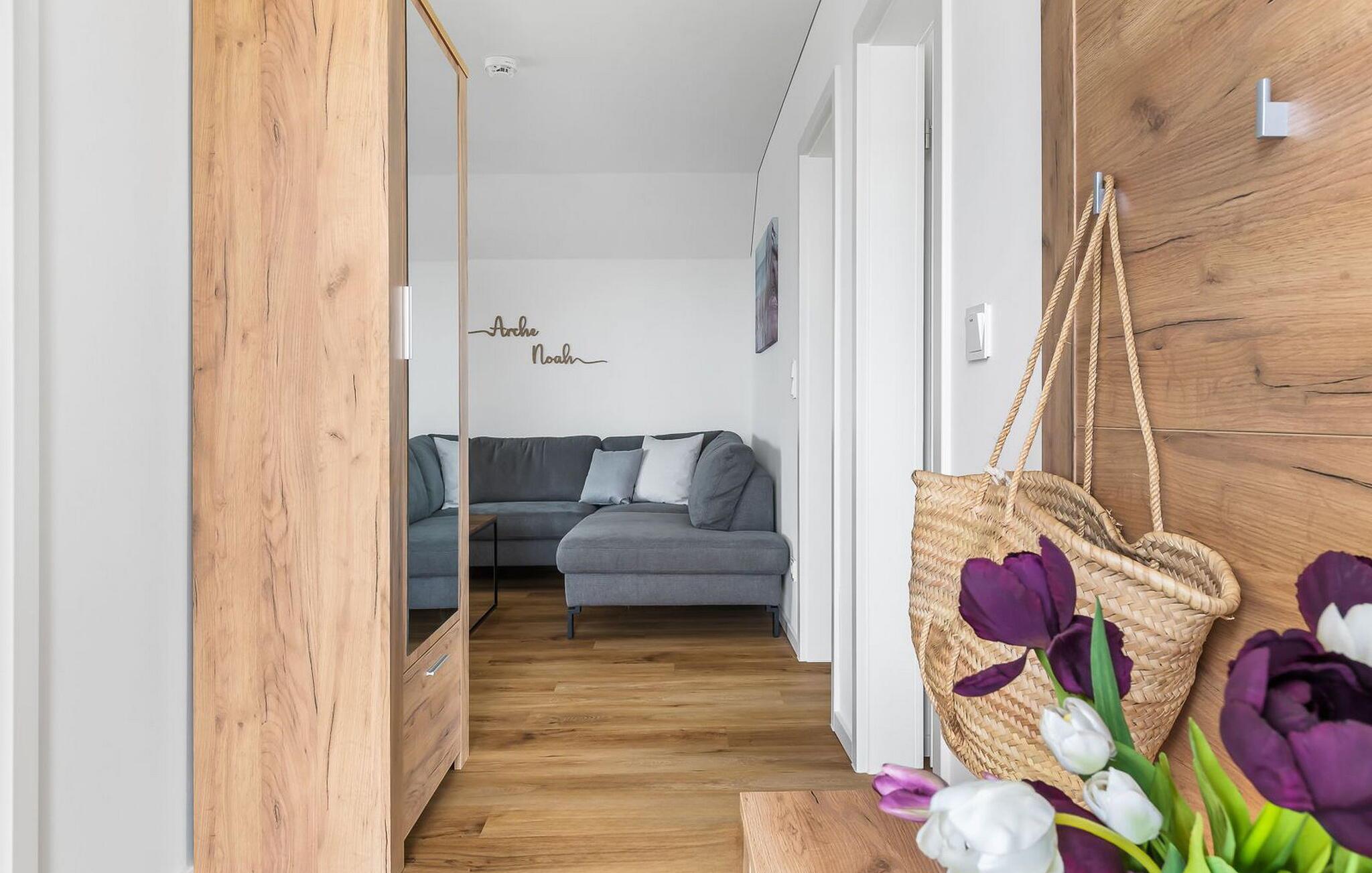 Denne ekstraordinære ferielejlighed på første sal imponerer med sin maritime æstetik og moderne interiør, kombineret med rustikt egetræ og antracitfarvede metalelementer. Billeder og puder i en beroligende benzintone sætter accenter og skaber en harmonisk atmosfære. Nyd den uforlignelige udsigt over havet fra begge rummelige terrasser og oplev en førsteklasses ferieoplevelse i gåafstand fra den livlige havnepromenade.