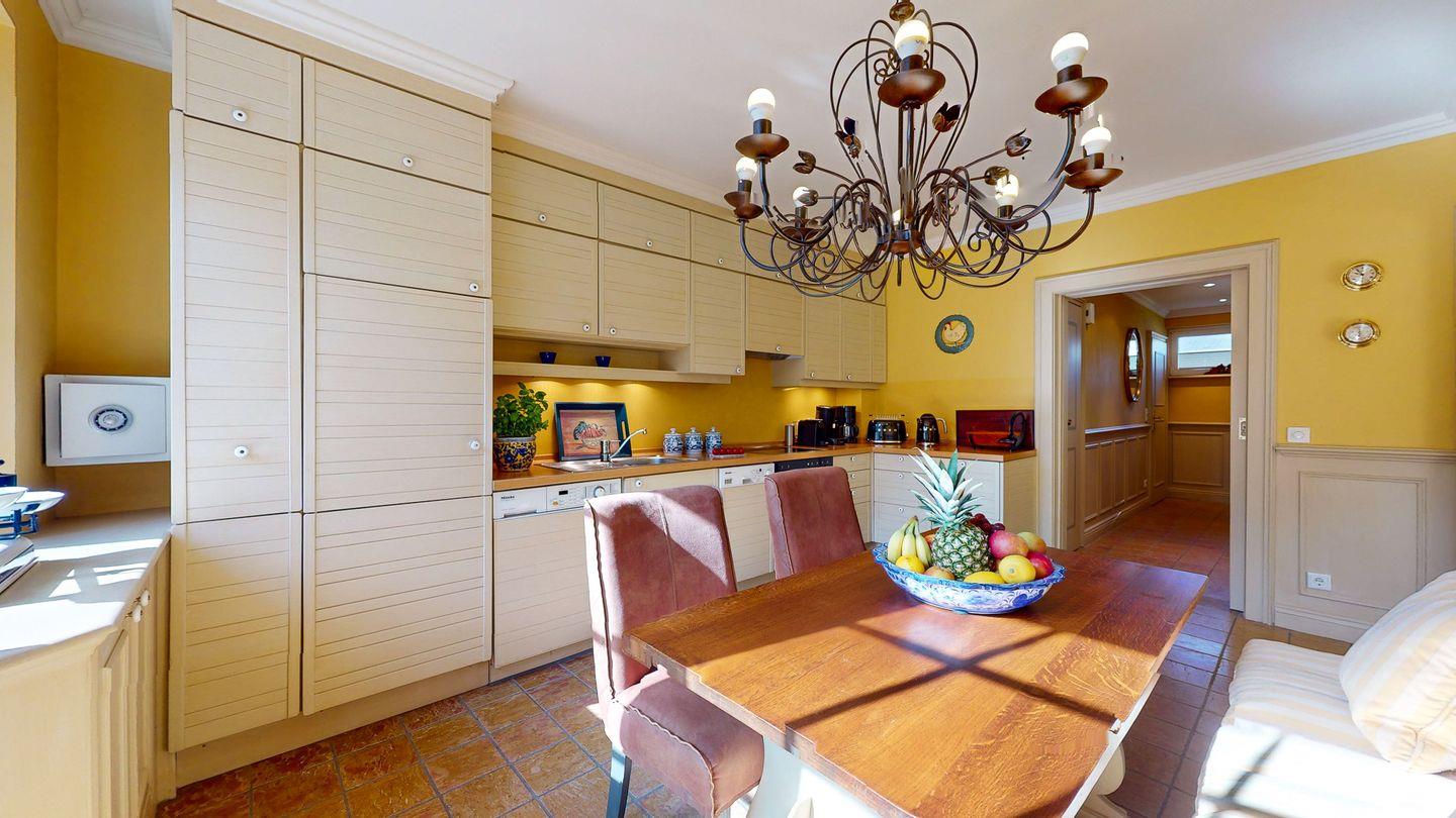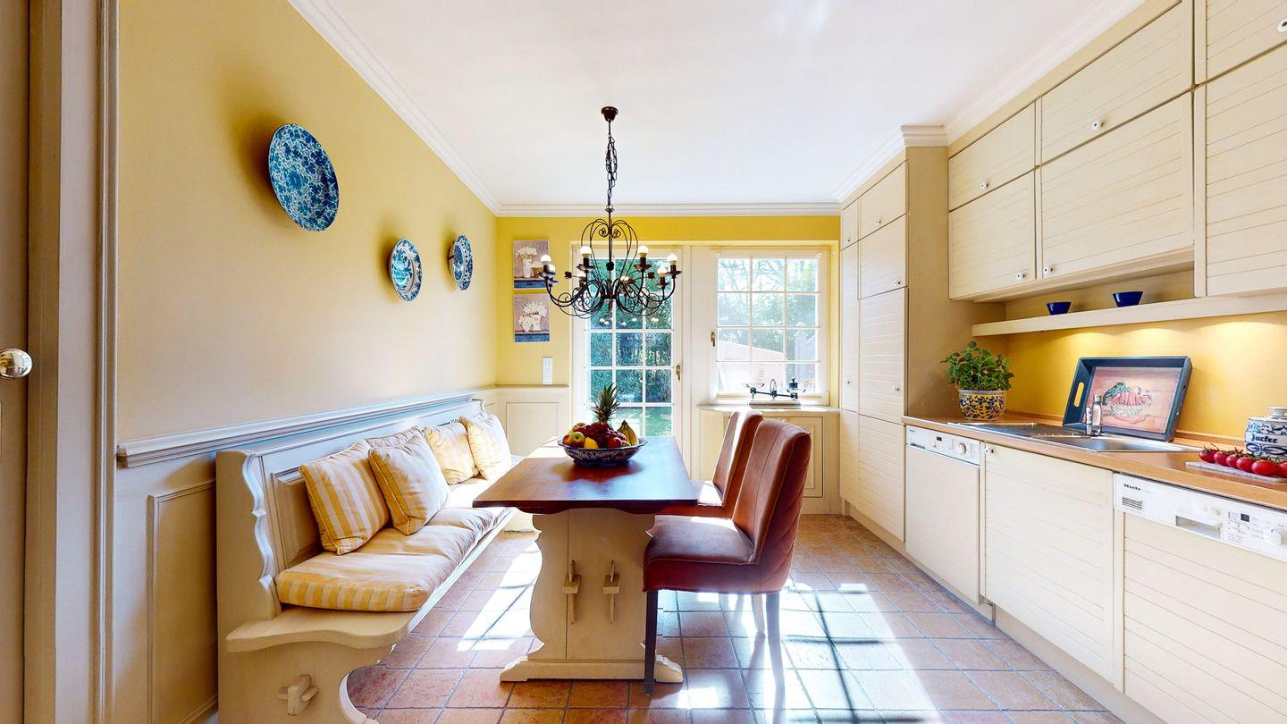 Die geräumige, vollausgestattete Küche mit großem Essbereich lädt zum gemütlichen Kochabend ein.
