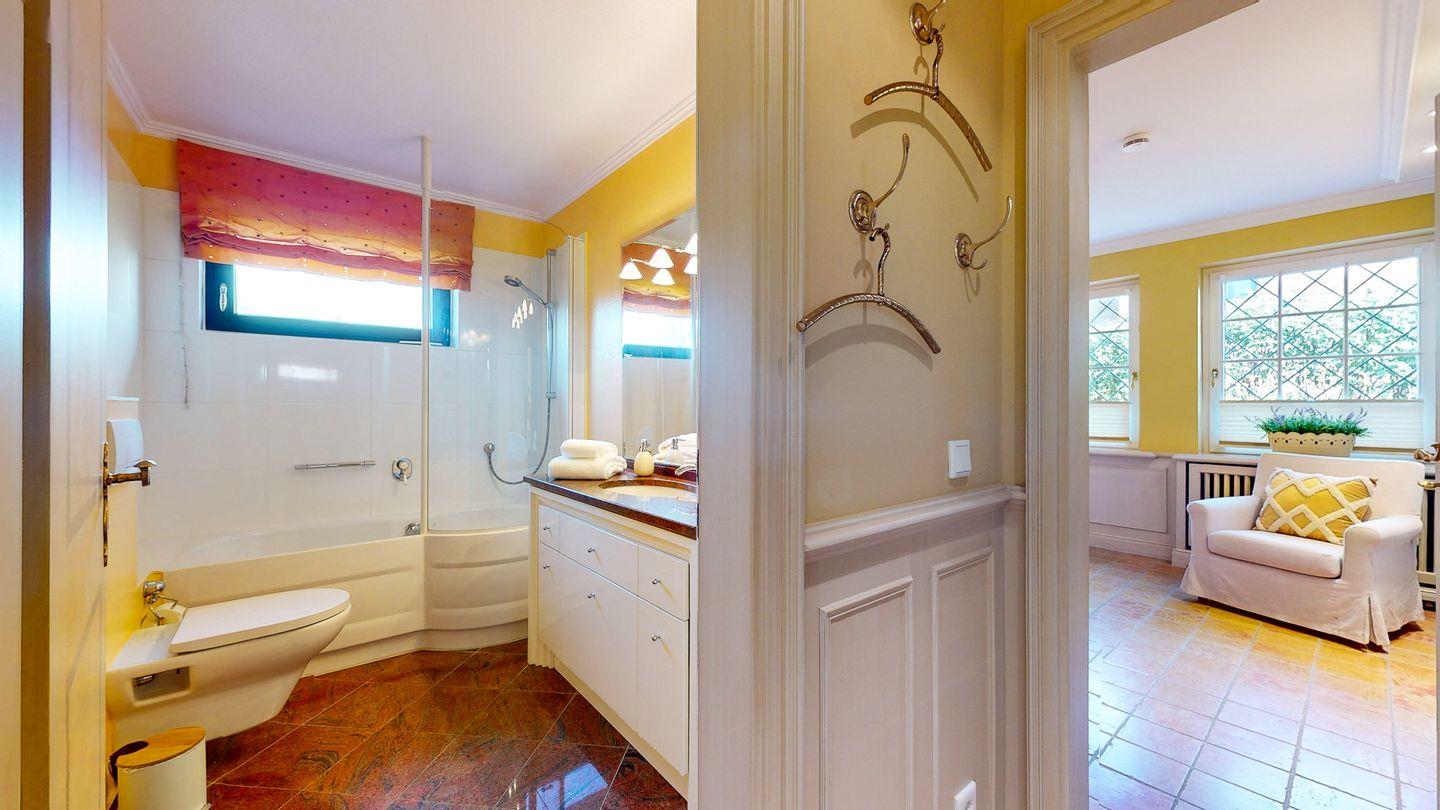 Besonders hervorzuheben ist das großzügige Tageslichtbad mit großem Waschtisch und einer Badewanne mit integrierter Dusche.