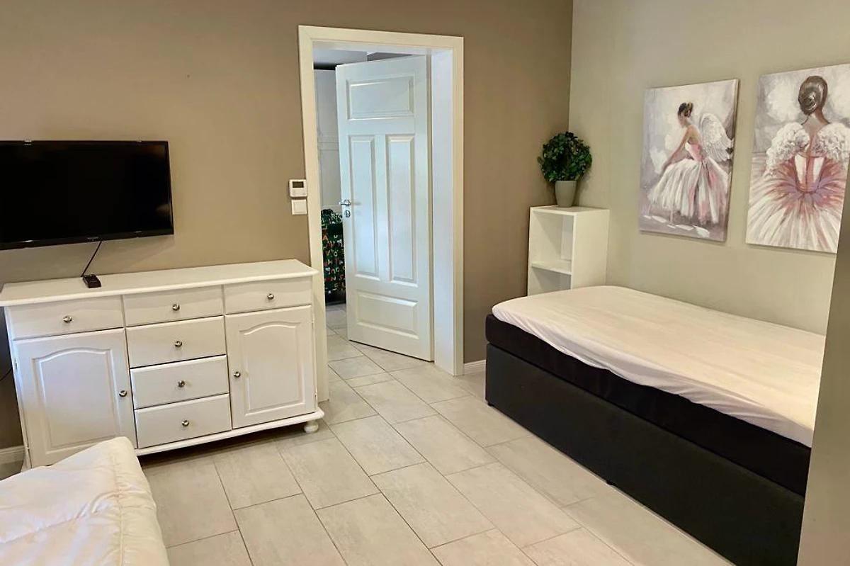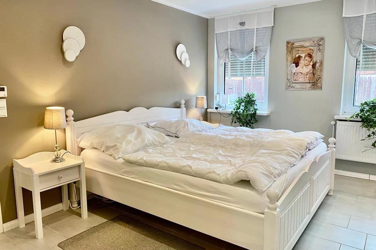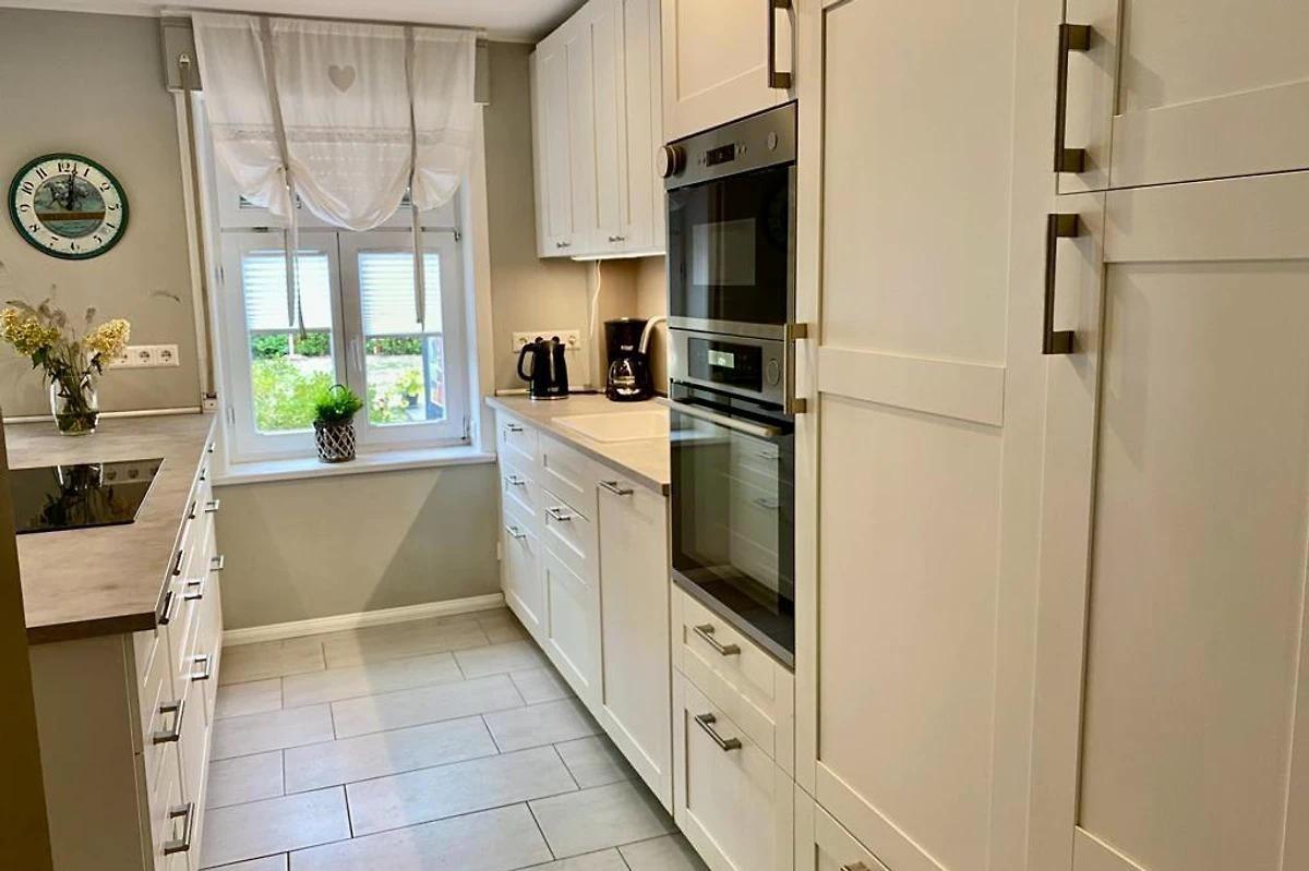 Eine besondere Wohnung im EG wo es einem garantiert an nichts fehlt. Die Wohnstube mit sehr großem FLAT TV mit ambilight und einer kuscheligen Sofaecke (lädt dazu ein, die Abende vor dem knisternden Kaminfeuer zu verbringen). Besonders ist bei dem Tunnelkamin, dass Sie auch aus der luxuriösen Küche das wärmende Lodern der Flammen genießen dürfen. Die sehr hochwertige Küche ist mit einer schönen Kochinsel mit großen Induktionsfeld, Mikrowelle, Geschirrspüler, Backofen mit Dampf....allen Kochutensilien, Küchengeräten und einer gemütlichen Sitzgruppe ausgestattet. In den 2 Schlafzimmern befinden sich jeweils FLAT TV Geräte und Boxspringbetten, so dass man auch hier den Abend bei einem guten Film ausklingen lassen kann. In einem Schlafzimmer ist ein 180x200 Meter großes Bett und in dem anderen befinden sich zwei Einzelbetten. Das Badezimmer mit sehr großer Dusche, WC, Waschtisch und Whirlpoolbadewanne (Whirl-, Air- und Farblichttherapie) ist von beiden Schlafzimmern direkt begehbar. Alle Räume lassen sich durch Aussen Jalousien komplett verdunkeln und in jedem Raum gibt es ein Fliegengitter um keine ungewollten Gäste beherbergen zu müssen. Weiterhin gibt es noch ein separates Gäste WC und die Nutzung von Waschmaschine und Trockner sind möglich. Eine wirklich exklusive Wohnung mit zusätzlicher Fußbodenheizung die liebevoll ausgestattet ist und wo es einem an nichts fehlen wird. Selbst die große Terrasse vor der Küche ist wundervoll und es kann durchaus passieren, dass hier mal ein Huhn GUTEN MORGEN wünscht oder eine unser Katzen nach dem rechten sieht. Hier beginnt man den Tag am besten mit einem leckeren Frühstück oder liest auf einer der 2 Gartenliegen ein spannendes Buch. Selbstverständlich ist ein PKW Stellplatz vor Ort vorhanden.