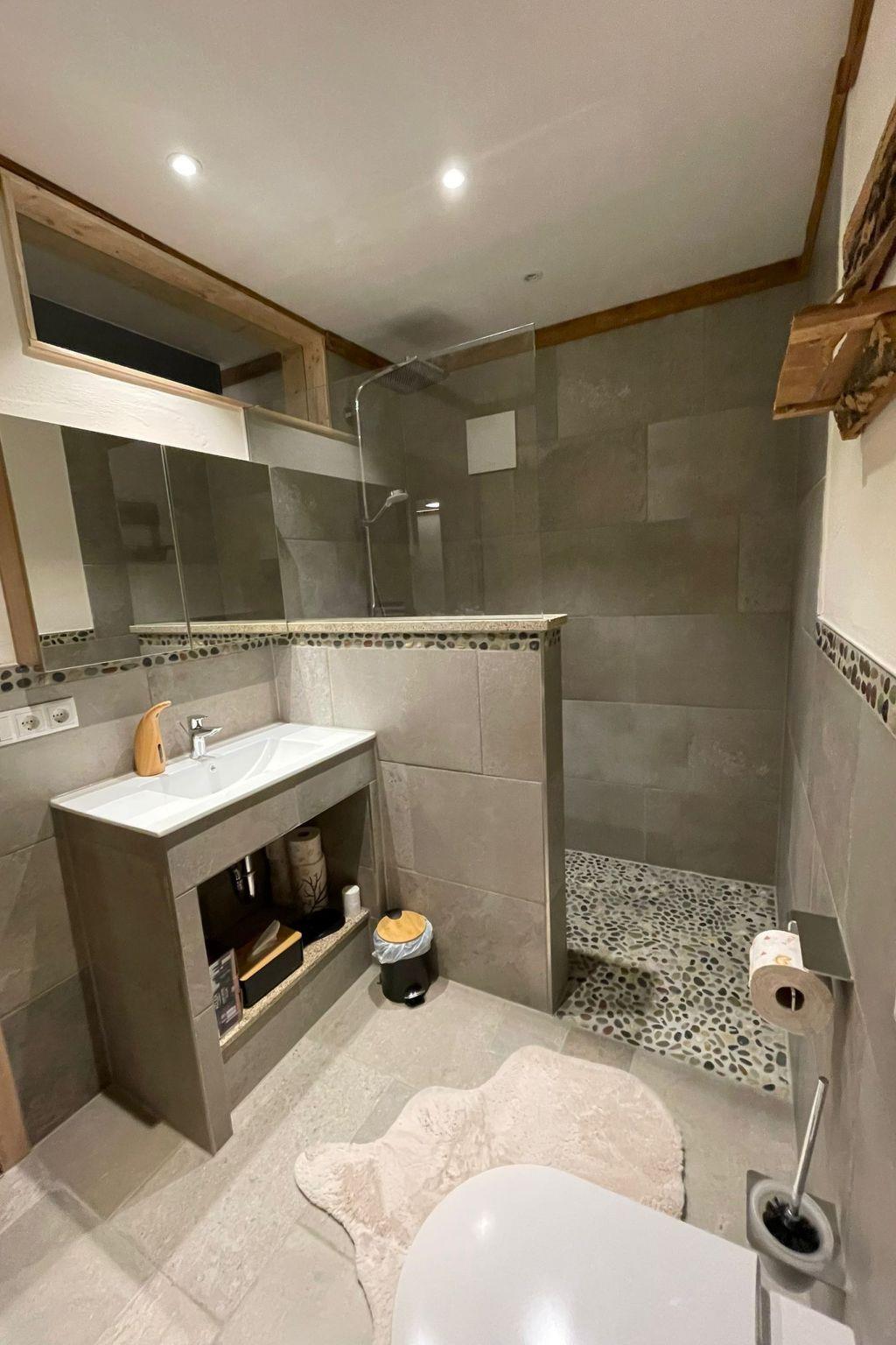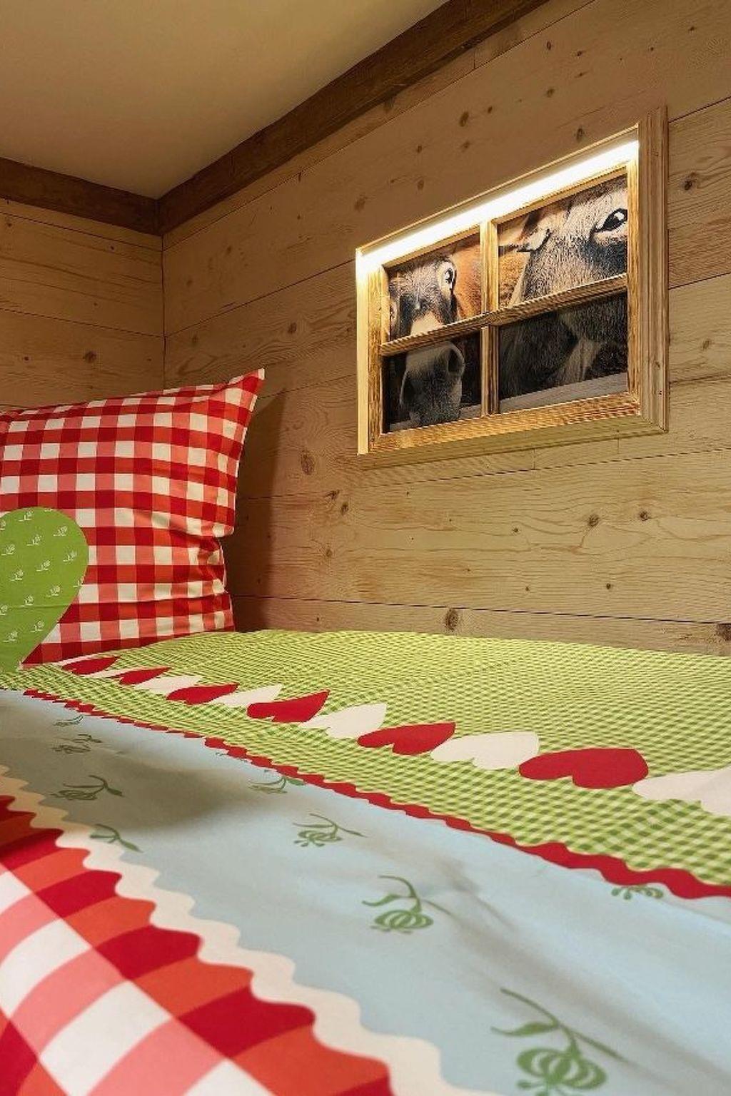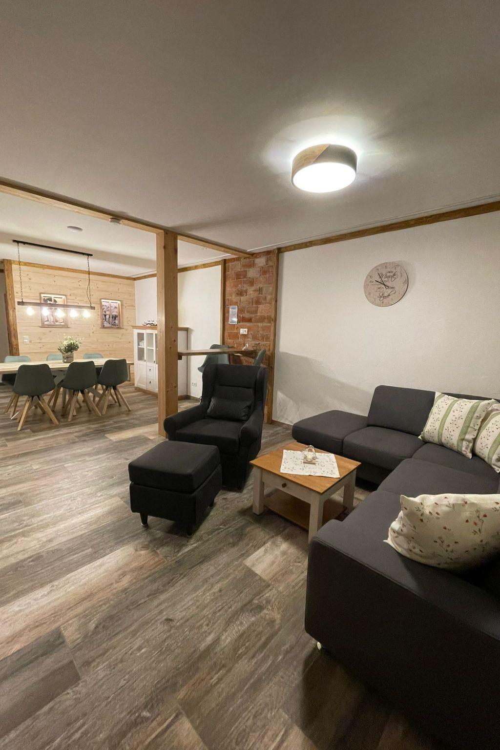 Have fun in this stylish accommodation, whether as a family, with friends or just the two of you, if you prefer large rooms and two bedrooms. The flat is called "Zirbe" because it is furnished with Swiss stone pine wood in the bedrooms, the perfect basis for a dreamy sleeping environment. A private infrared sauna and a whirlpool bath also ensure a wellness holiday and stress relief within your own four walls! We have furnished this flat with lots of love and wood in a traditional Bavarian modern style with matching furniture, crockery and accessories. The open-plan living room is furnished with a comfortable pull-out sofa, wing chair and footstool, a cosy reading corner by the electric fireplace, a 65-inch flat-screen TV and a bar where you can also work with your laptop. The cosy dining area is furnished with a large dining table, 6 chairs and a display cabinet filled with crockery and glasses. A modern kitchenette fully equipped with pots and pans and appliances is of course also included. Both bedrooms have direct access to their own bathrooms. One bathroom is equipped with a whirlpool bath, shower, washbasin and WC. The other bathroom has a large walk-in shower, washbasin and WC. Each bathroom is equipped with a hairdryer, towels, bath towels and small toiletries for first-time use. In one bedroom there is a motorised adjustable double box-spring bed and a carpenter-made loft bed measuring 80x190cm. The second bedroom has two single box-spring beds, an additional 55-inch flat-screen TV and space for a king-size bed. Everything is provided in this flat, you only need your personal belongings, nothing else. - Bread roll service - Check in from 14.00h - Check out until 10.00h - Key handover on site Up to 2 dogs per accommodation unit are welcome!