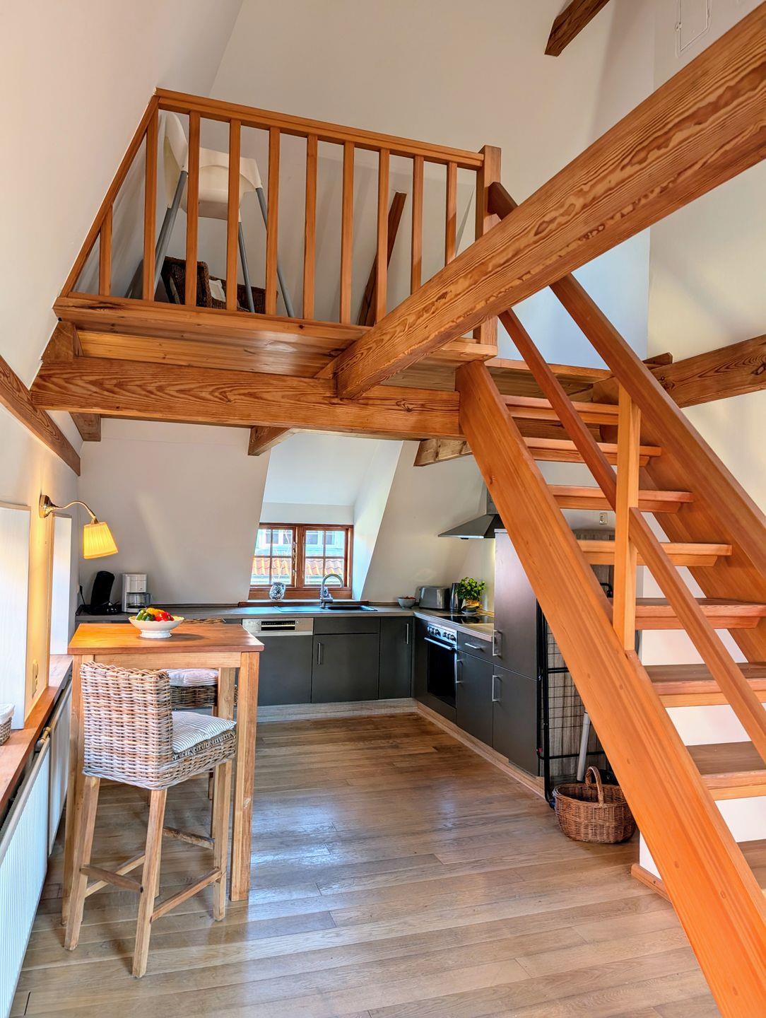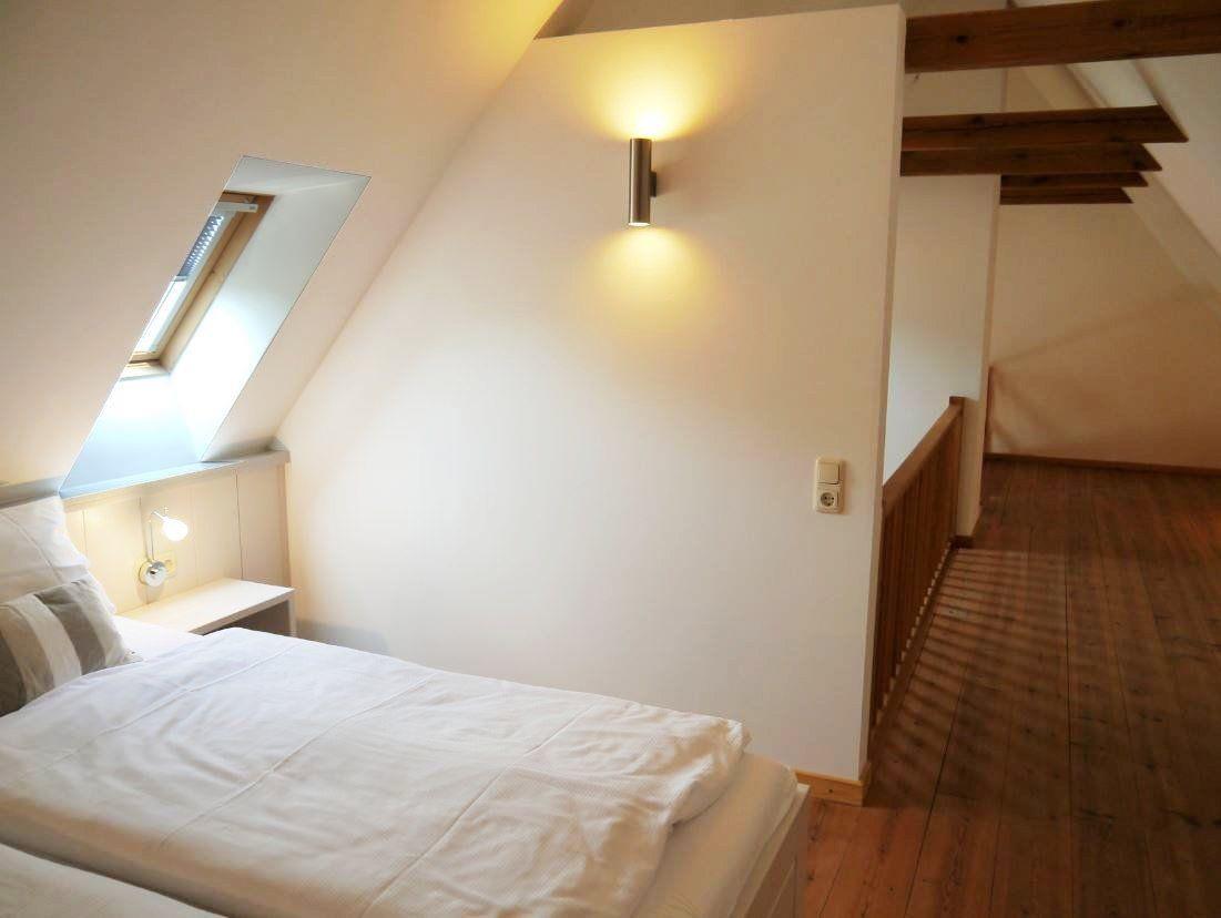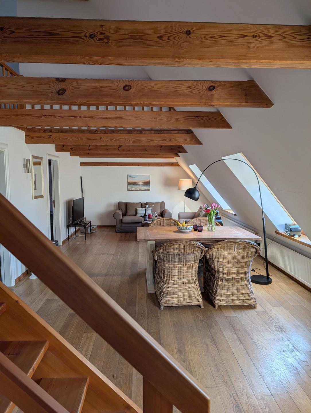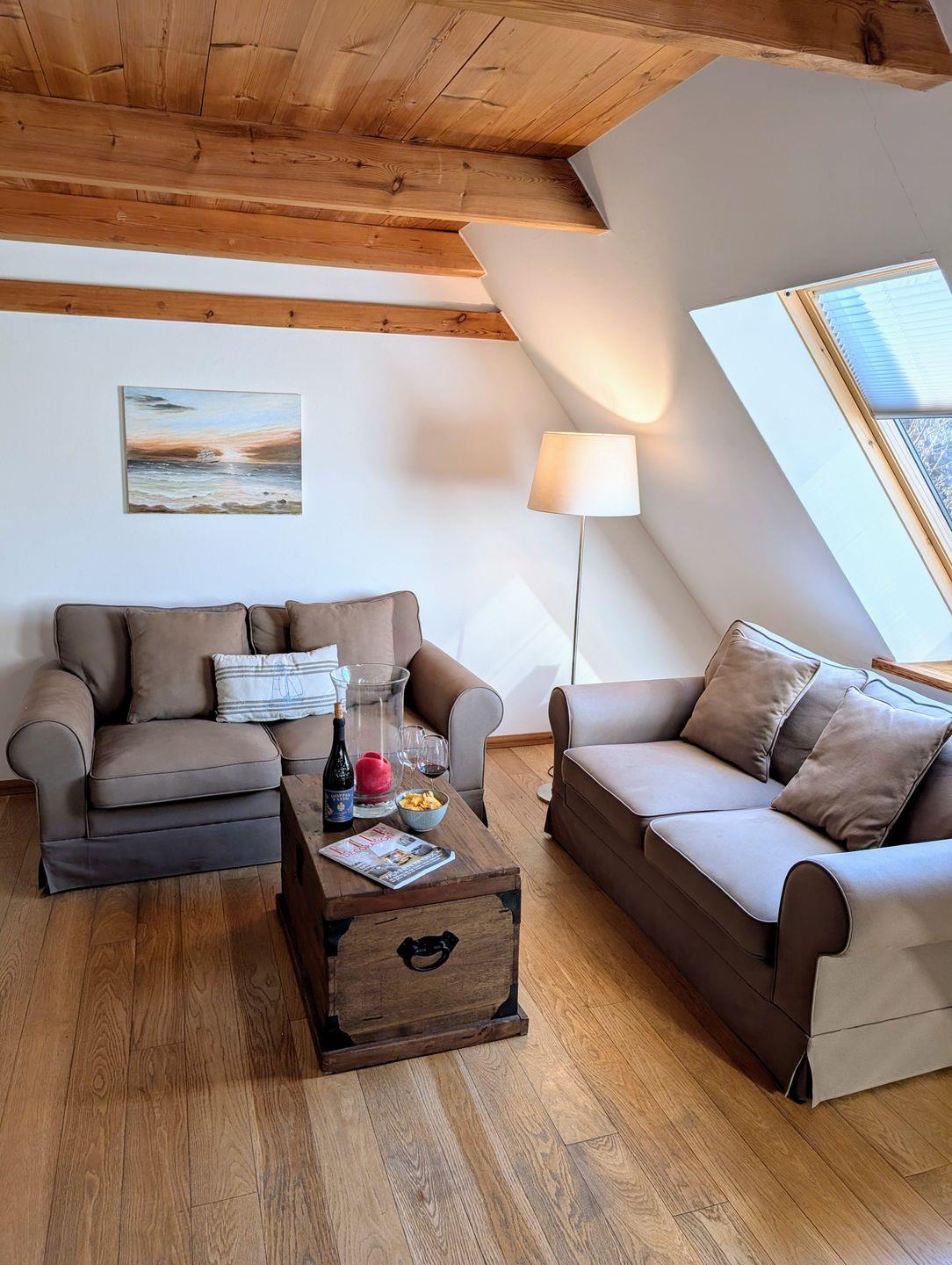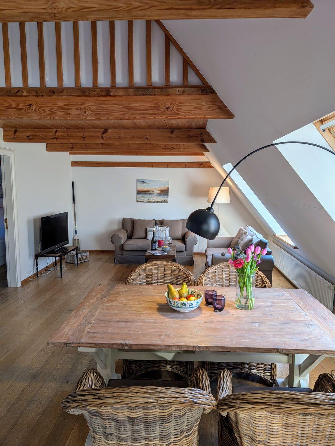 Die Ferienwohnung Skyerne im ersten Obergeschoss bietet auf ca. 80 qm ausreichend Platz für bis zu 4 Personen und garantiert einen unvergesslichen Urlaub. Die hochwertige Ausstattung sorgt für jeglichen Komfort, während große Velux-Fenster den Raum mit Licht durchfluten und einen schönen Blick in den Innenhof bieten.