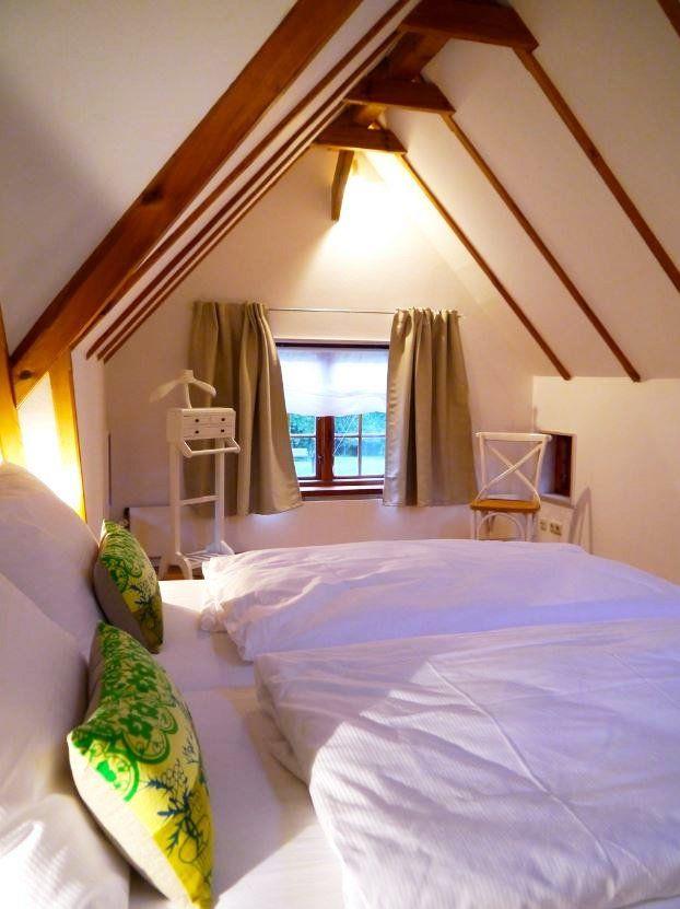 Das Ferienhaus verfügt über zwei gemütliche Schlafzimmer. Im Obergeschoss befindet sich das erste Schlafzimmer mit einem komfortablen Doppelbett (2x90x200 cm) und offenem Fußende, einem Kleiderschrank sowie Verdunklungsmöglichkeiten für erholsame Nächte. Das zweite Schlafzimmer im Erdgeschoss ist mit einem Etagenbett (80x200 cm) ausgestattet und bietet ausreichend Stauraum durch einen Kleiderschrank.