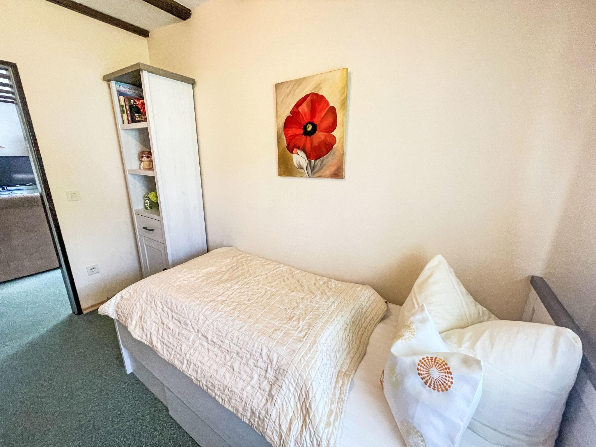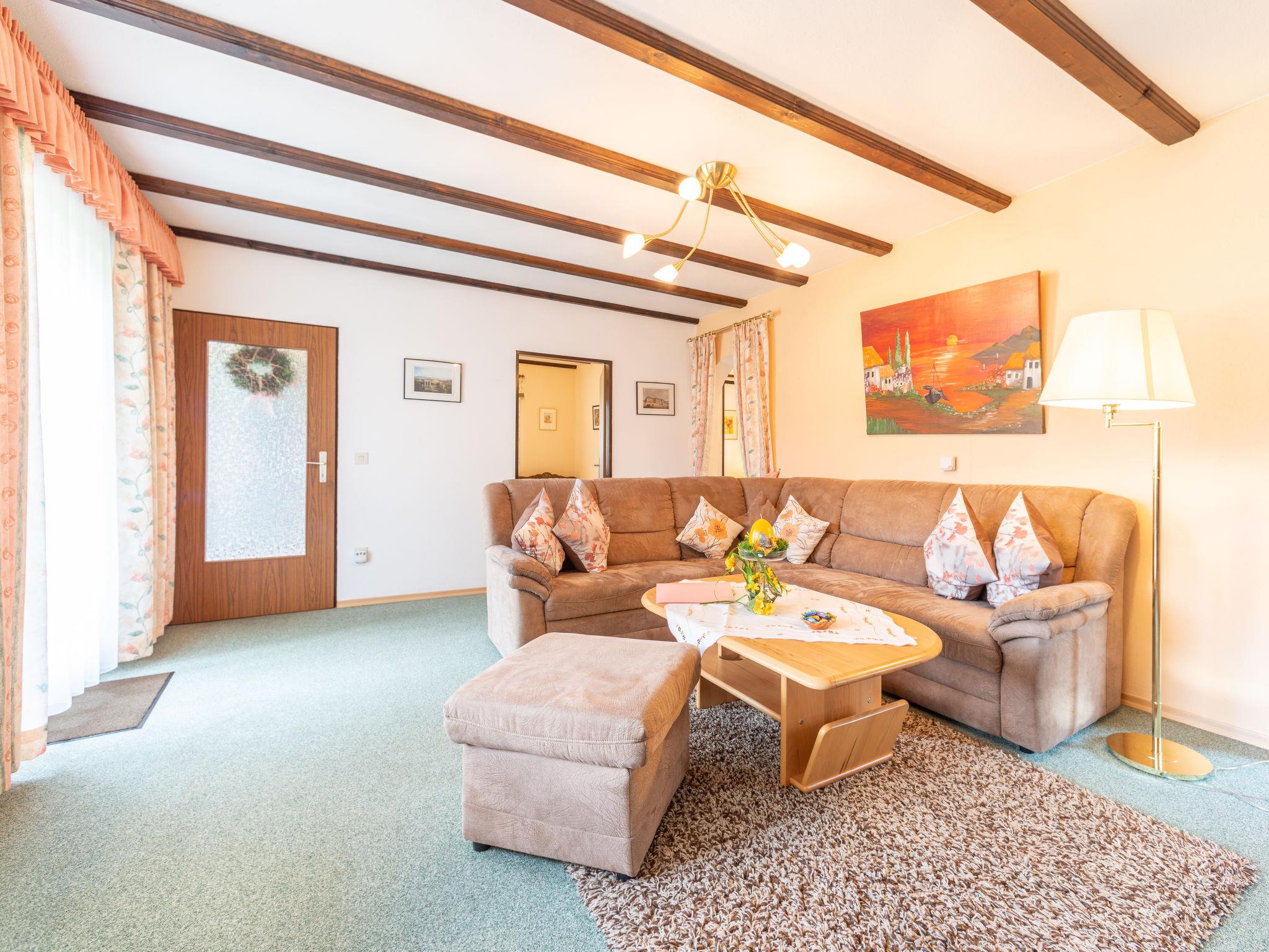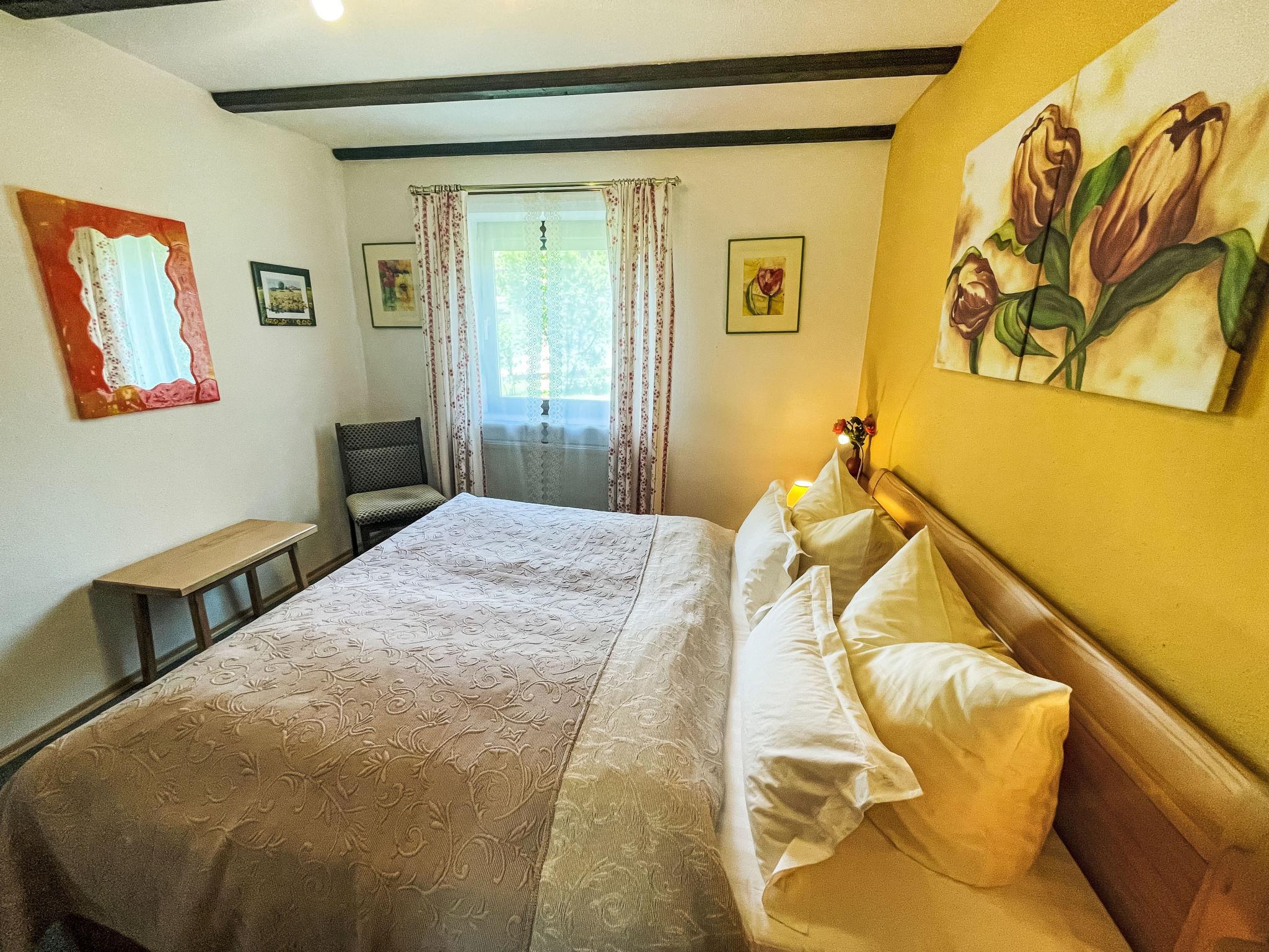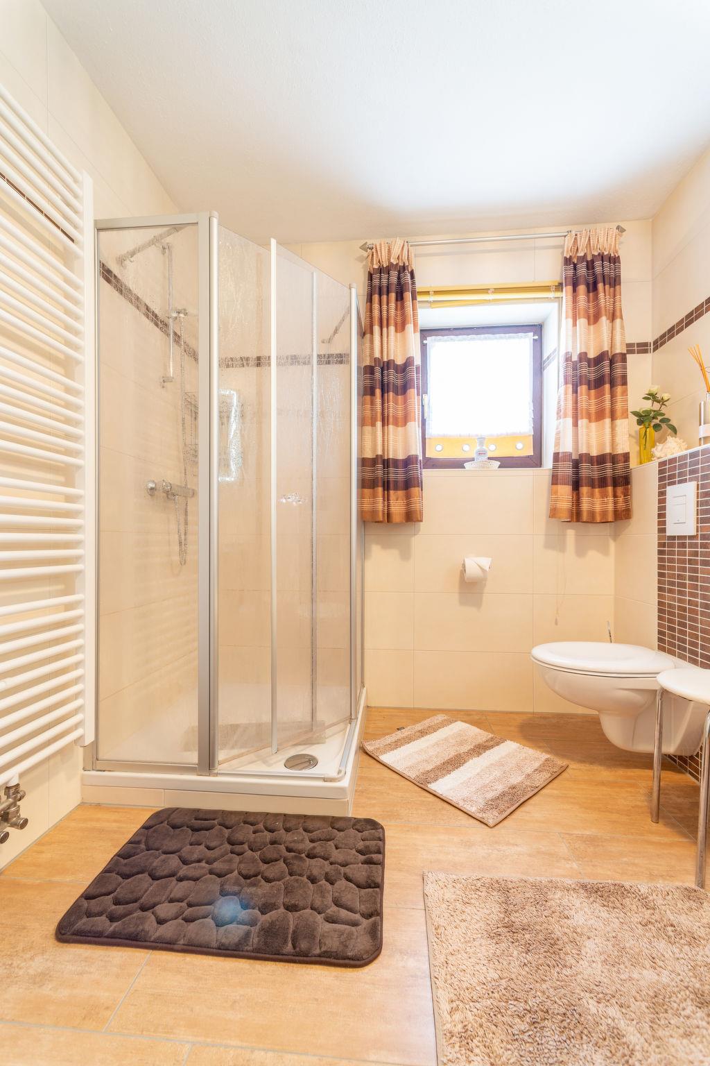 3-room apartment 75 m2, on the ground floor. Cosy furnishings: living room 35 m2 with satellite TV (flat screen), hi-fi system. Exit to the garden, to the terrace. 1 room 13 m2 with 1 double bed (180 cm, length 200 cm). 1 room 9 m2 with 2 beds (90 cm, length 200 cm). Open kitchen 9 m2 (4 hot plates, oven, dishwasher, toaster, kettle, microwave, electric coffee machine) with dining nook. Shower/WC. Gas heating. Large terrace 20 m2 partly roofed, garden 250 m2. Terrace furniture, barbecue (portable), sitting area. Beautiful view of the mountains. Facilities: washing machine, iron, hair dryer. Internet (WiFi, free). Please note: non-smokers only. Private entrance, smoke alarm. Lake 150m away.