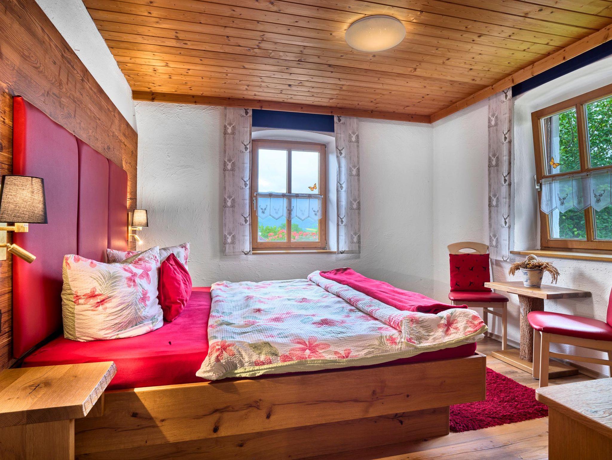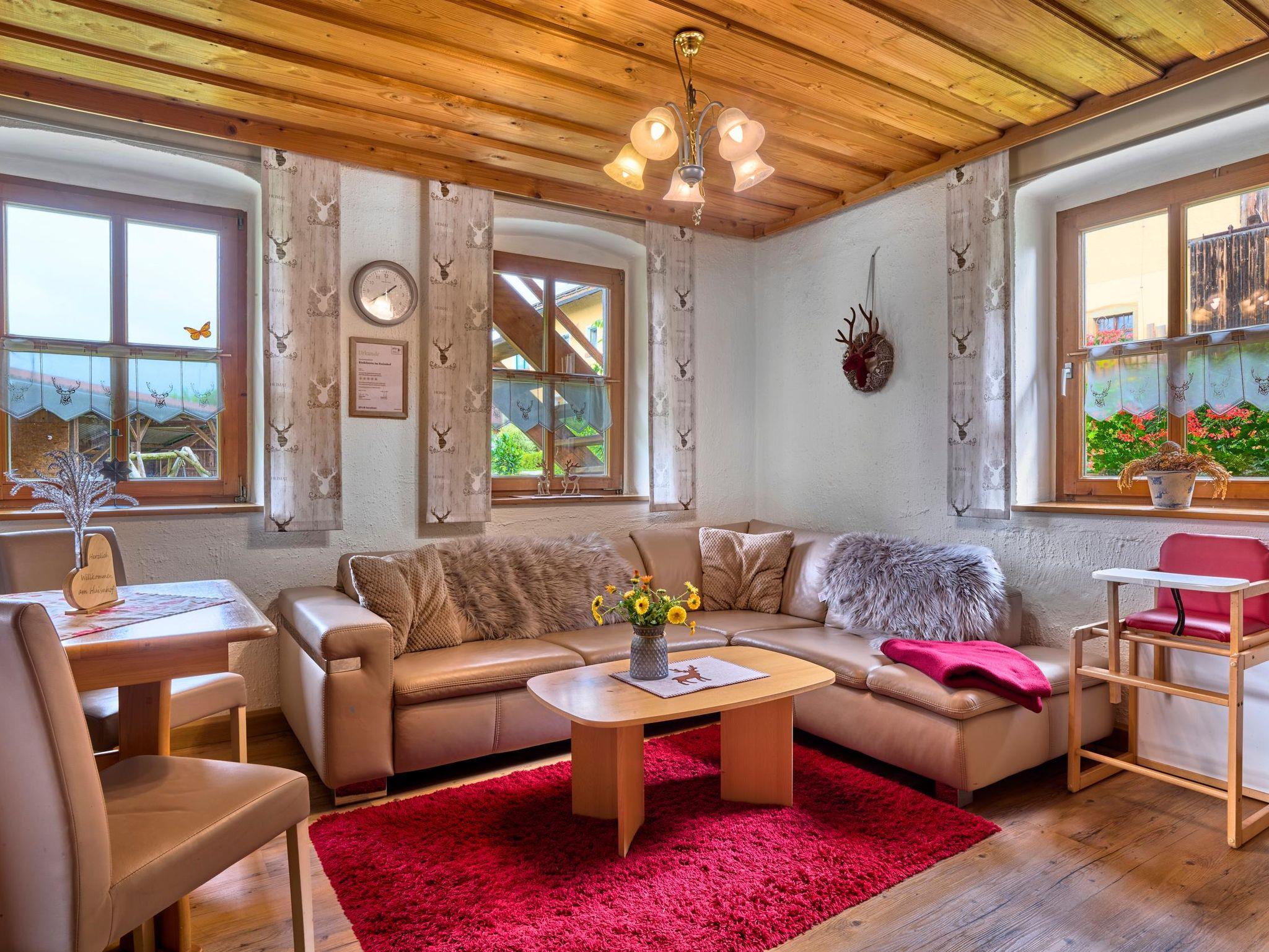 Die Ferienwohnung Riedelstein ist 65 qm groß für bis zu 4 Personen geeignet. Sie verfügt über zwei schöne Schlafzimmermit jeweils einem bequemen Doppelbett. Das Wohnzimmer mit Sat-TV, großer Couch und Kachelofen lädt zum Verweilen ein. Die Küche mit Spülmaschine, Mikrowelle, Toaster, Wasserkocher, Espressomaschine und Esstisch lässt keine Wünsche offen. Das Bad besteht aus Dusche und WC. Auf der schönen Terrasse können Sie die Sonne und Aussicht genießen. Babygerechte Ausstattung möglich. Frühstücksbuffet gegen Aufpreis möglich. Tischtennisraum mit großem Fußballkicker, große Liegewiese mit Liegen und Grill und ein separater Waschraum mit Waschmaschine und Trockner stehen unseren Gästen zur Verfügung. Kostenloses Reiten am Hof und auf Wunsch Kinderbetreuung. Separates Kinderspielzimmer, Aufenthaltsraum, eigener schattiger Kinderspielplatz mit Baumhaus, großem Trampolin und Lagerfeuerstelle.