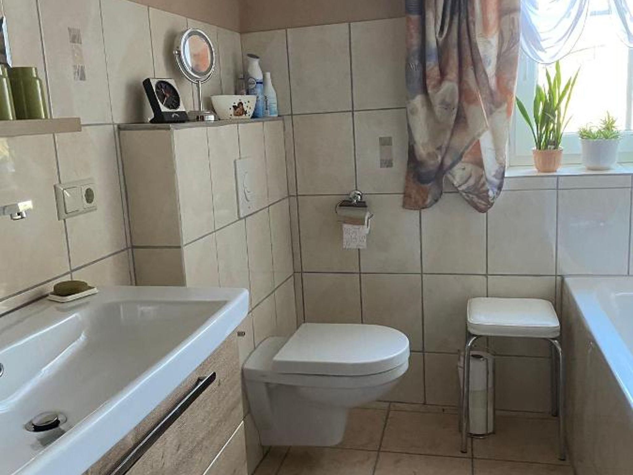 Das Badezimmer verfügt über eine Badewanne mit Duschmöglichkeit