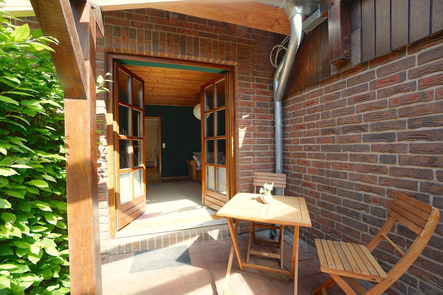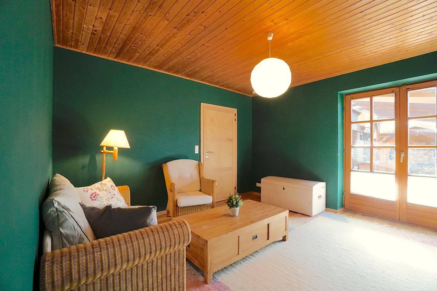 Das Wohnzimmer in dem beruhigen Grünton lädt zum Entspannen und Verweilen ein. Von hier aus gelangt man auf die kleine, windgeschützte Terrasse.