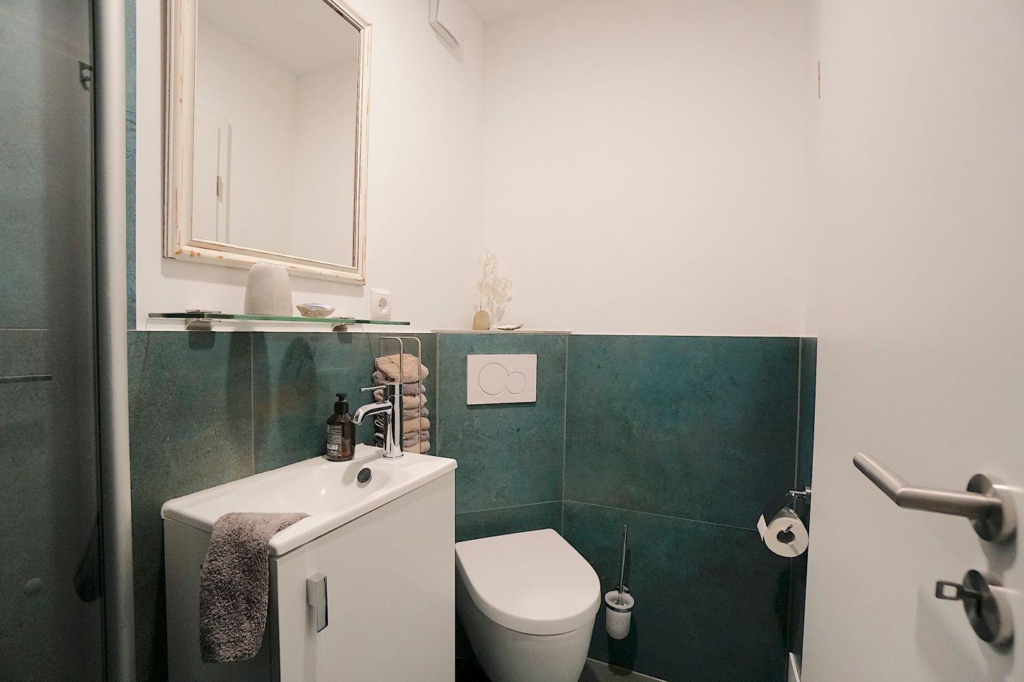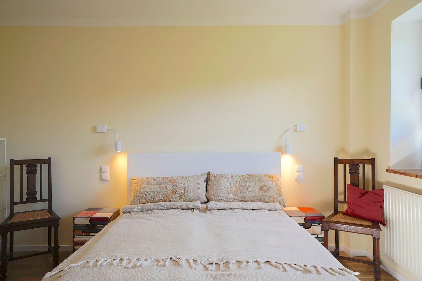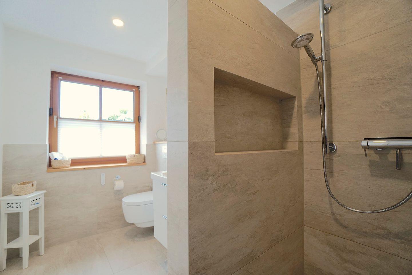 Das Schlafzimmer liegt zum ruhigen Garten nach hinten hinaus, direkt daran angeschlossen befindet sich das neue und sehr moderne Duschbad mit jeglichem Komfort und bodengleicher Dusche.