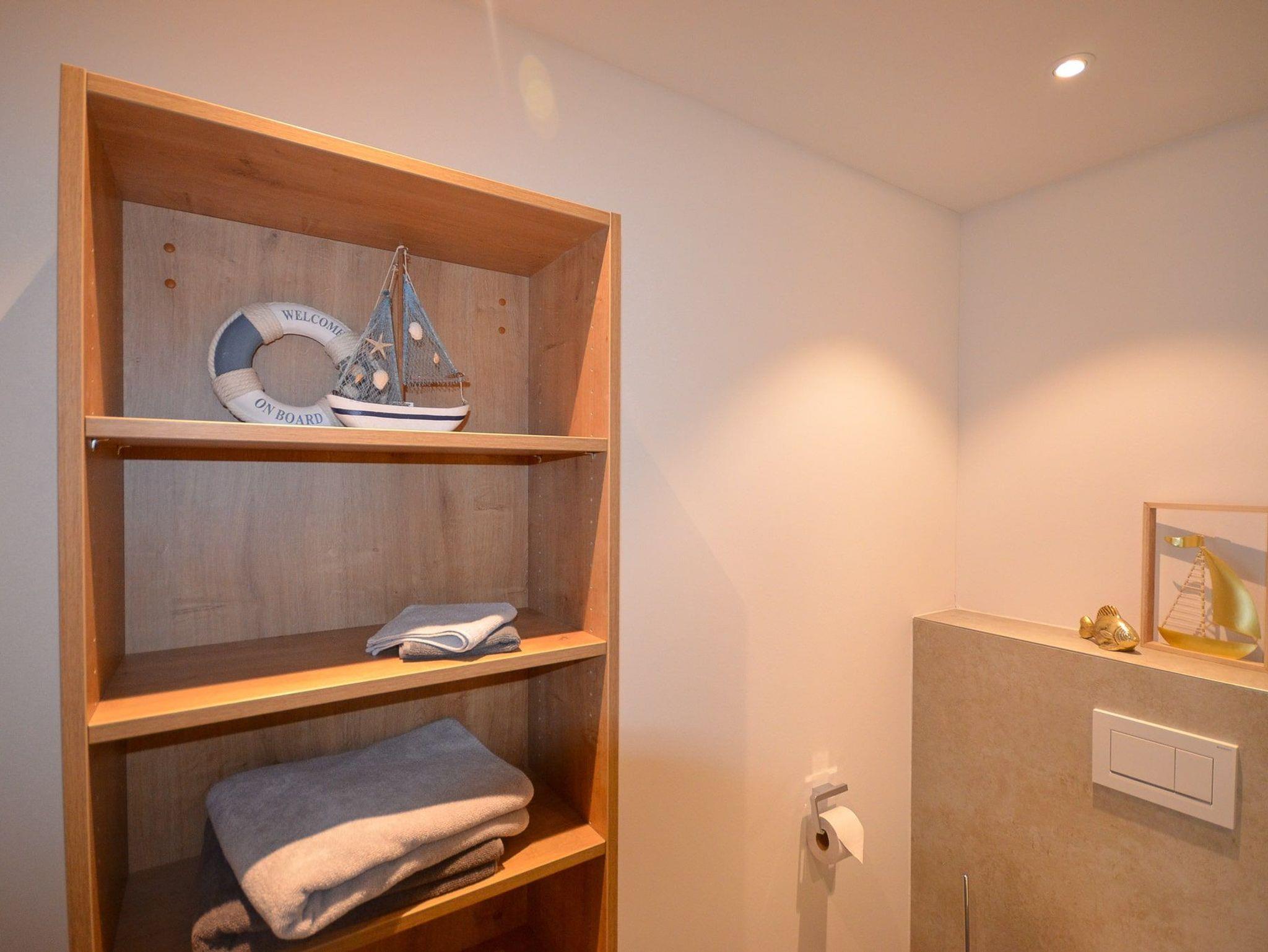 Das Bad hat eine ebenerdige, verglaste Dusche (140 x 100 cm) mit Regendusche und Handbrause, einen Waschtisch, einen Handtuchheizkörper und ein WC sowie ausreichende Ablageflächen und ein Einbauradio.