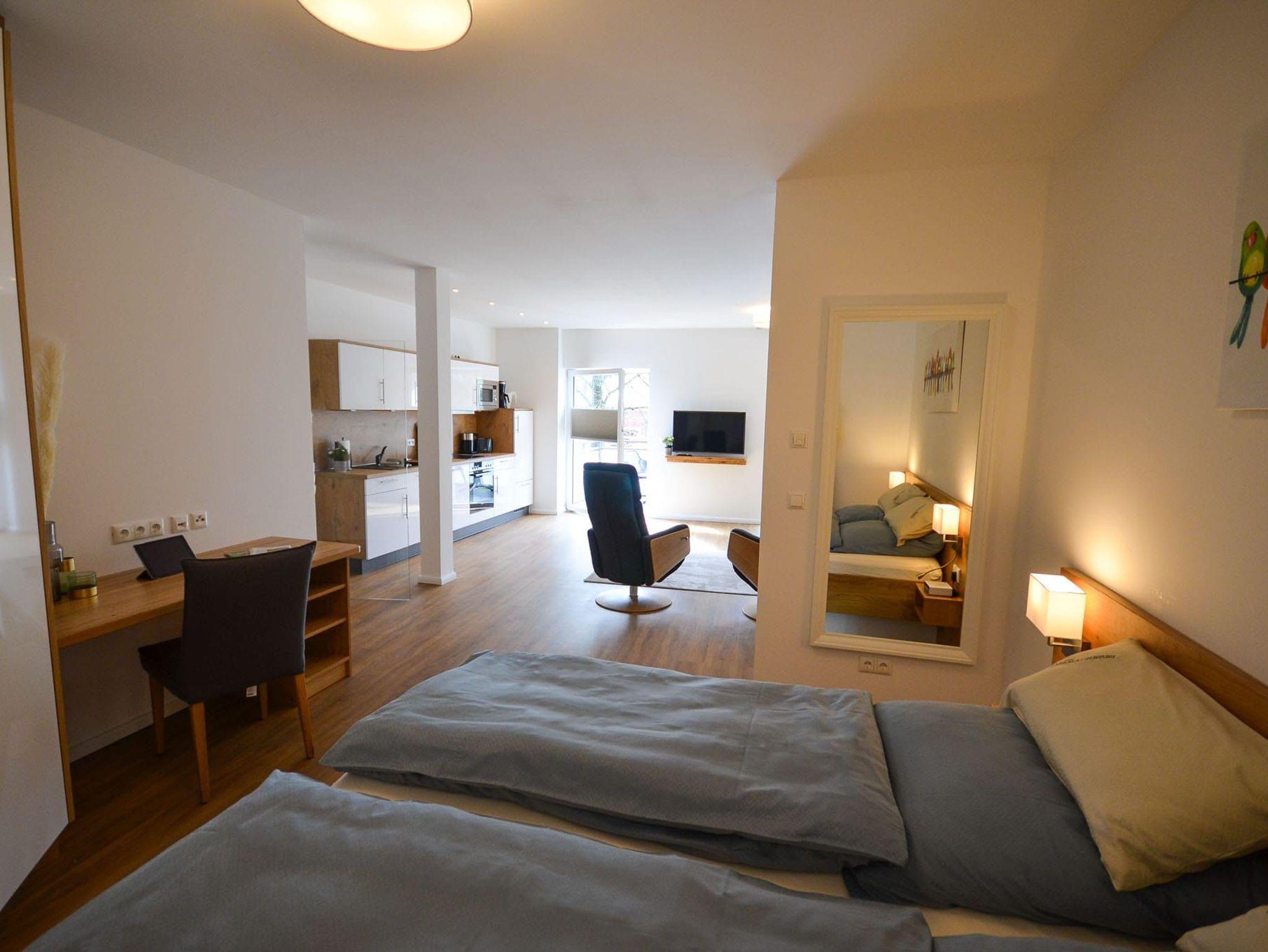 Das Appartement mit Balkon befindet sich im 1. OG ruhig zum Innenhof gelegen. Die Wohnung ist bequem mit dem Fahrstuhl zu erreichen. Sie ist ca. 65 m² groß und für max. 2 Personen und 1 Kind im Alter von bis drei Jahren buchbar.