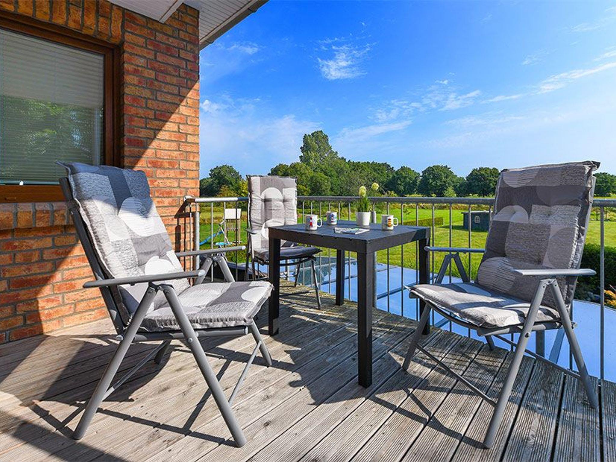 Genießen Sie gemütliche Stunden auf dem möblierten Balkon mit Blick auf den schönen Garten und auf die umliegenden Felder. Hier werden Sie einen erholsamen und schönen Urlaub verbringen und gelegentlich ein paar Rehe beobachten können!