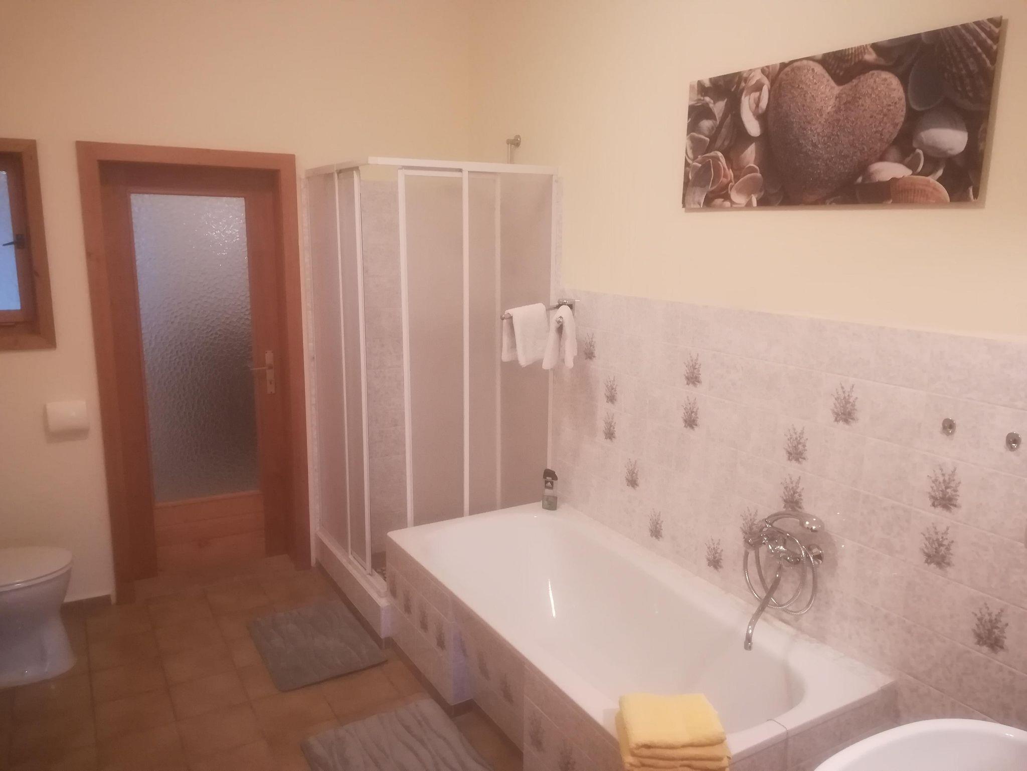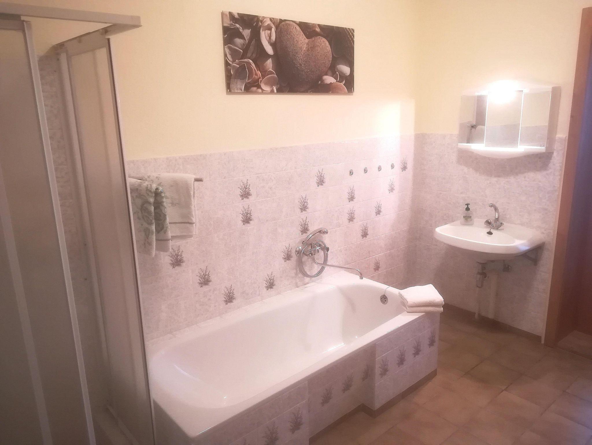 Das Bad mit Toilette ist wahlweise mit Dusche oder Wanne nutzbar und im