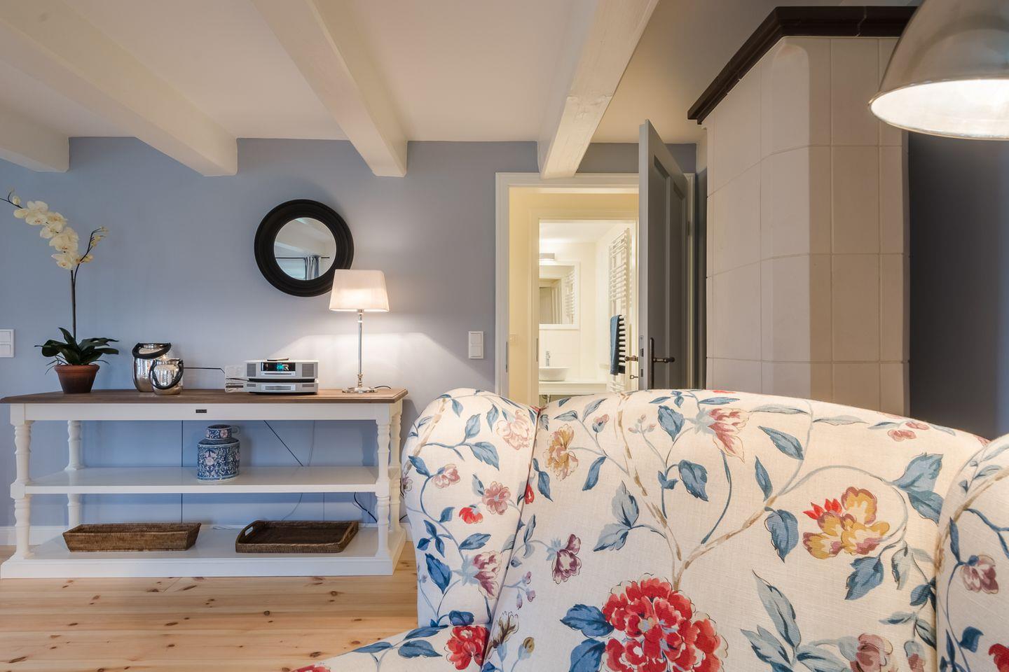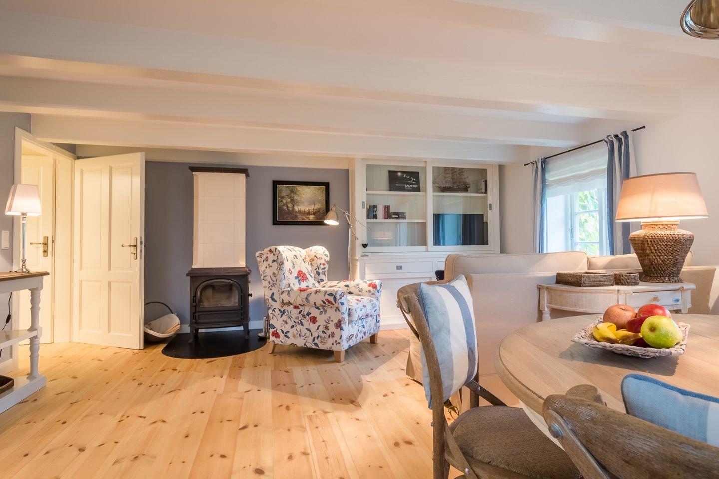 Diese stilvolle Ferienwohnung gliedert sich auf in einen großzügigen Wohn-/ Essraum mit Kaminofen, 1 großes Doppelschlafzimmer mit Verdunklungs-Vorhängen, verstellbaren Lattenrosten, ein Duschbad mit WC und Fußbodenheizung, eine Küche mit Ceranfeld, Backofen, Kaffeemaschine, Toaster, Wasserkocher, sowie eine Süd-West Terrasse mit Bestuhlung.